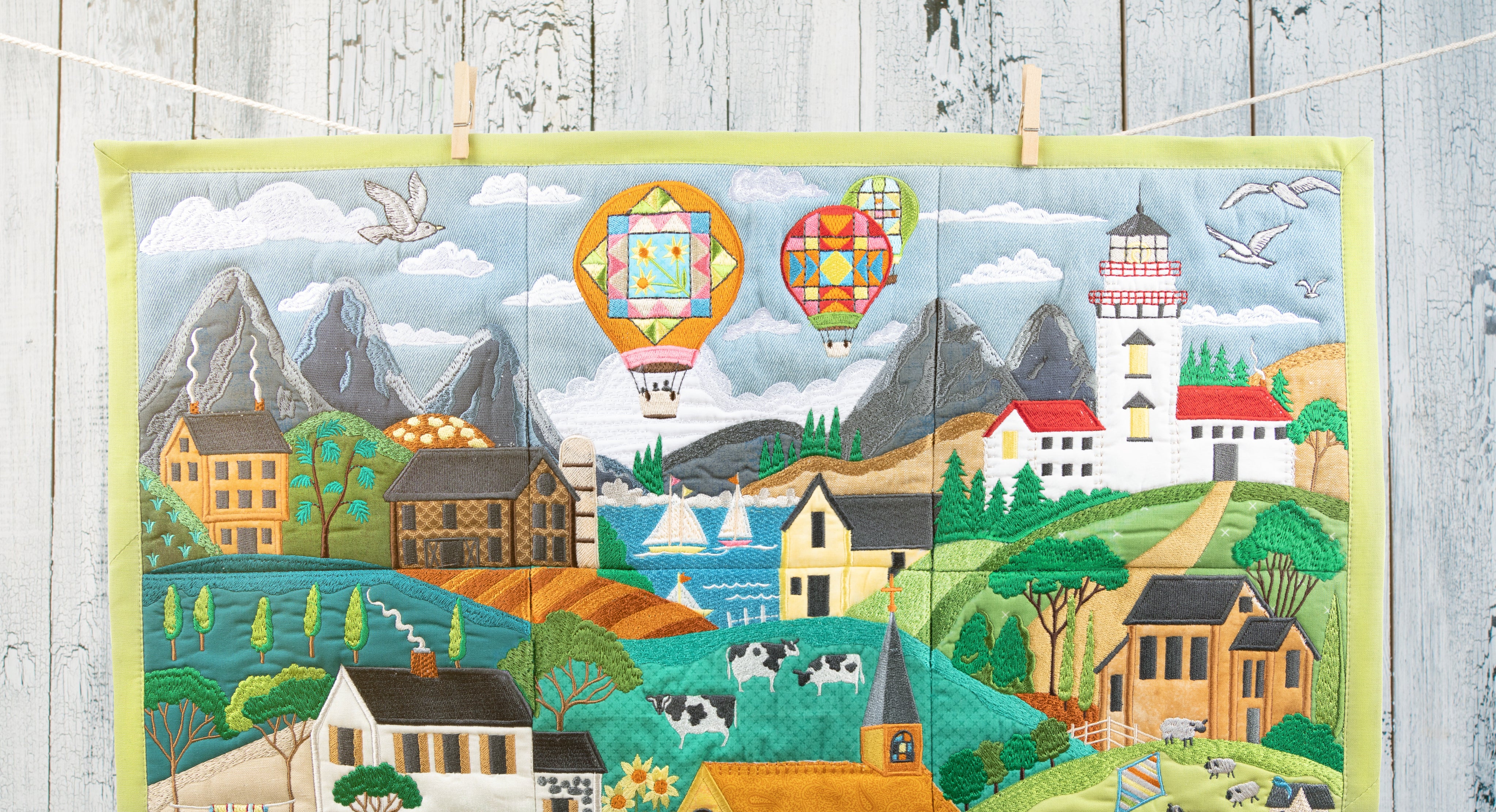 Take a trip back to the simpler days with this charming Special Edition! Americana Homestead brings back the peace and simplicity of horse drawn carriages and rolling hills of farm-fresh crops. Beautiful barn quilts are sprinkled across the town's winding path in honor of traditional quilting practices while ornate, hot air balloons ascend into the skies. We've filled this scene with quaint quilting touches, like traditional blanket stitch finishes to lush, satin stitched appliqués. Incorporate a variety of fun fabrics like cotton or batik to more tactile materials such as burlap or washed denim for a countryside scene thats sure to stand out!