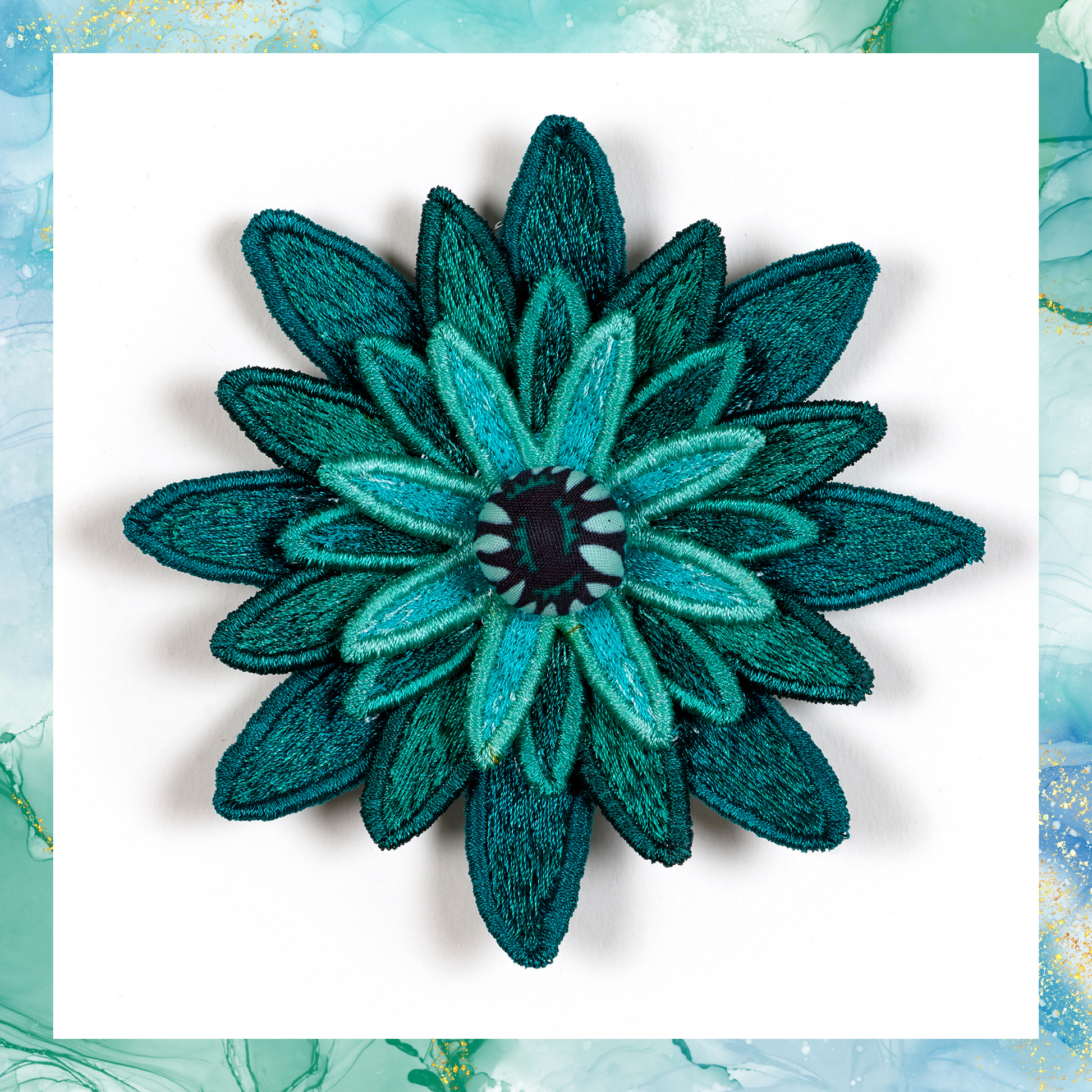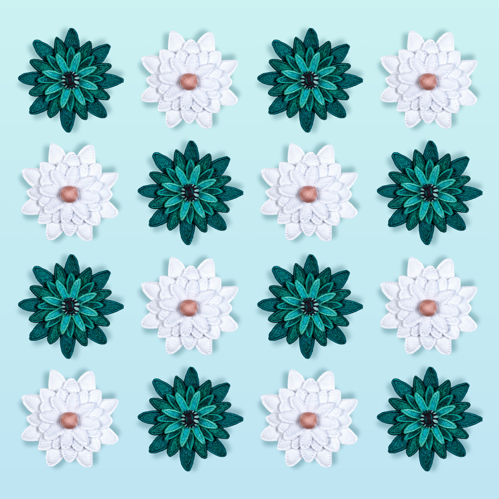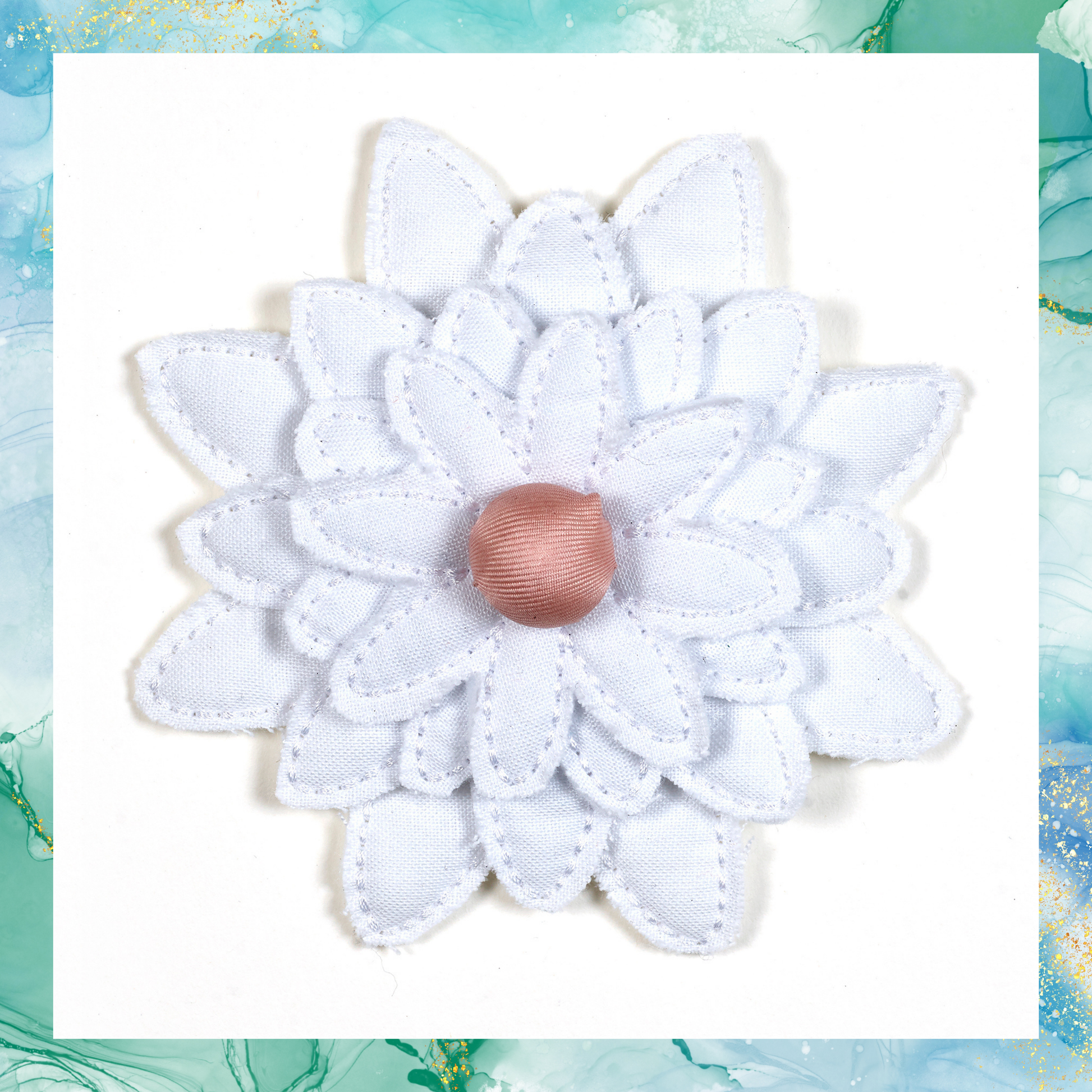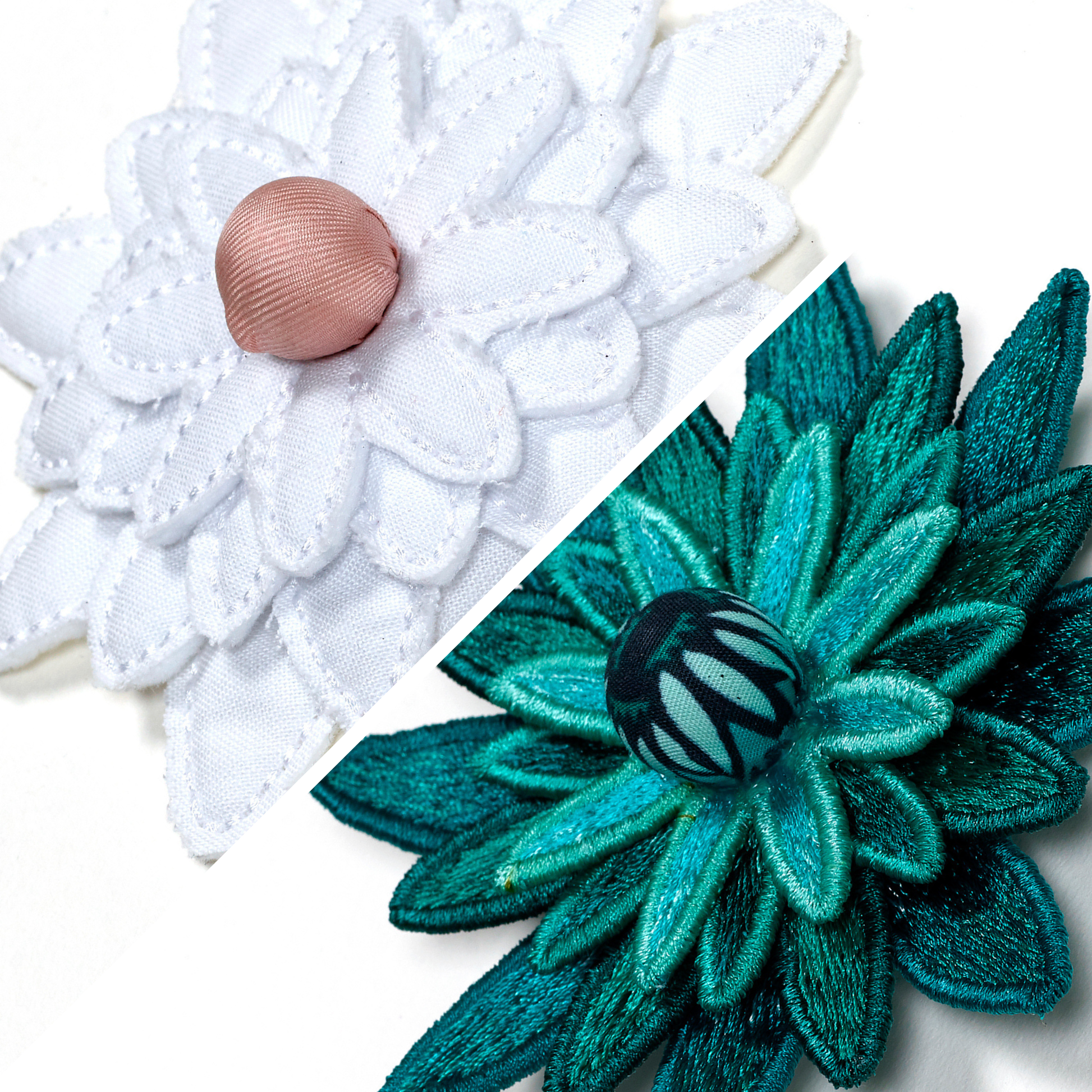 Get ready to bring blooming excitement into your next embroidery project with these Pom Pom Flower Blooms! Each of the bloom designs is created using multiple layers of freestanding petals that are then finished with an easy-to-make fabric pom pom. We have included two versions of these fun dimensional flowers: a simple and bold appliqué version and a fully-stitched version with hand-digitized shading in each petal.