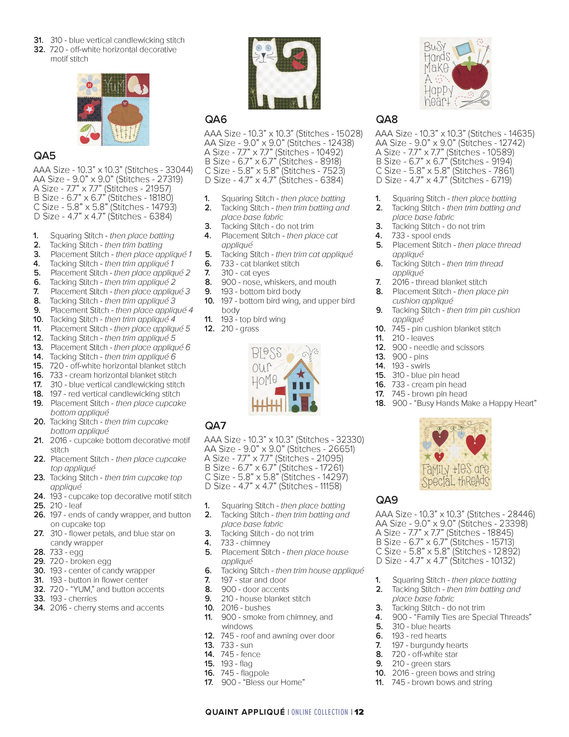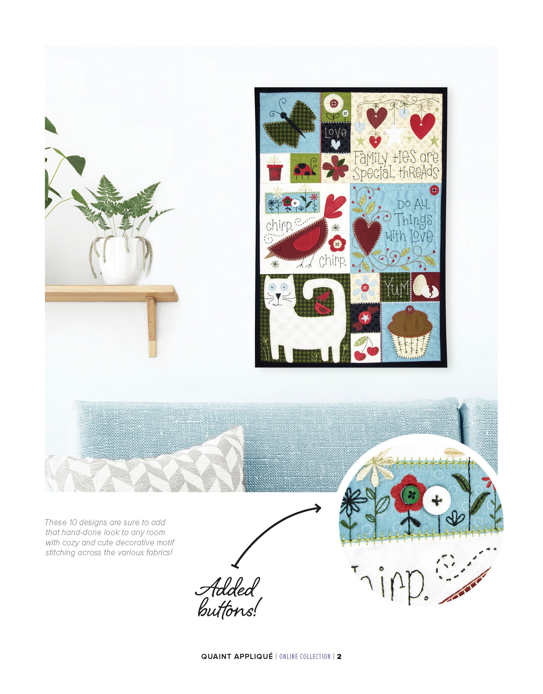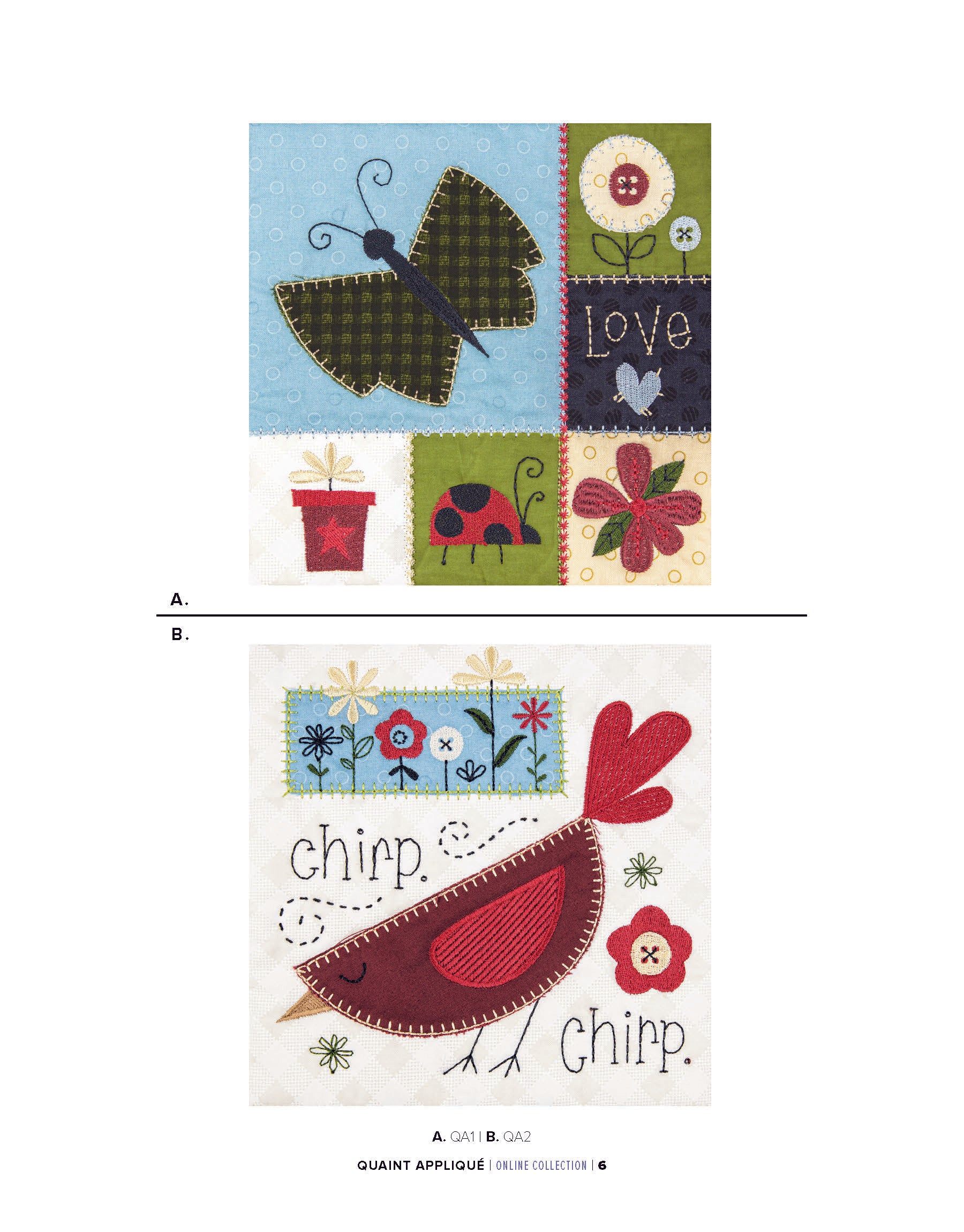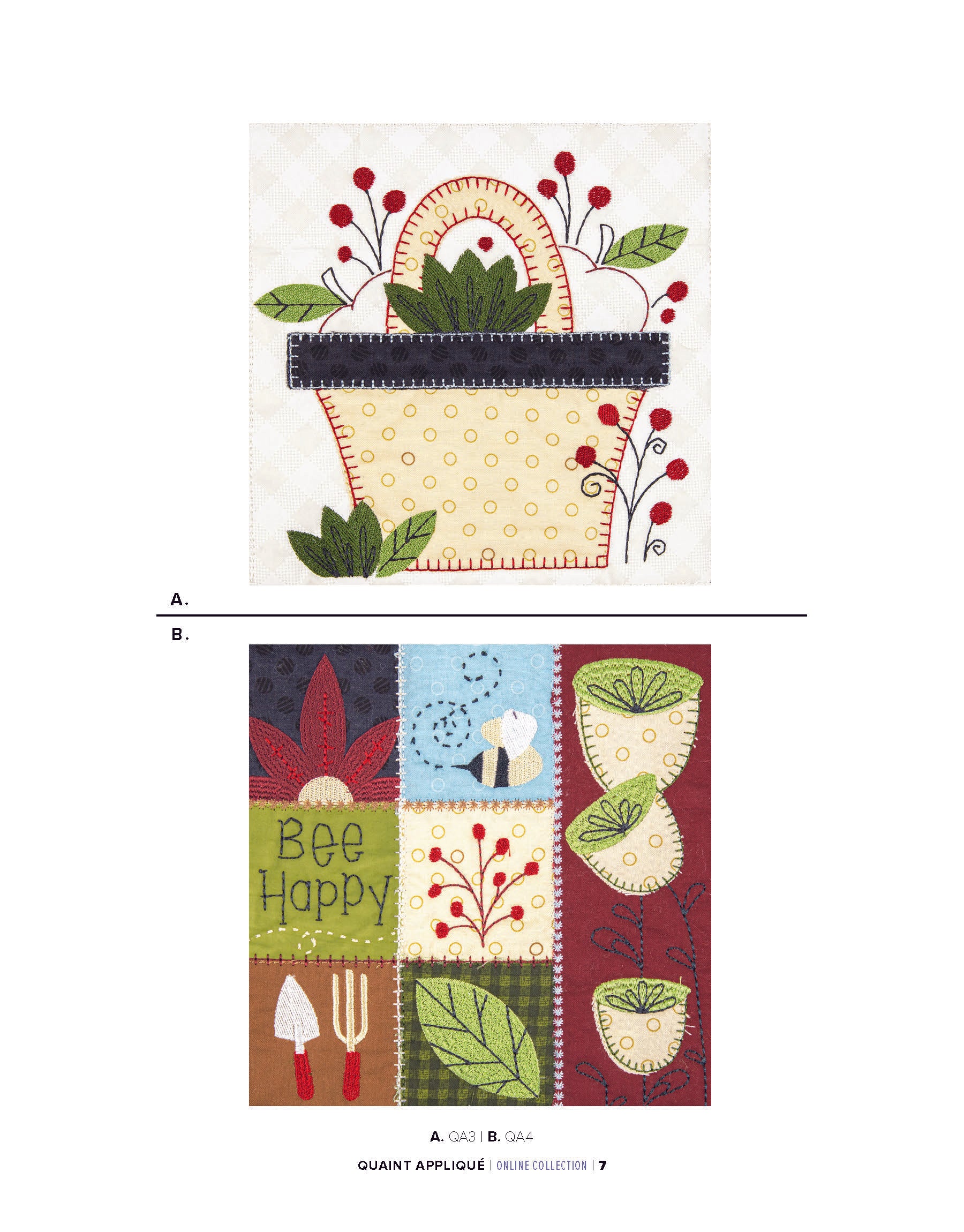 Immerse yourself in the enchanting world of quilting with our Quaint Appliqué collection, featuring 10 exquisite quilt blocks meticulously crafted using a combination of embroidery and appliqué techniques. The attention to detail is evident as contrasting embroidery threads are skillfully employed to highlight the intricate blanket and candlewick stitches, creating an endearing, hand-stitched aesthetic that will captivate any quilting enthusiast.
