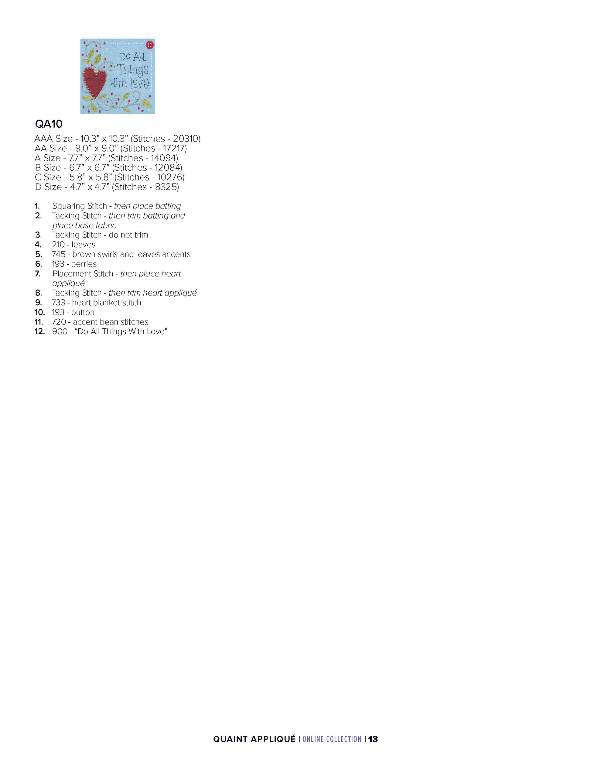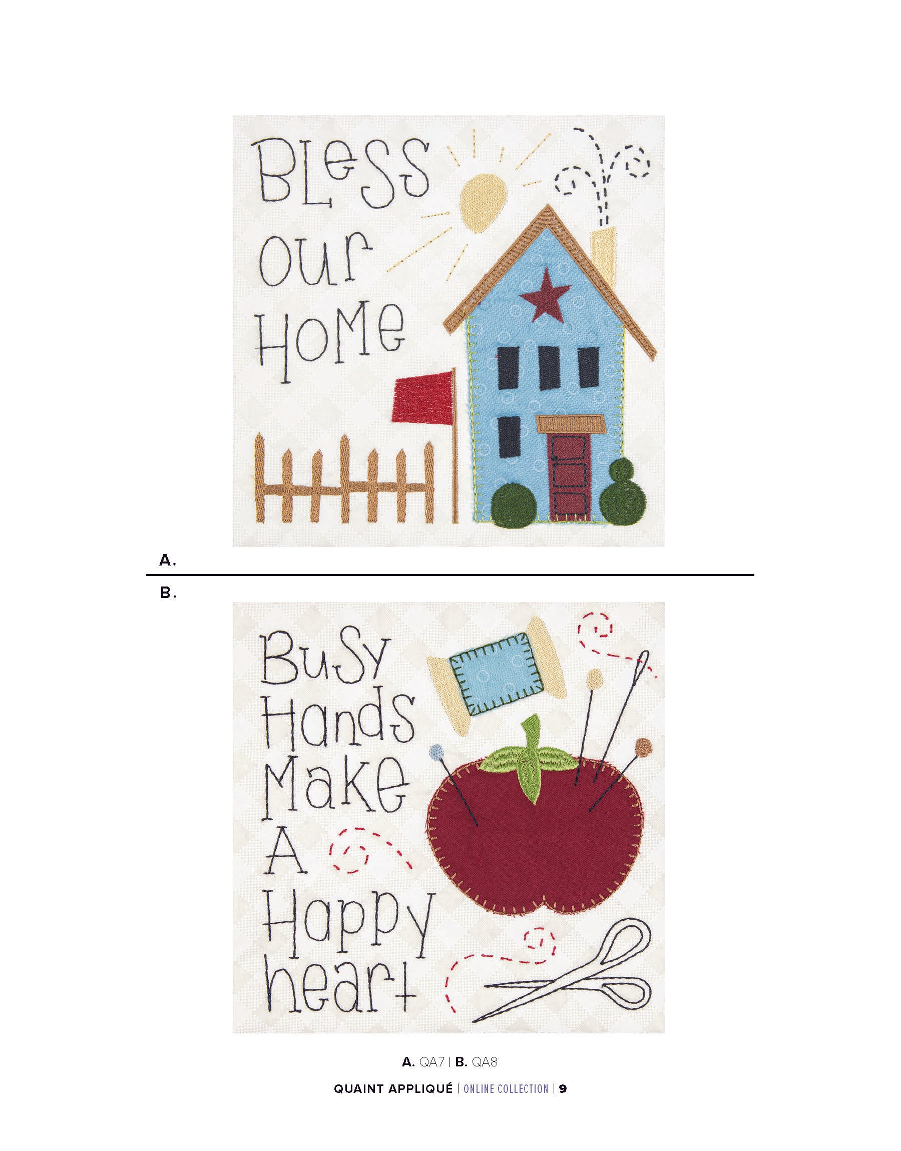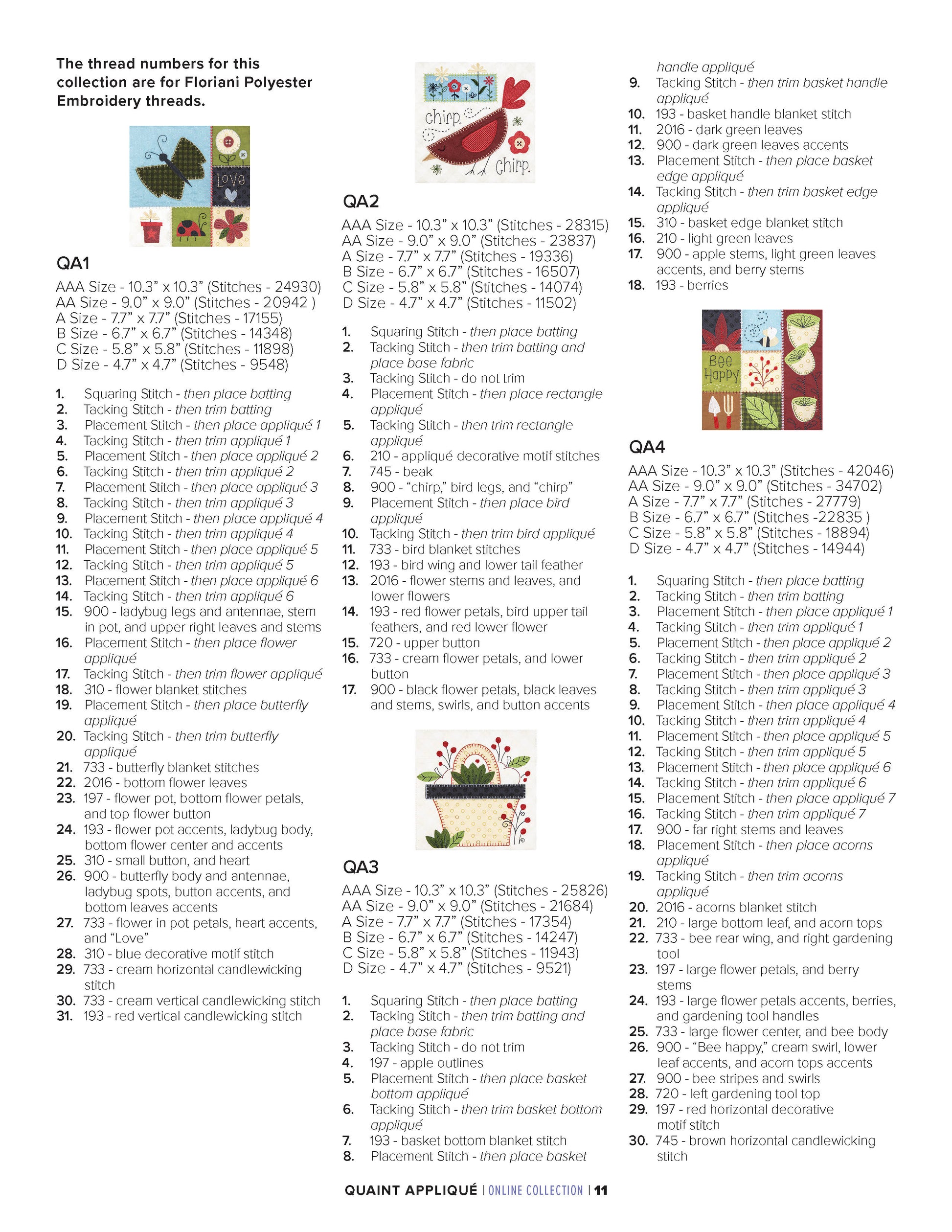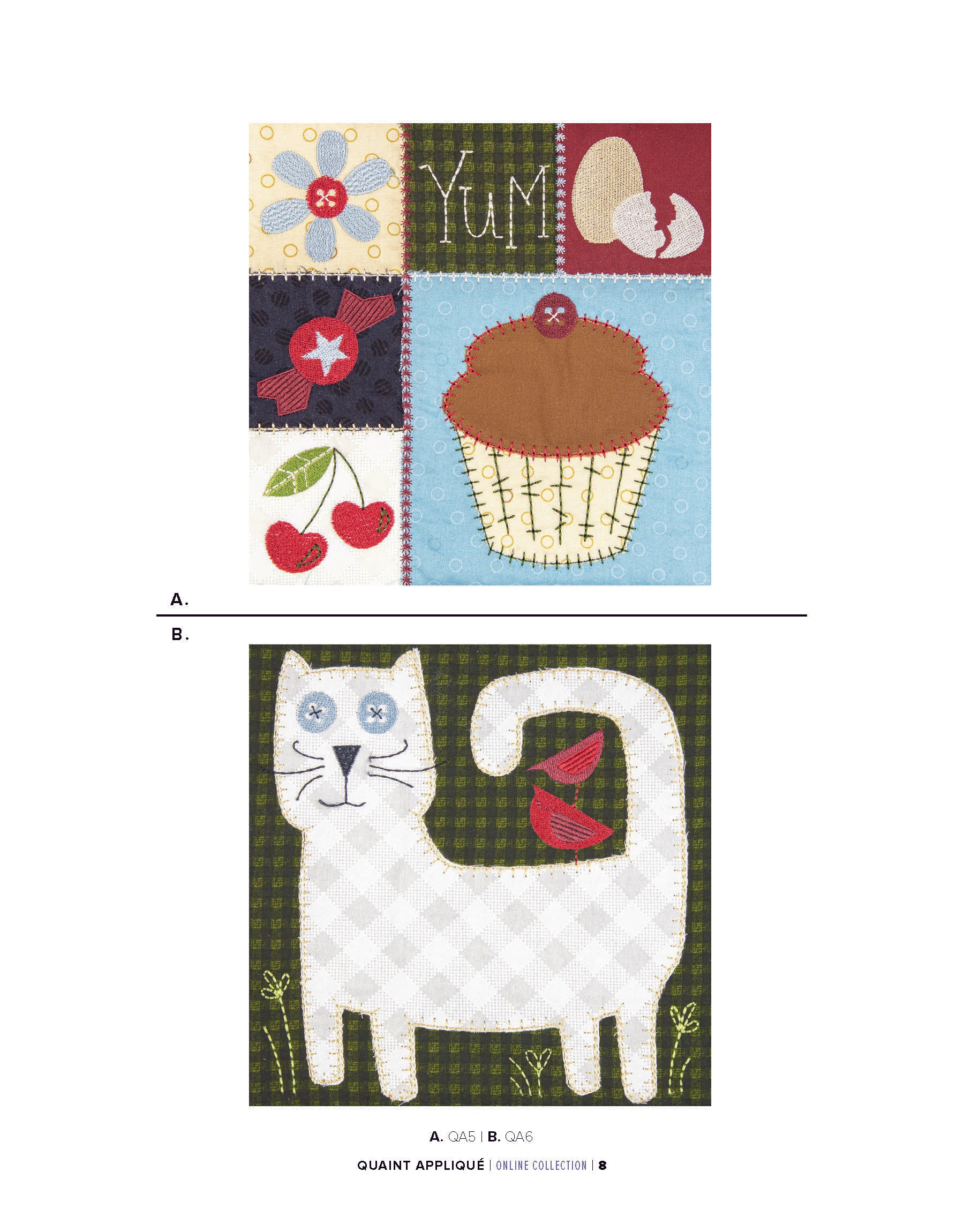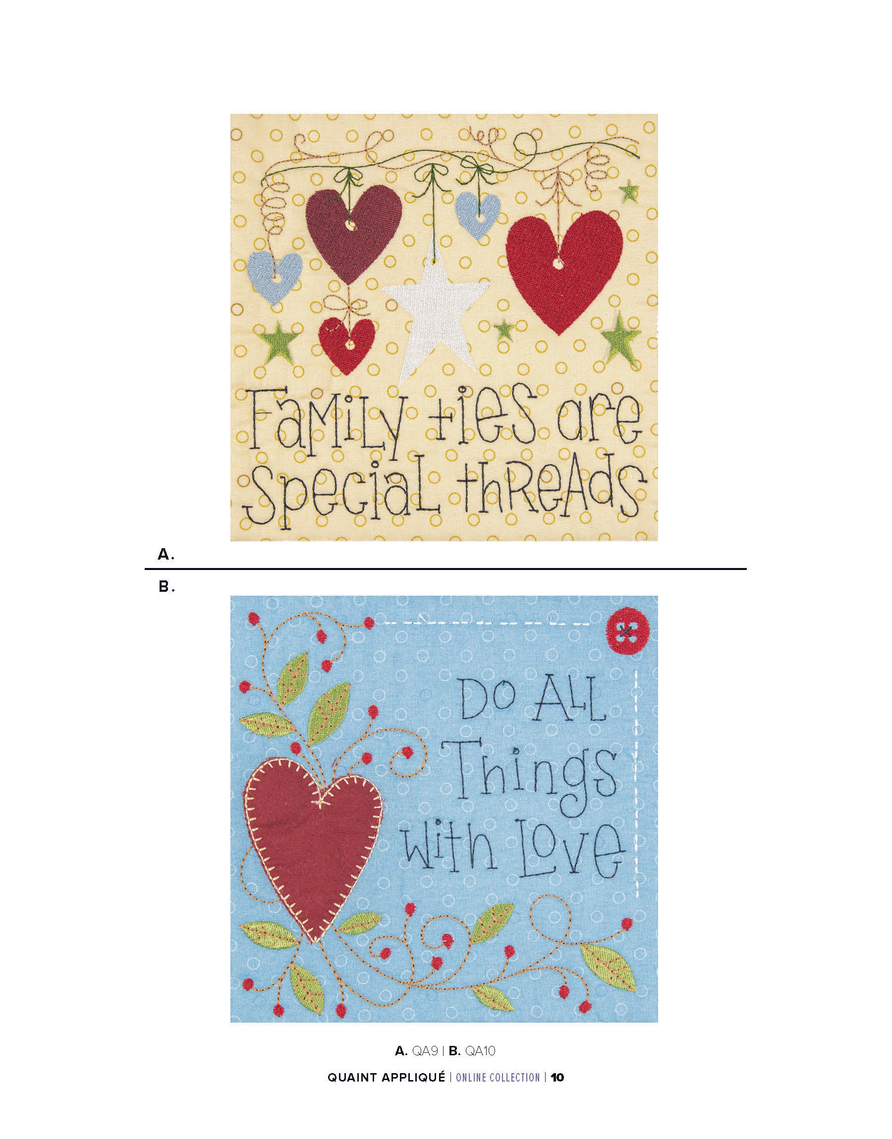 Immerse yourself in the enchanting world of quilting with our Quaint Appliqué collection, featuring 10 exquisite quilt blocks meticulously crafted using a combination of embroidery and appliqué techniques. The attention to detail is evident as contrasting embroidery threads are skillfully employed to highlight the intricate blanket and candlewick stitches, creating an endearing, hand-stitched aesthetic that will captivate any quilting enthusiast.