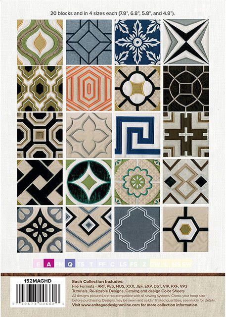 They say that if you give any trend or fad enough time and it will come back around. This has been true in recent years with fashion and home decorating. For example, you can’t go into any clothing store these days and not see lace designs or 70’s bohemian styles. For home decorating, the trend has been mid-century modern. We used that trend as the inspiration for our Mod Quilts collection. This collection has 20 designs that were inspired by wallpaper and rug prints from the 50’s and 60’s. When combined into a quilt, pillows or a table runner the designs are nostalgic and current at the same time. 20 blocks and in 4 sizes each (7.8”, 6.8”, 5.8”, and 4.8”).
