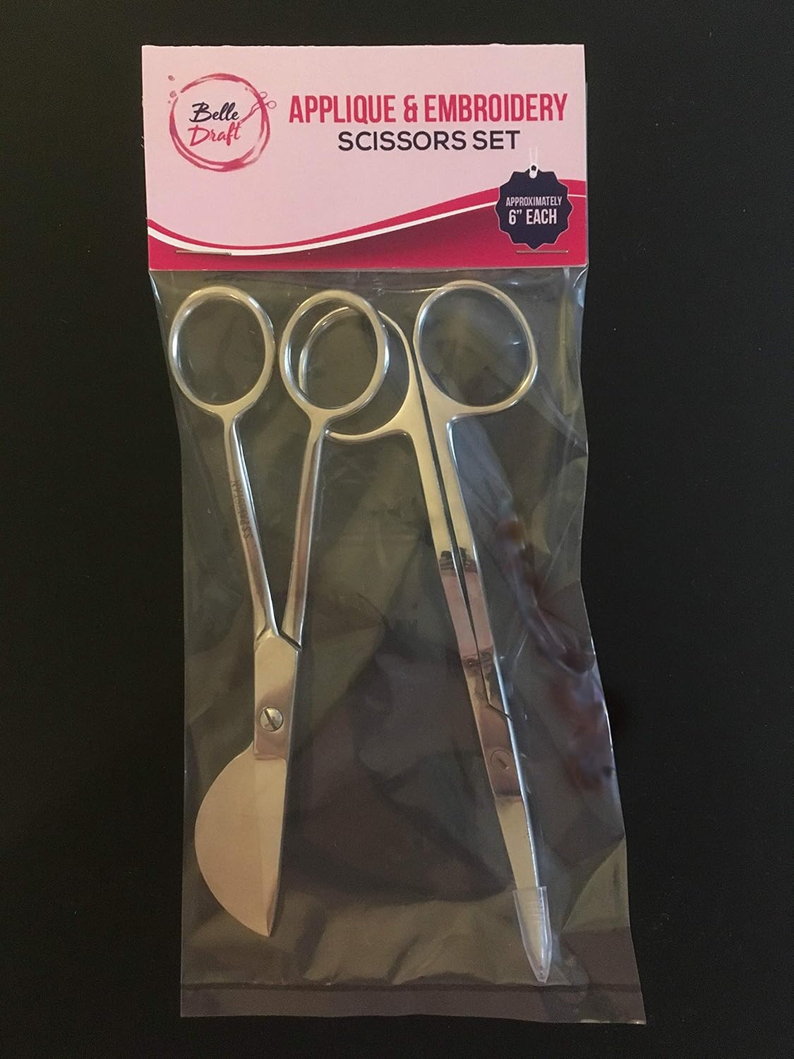Bundle includes 6 inch stainless steel applique duckbill scissors blade with offset handle & 6 inch machine embroidery double curved scissors.