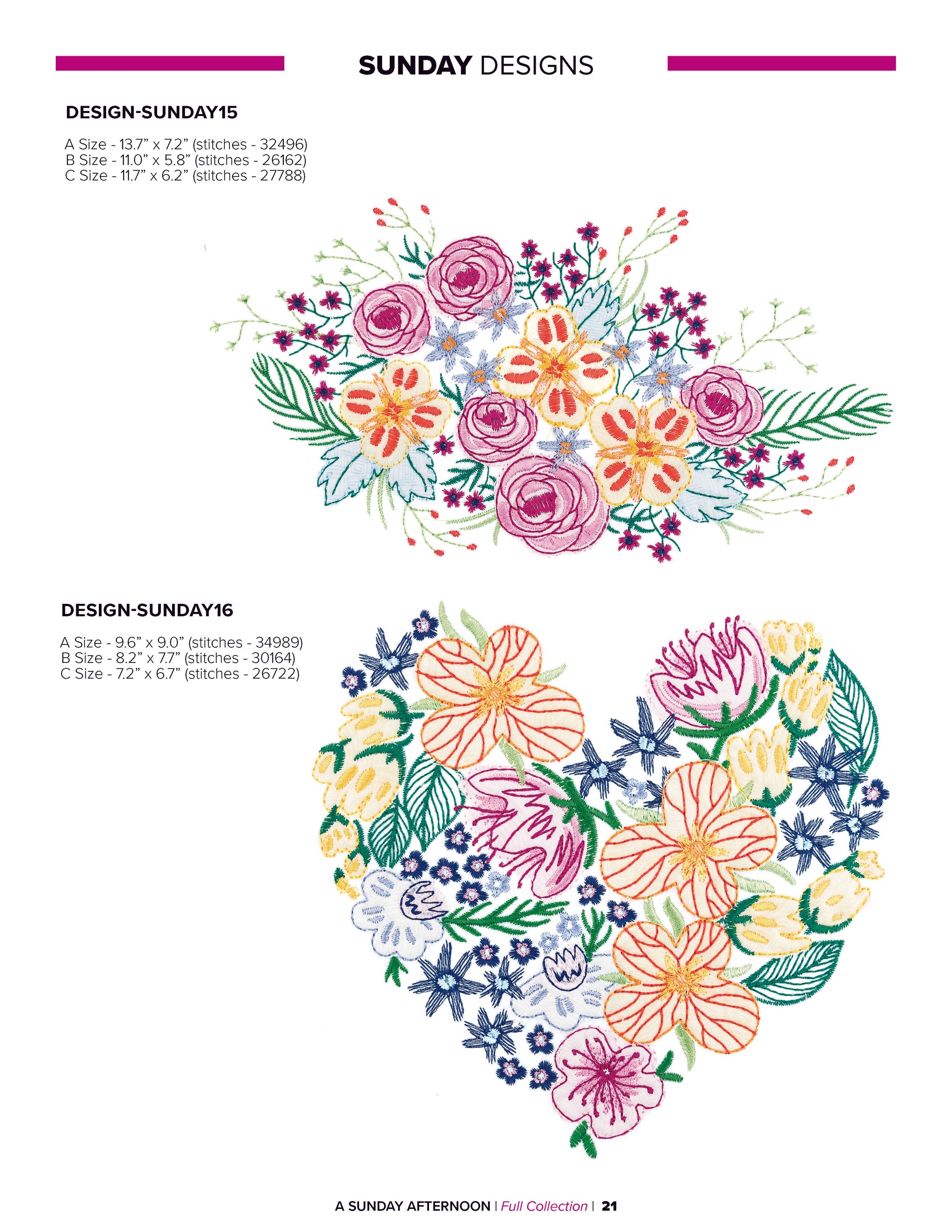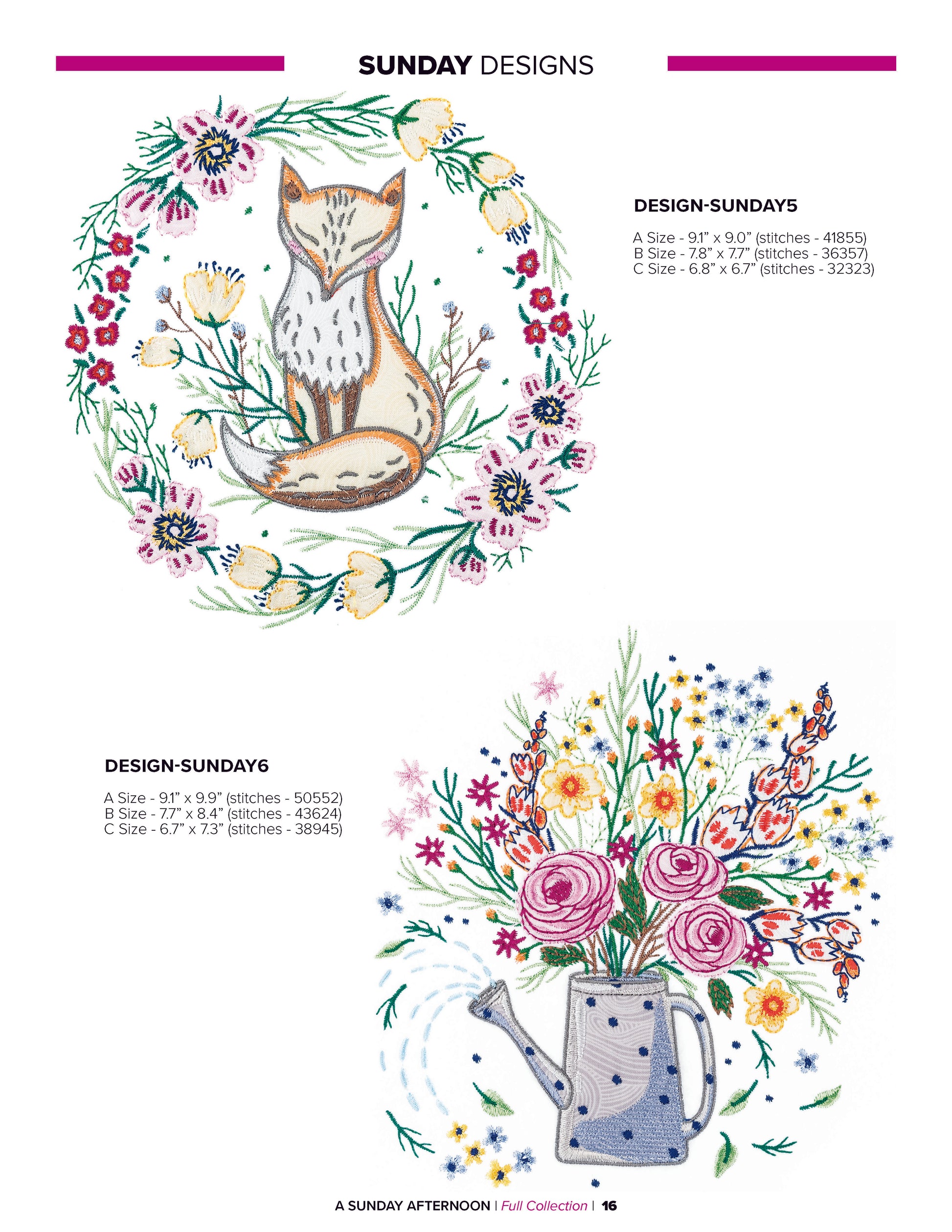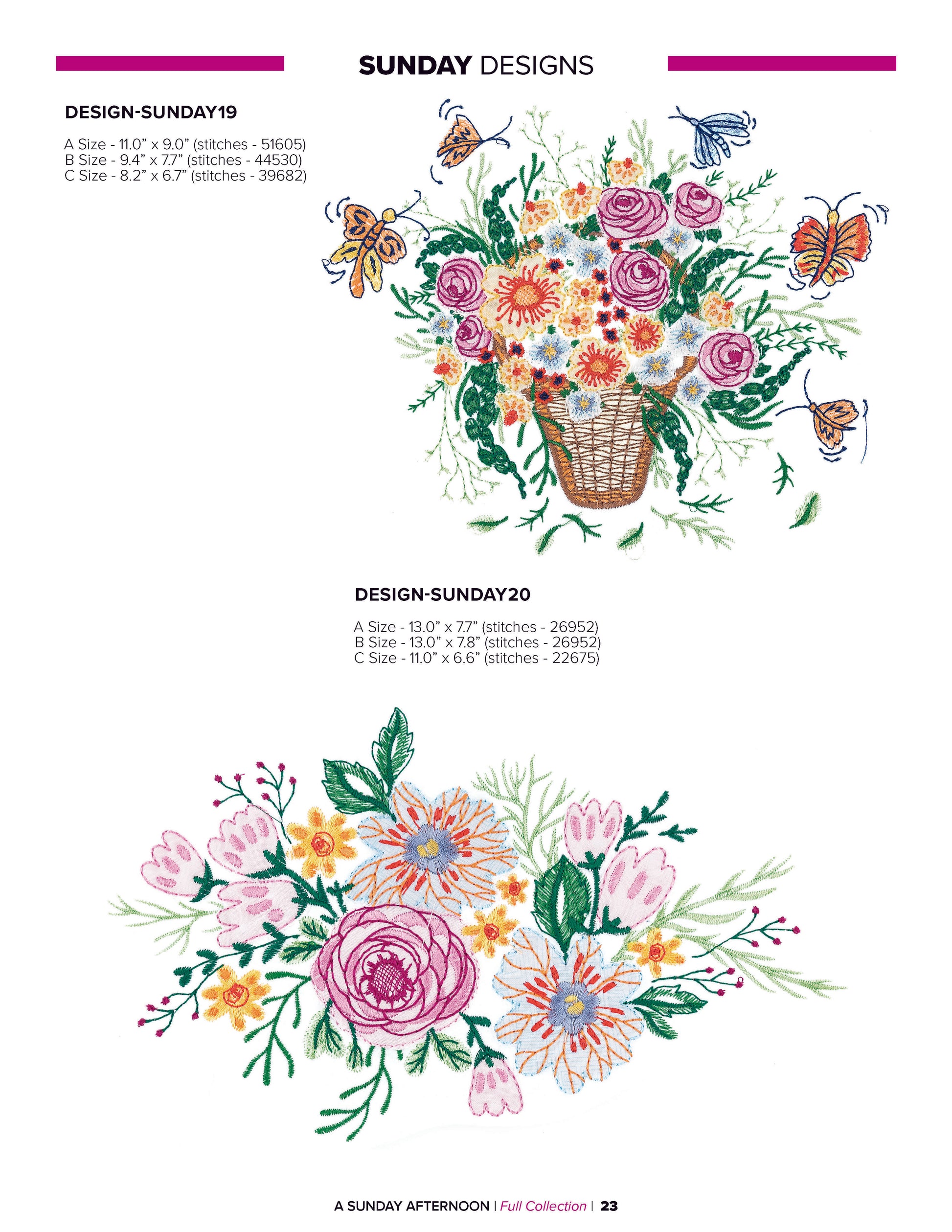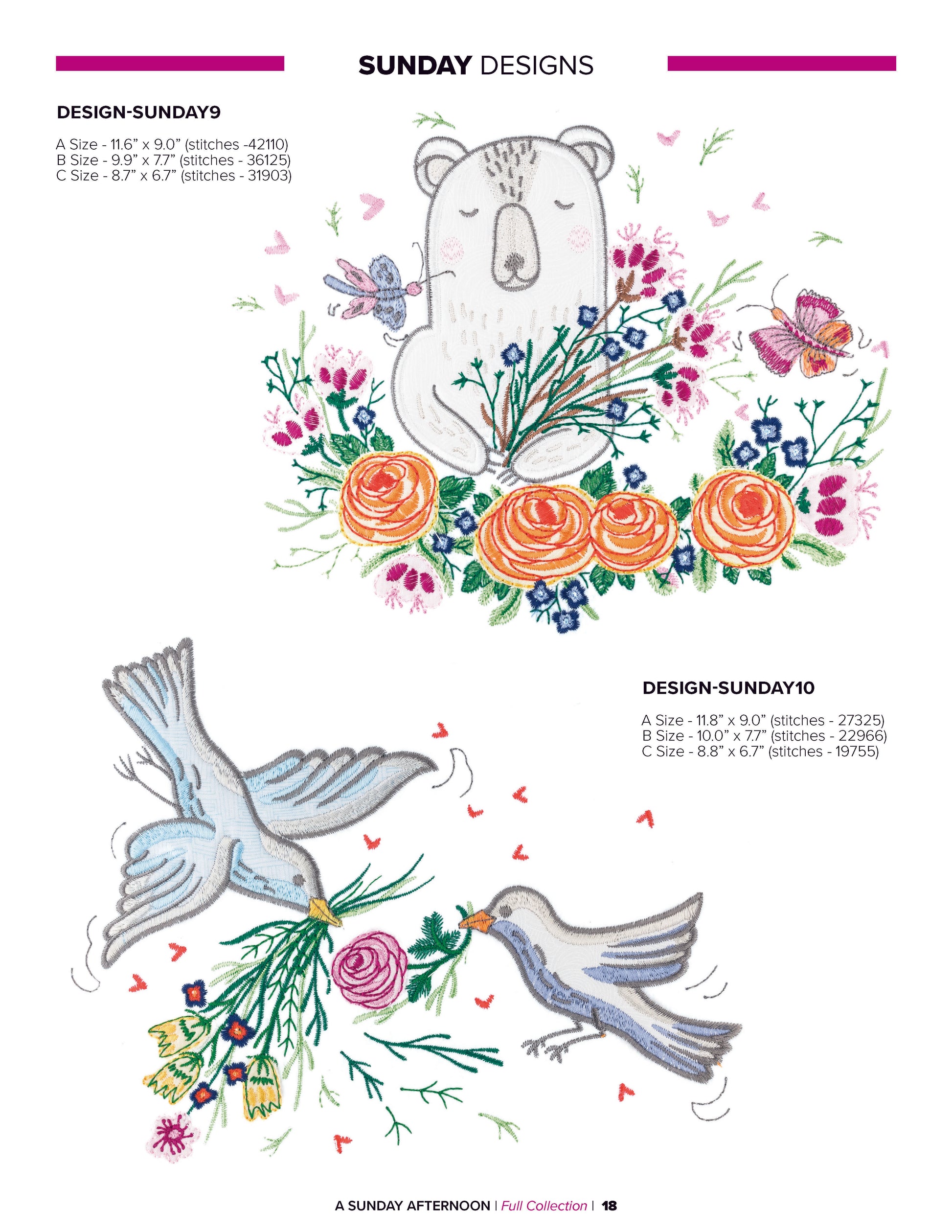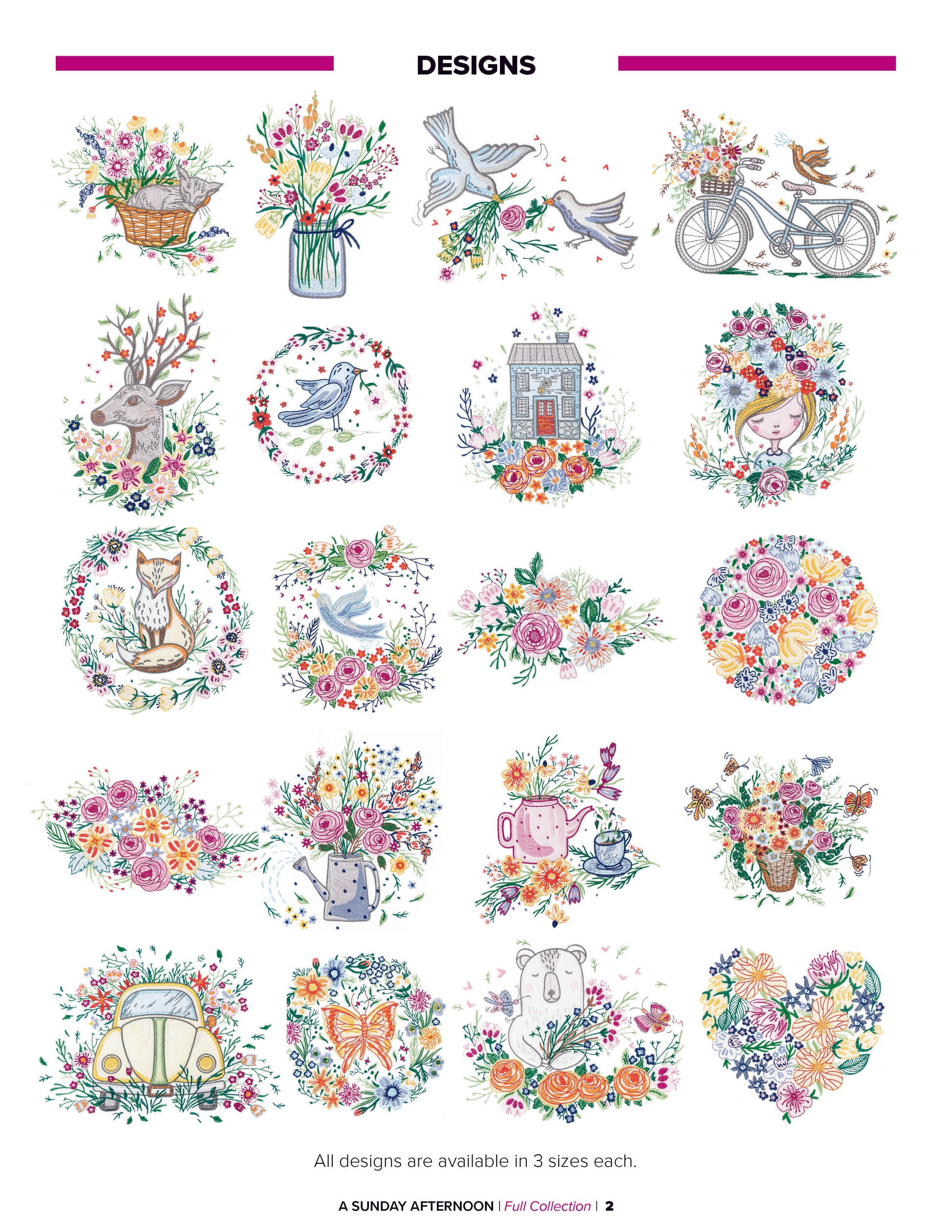 Whether you're an experienced embroiderer or just starting out, A Sunday Afternoon Collection offers a range of designs and techniques to suit your preferences and skill level. Let these designs transport you to a world of tranquility and serenity, where Sundays are reserved for enjoying the company of loved ones, savoring simple pleasures, and embracing the art of embroidery.