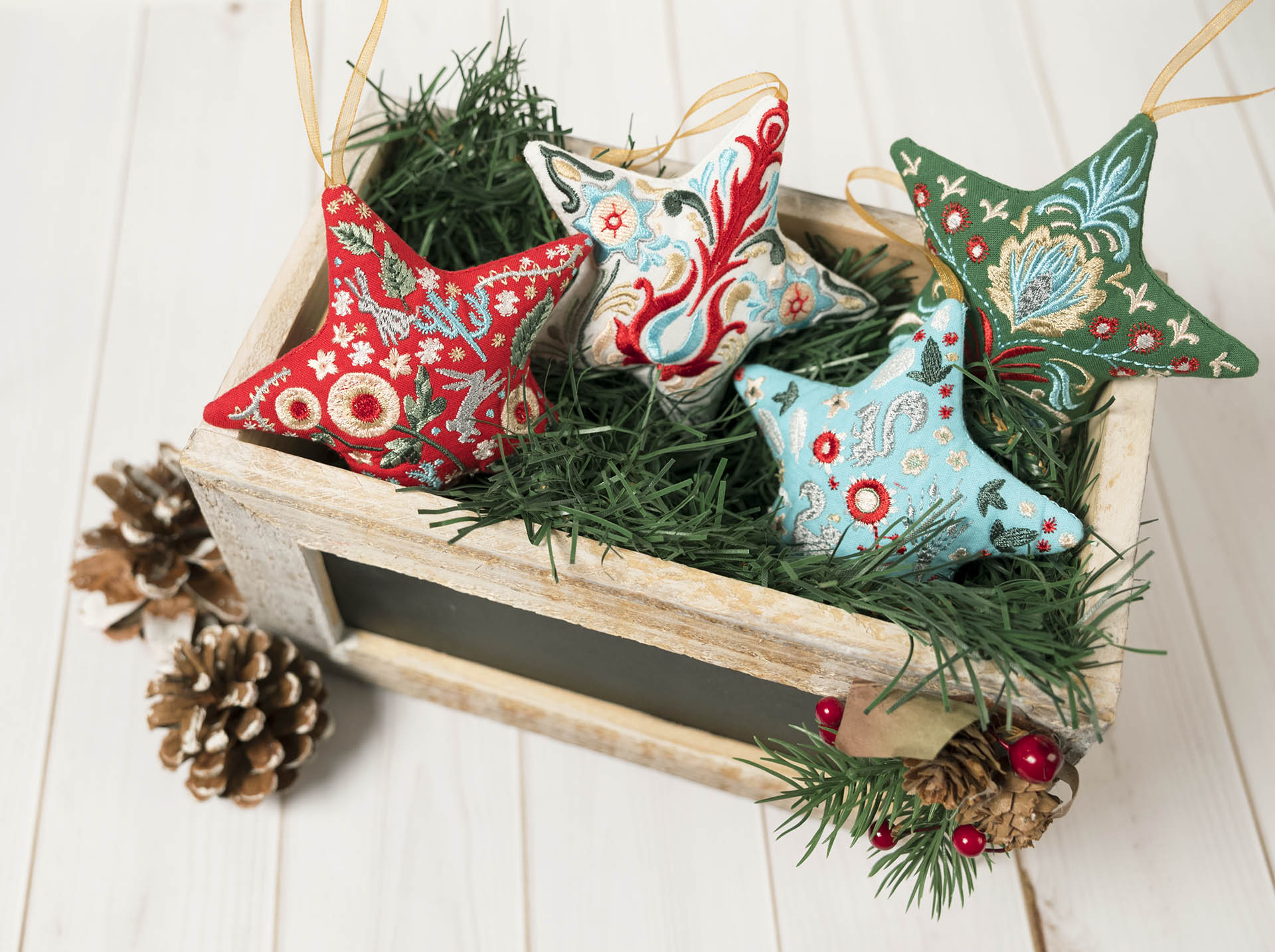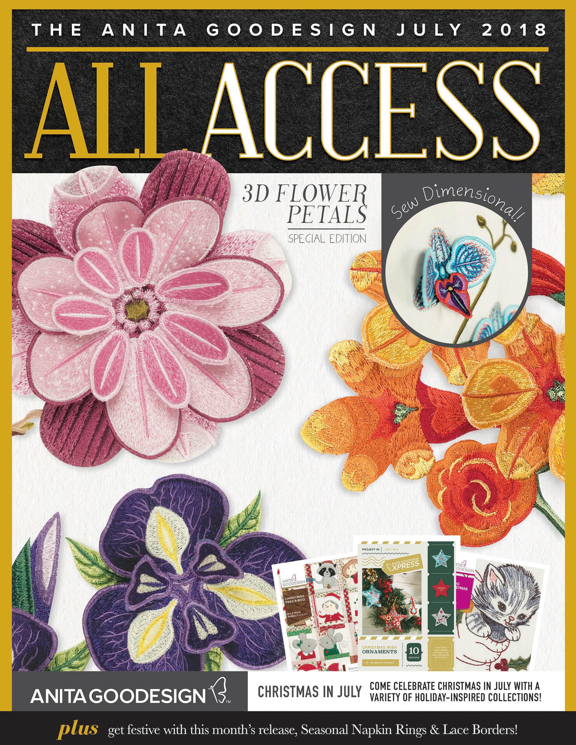 It’s Christmas in July, so what better than to get a head start on holiday decor and gifts? This month’s collections incorporate a variety of easy-to-do techniques, from raw edge appliqué to 3D elements and even a stuffed ornament, so sip on some lemonade and escape the summer heat at your machine with these fun designs! Included in this month's issue: *Christmas Peek-a-Boo *Southwestern Quilt *Retro Christmas *Seasonal Napkin Rings & Lace Borders *3D Flower Petals For more information about the designs included in this issue, please refer to the product description page of the collections listed above.