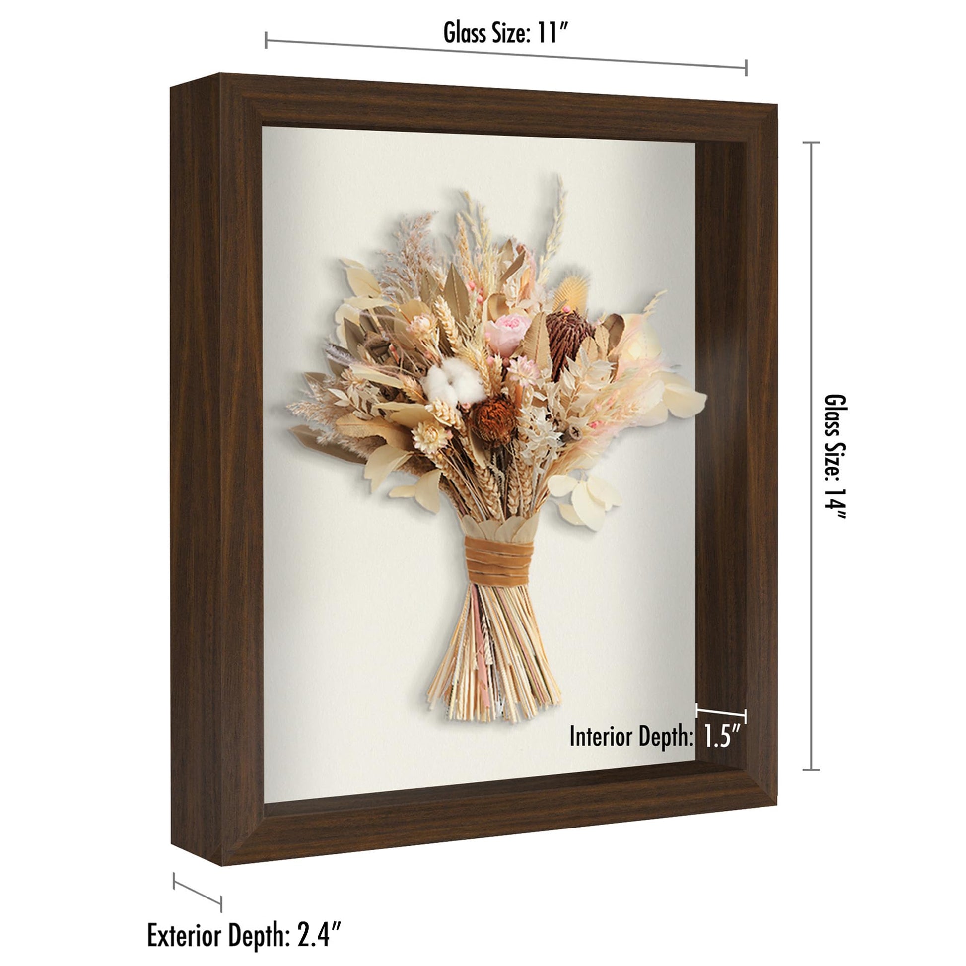 - Our stylish 11x14 shadowbox picture frame is crafted from durable engineered wood (MDF), featuring shatter-resistant glass and an interior depth of 1.5 inches, providing ample space to securely display your valuable treasures for years.