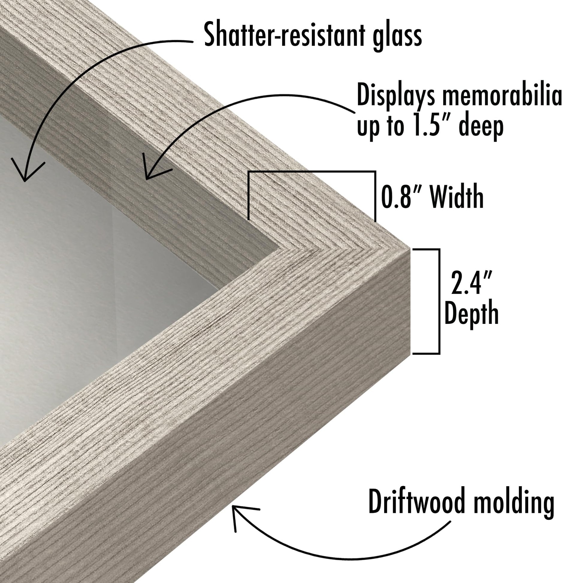 Give your memories the frame they deserve with the Americanflat 11x14 shadow box frame. Crafted with a sleek driftwood-inspired woodgrain finish (made of engineered wood) and features a soft felt back, our shadow box is the perfect way to showcase your cherished moments and favorite treasures. Whether it’s a family photo, award, or a special memento, this frame adds just the right amount of style. The deep 1.5-inch interior depth provides ample space to safely store and protect your prized possessions, while the 2.4-inch exterior depth is ideal for displaying on a tabletop, offering plenty of room for your items to stand out. And when you’re ready to take it to the wall, simply use the included hanging hardware for an easy vertical or horizontal display option. From photos to memorabilia, these shadow box display cases adapt to your needs, adding a timeless touch to any room. The box molding and polished finish enhance your display, creating an elegant piece that complements any home or office decor. Not only does it look great, but it’s built to last. With a shatter-resistant glass front for crystal-clear visibility and easy-to-use turn buttons for hassle-free updates, this shadowbox picture frame keeps your memories secure and beautifully displayed for years to come. The sturdy backboard ensures everything stays in place, no matter what you choose to showcase. Why settle for an ordinary frame when you can have a deep shadow box frame that adds both style and security? Order yours today and join thousands of satisfied customers who’ve transformed their spaces with Americanflat.