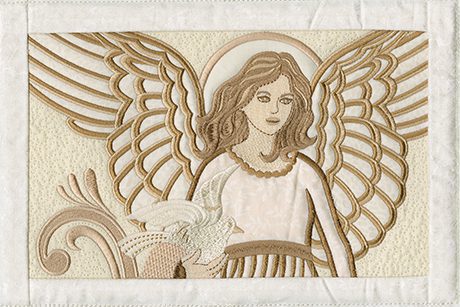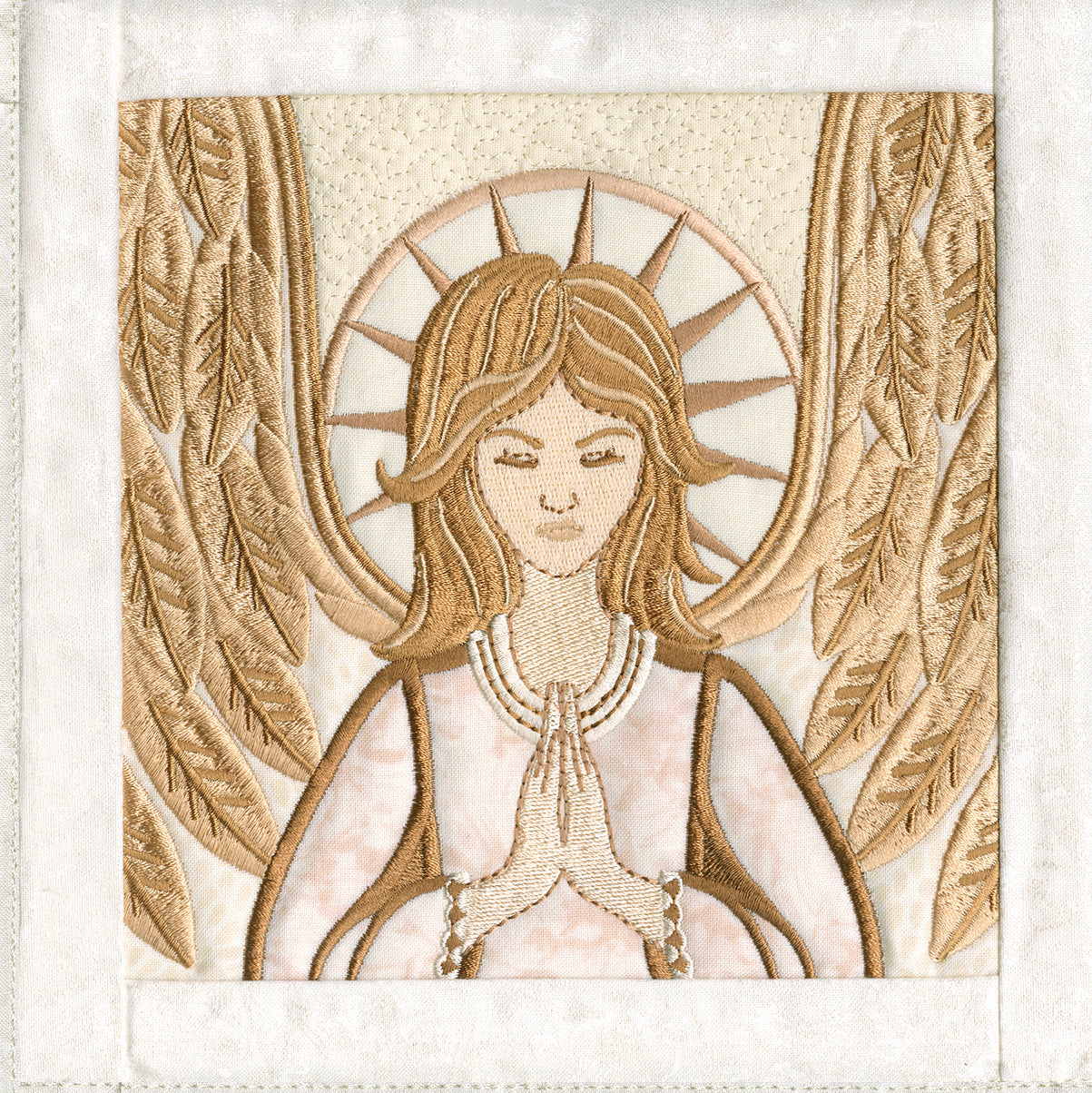 Prepare to be enchanted by the Angels collection as we spread our wings and explore the ethereal realm of these celestial beings. Within this collection, you will discover a delightful array of angels engaged in various activities, from playing the horn to adorning themselves with strings of flowers, and offering heartfelt prayers. Each design has been thoughtfully created using an off-white base fabric and applique or fill stitches in neutral tones, resulting in an angelic aesthetic that is truly captivating.