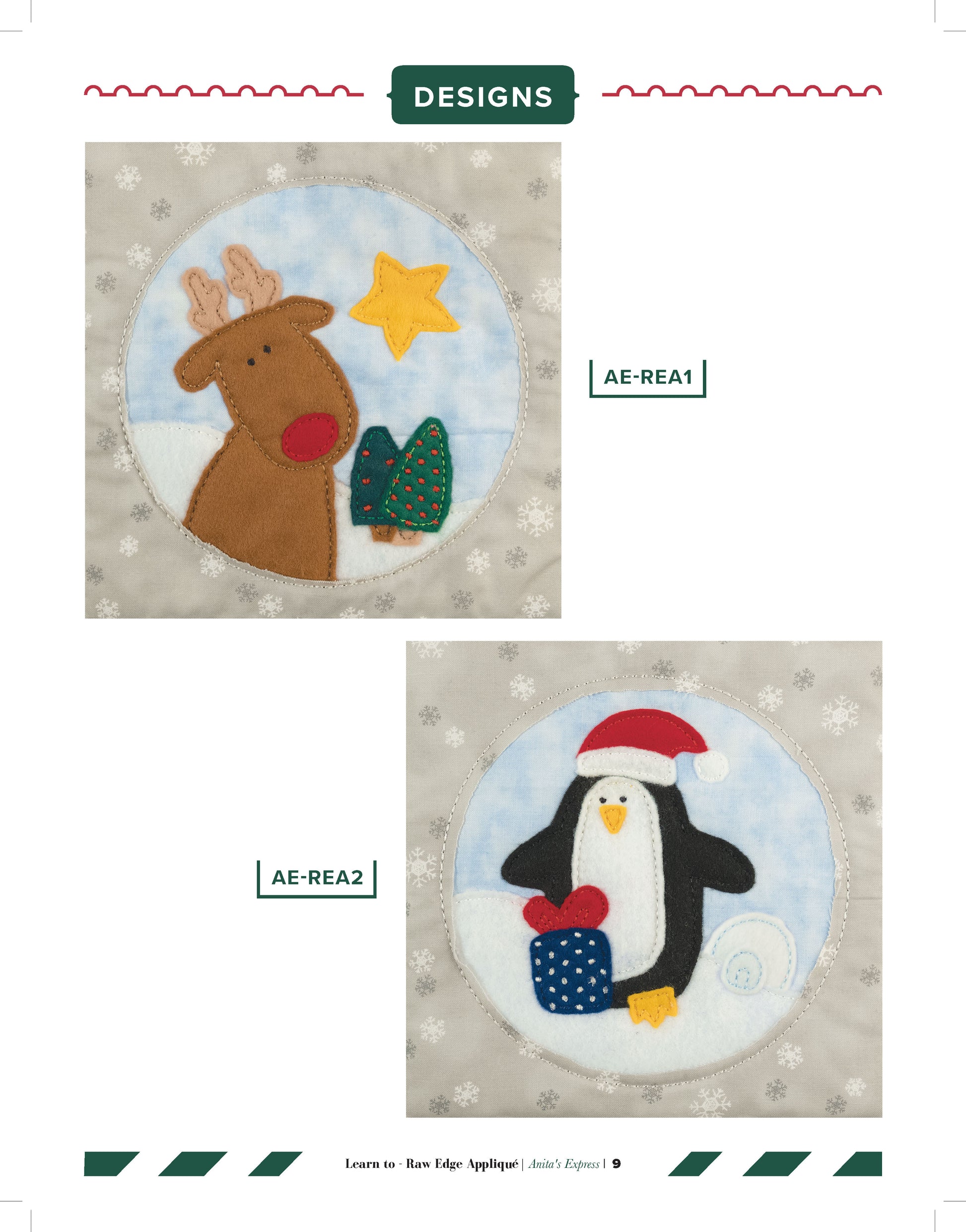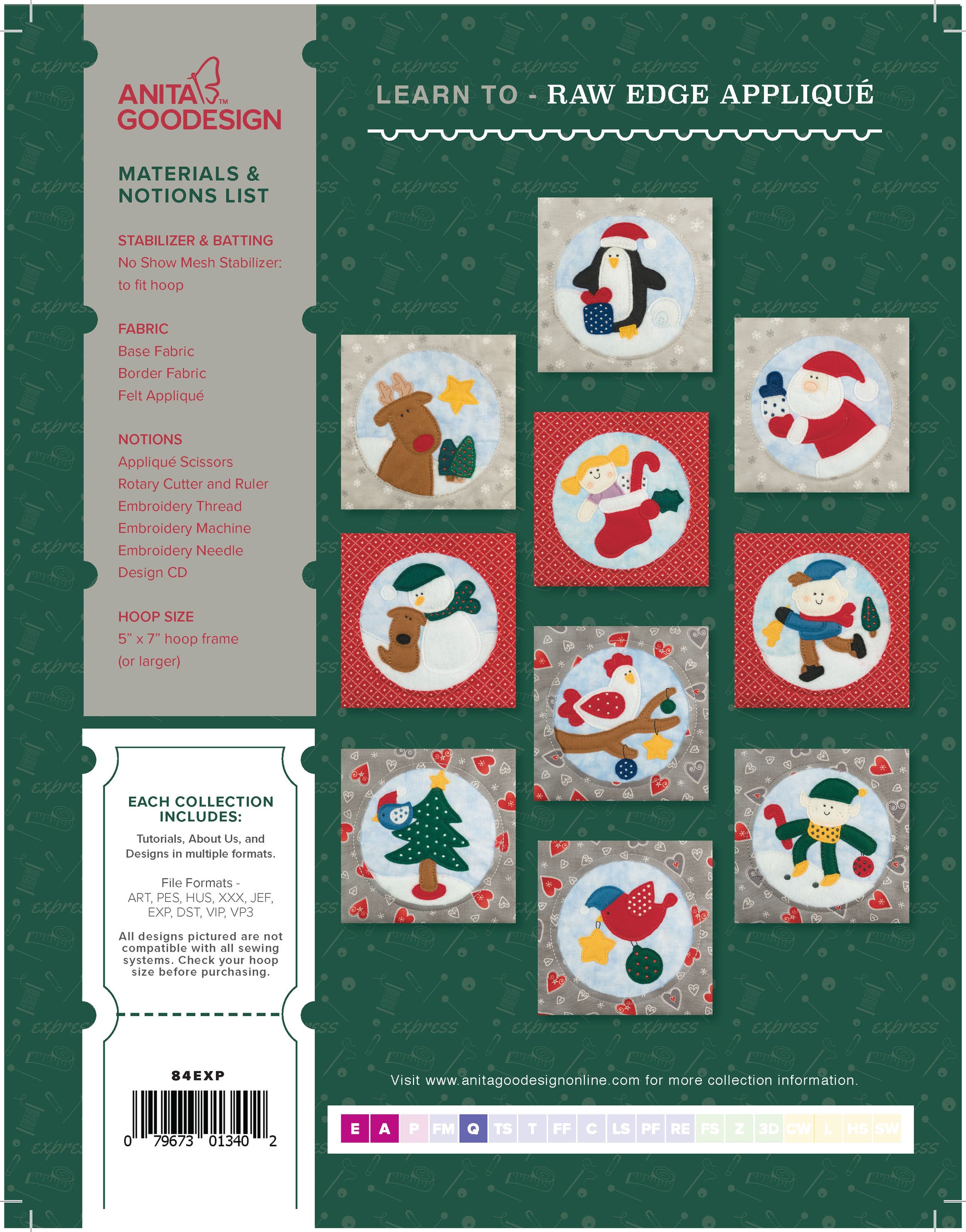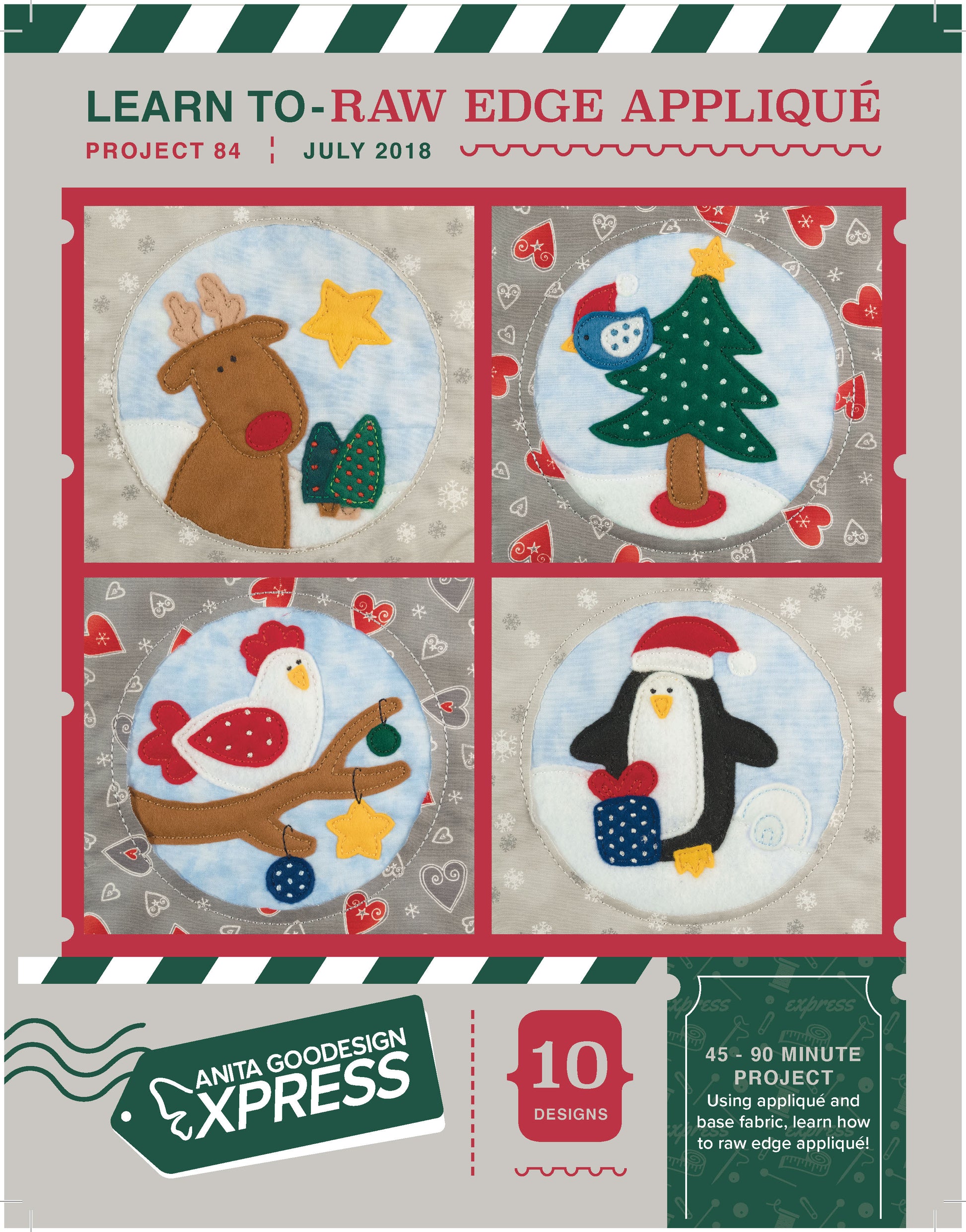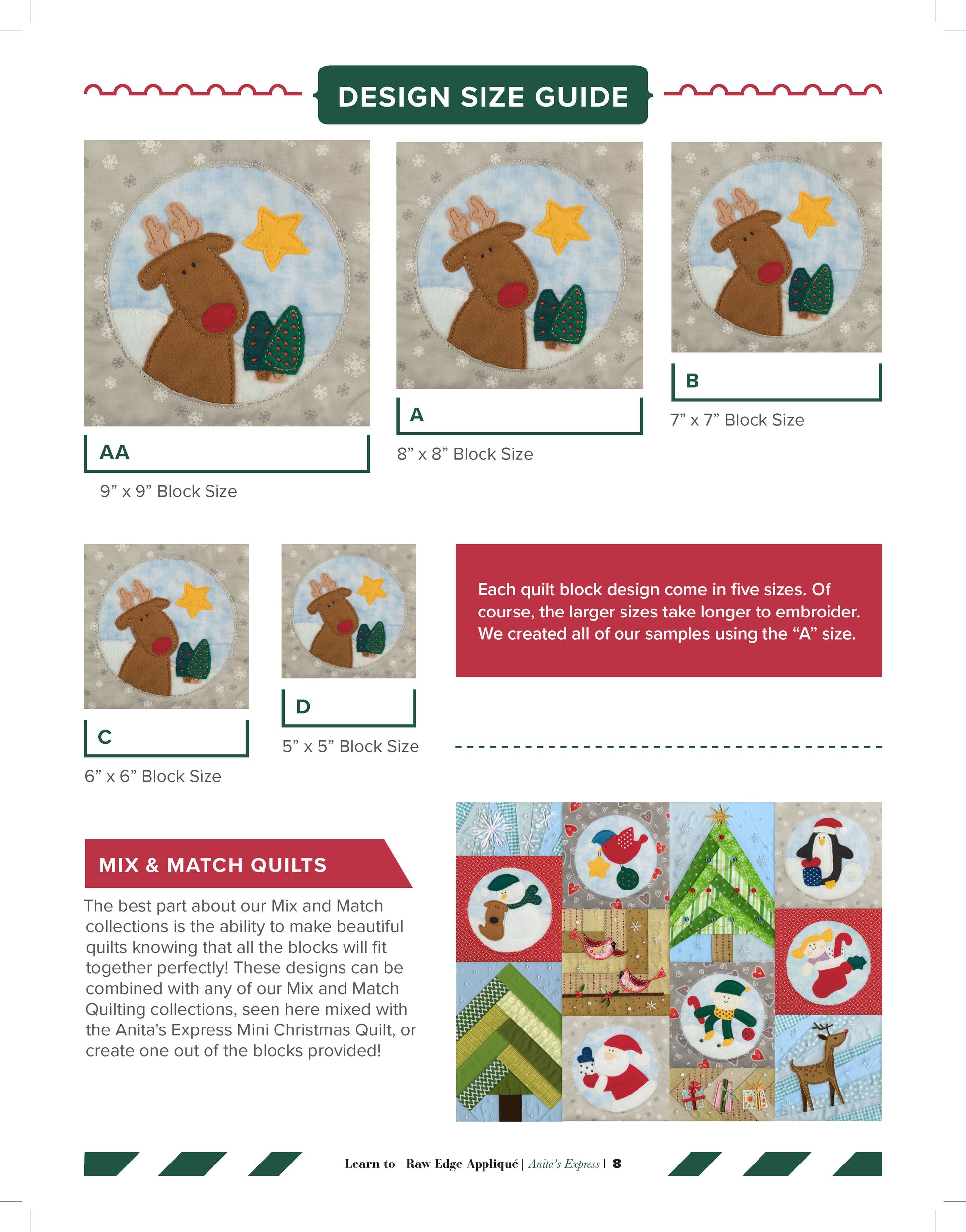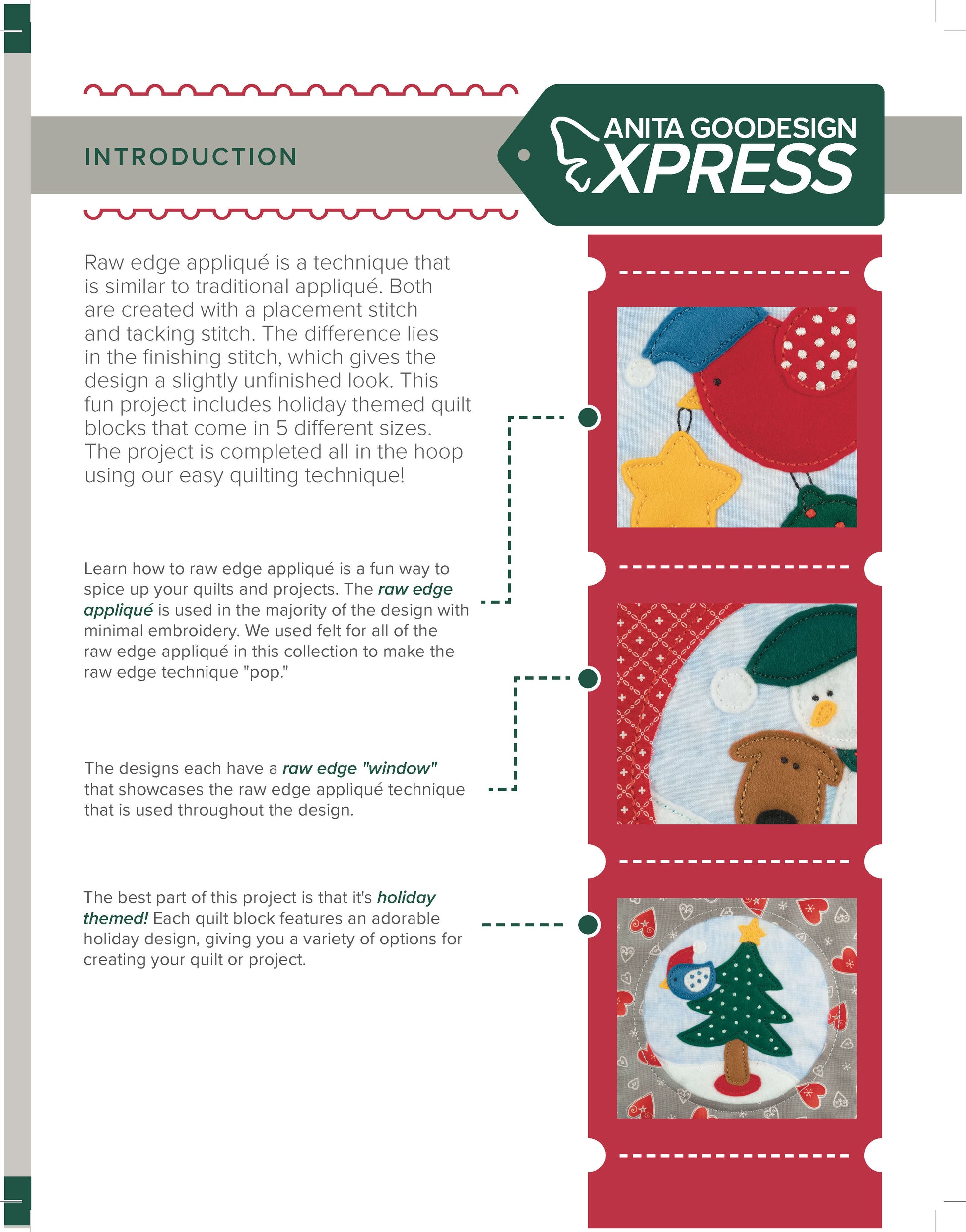 Raw edge appliqué is a technique that is similar to traditional appliqué. Both are created with a placement stitch and tacking stitch. The difference lies in the finishing stitch, which gives the design a slightly unfinished look. This fun project includes holiday themed quilt blocks that come in 5 different sizes. The project is completed all in the hoop using our easy quilting technique!