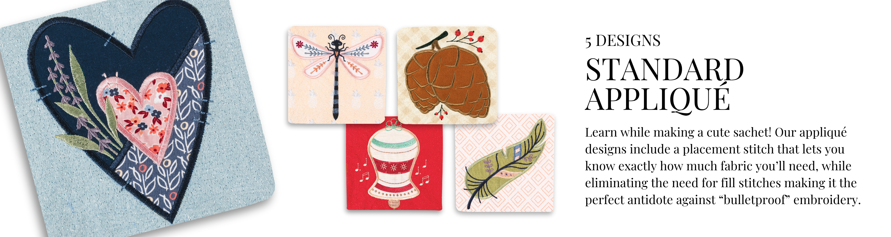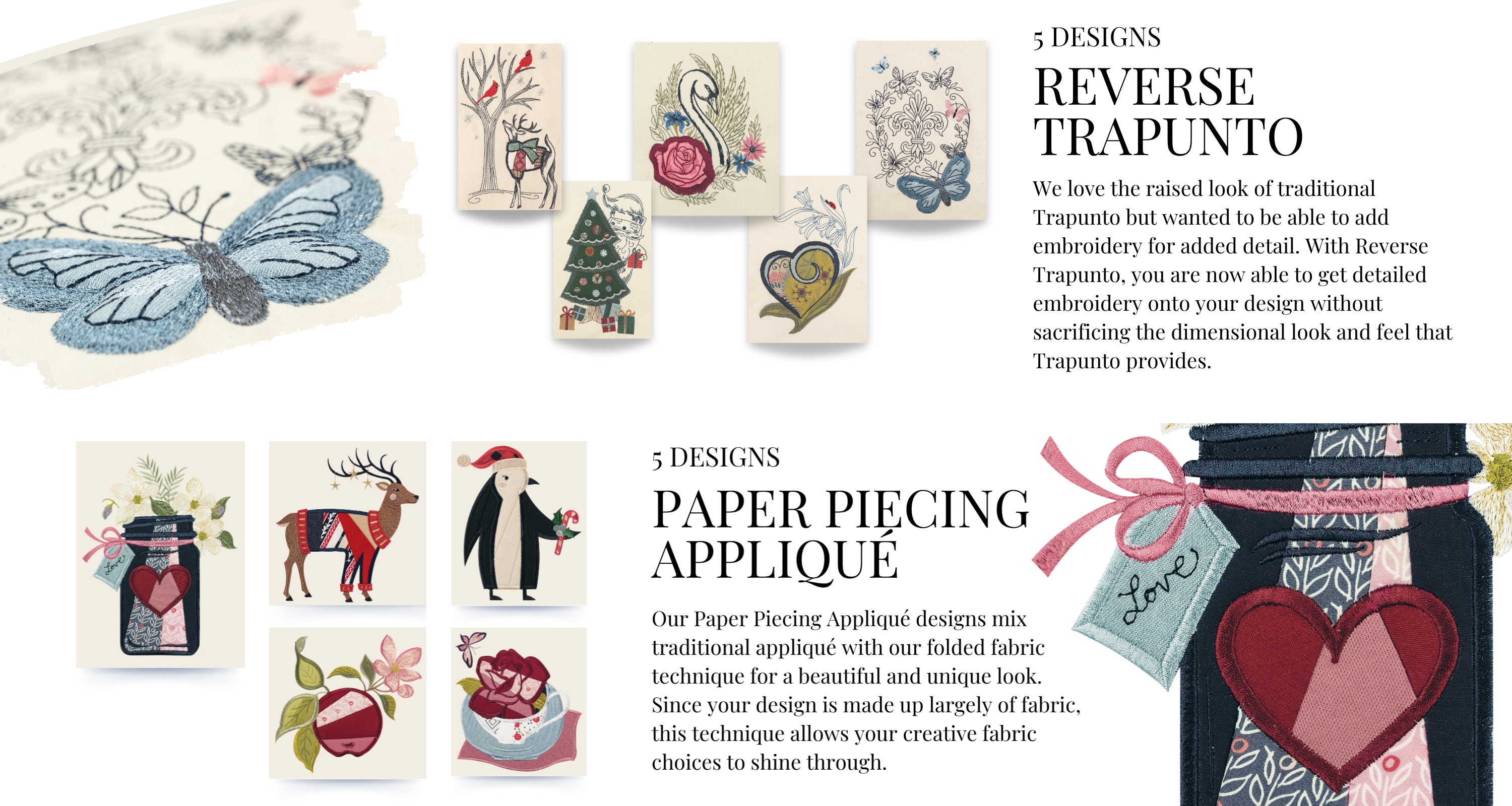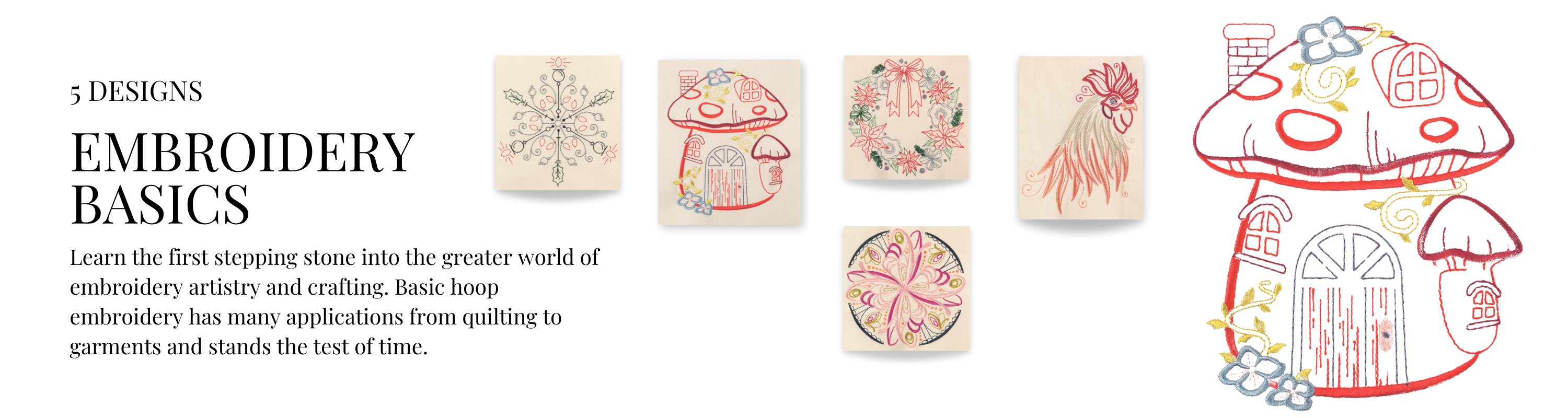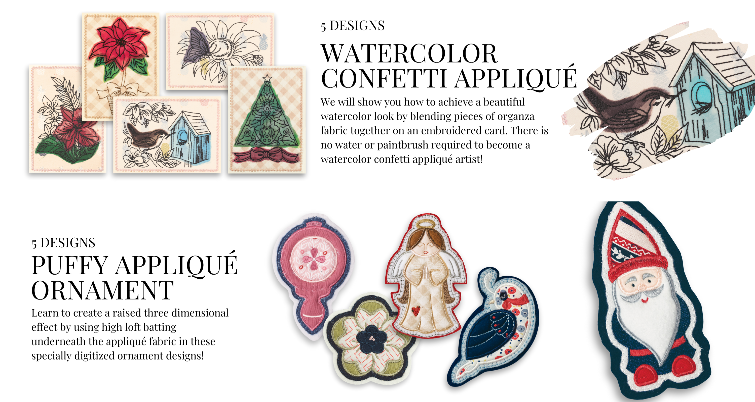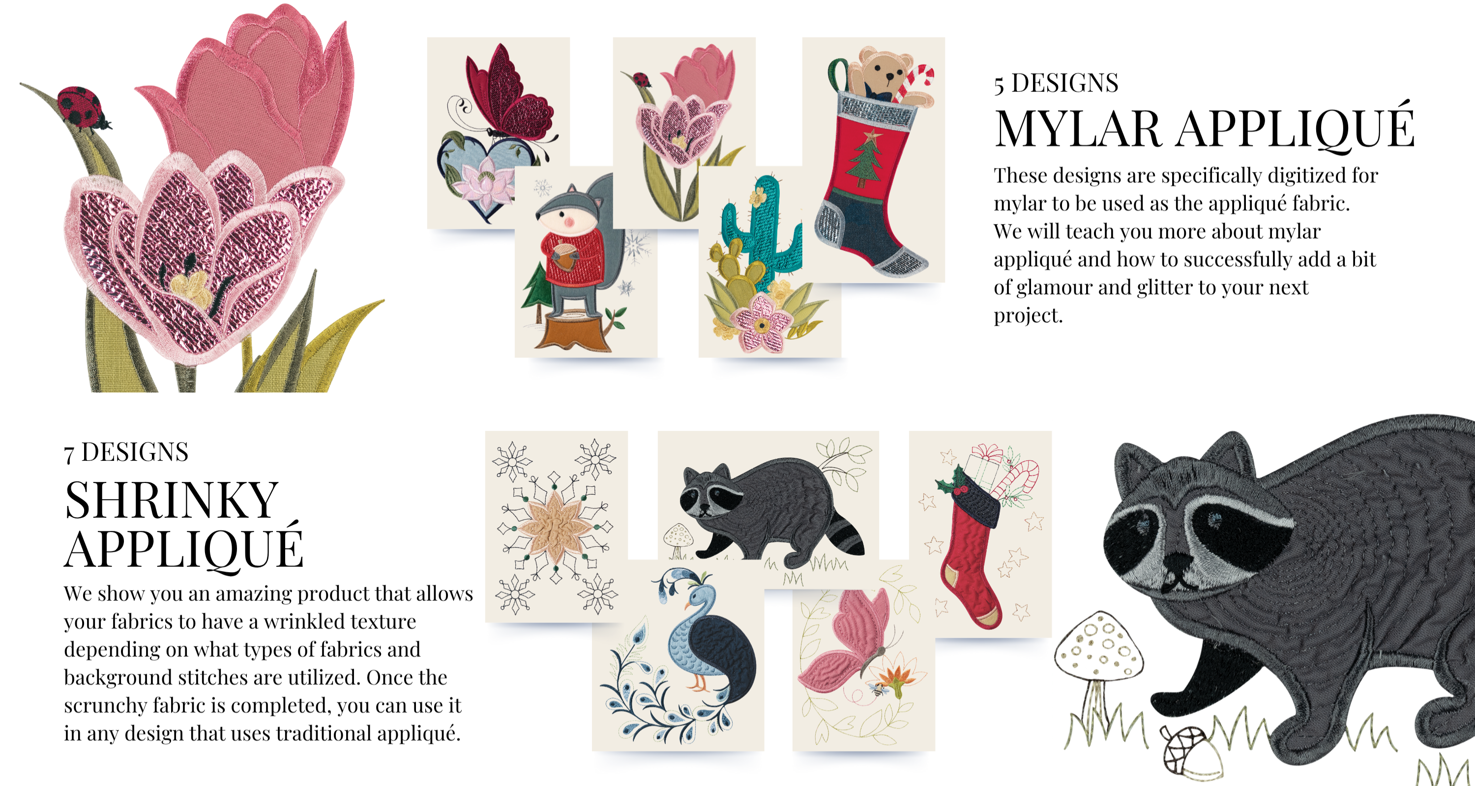Get ready to learn different embroidery techniques such as heirloom stitching, freestanding lace, and even adding color to your embroidery projects with markers. And we don’t stop at the basics, we’ll be taking a closer look at unique appliqué methods such as watercolor appliqué, reverse appliqué, ghost stitch appliqué, and so much more. Thinking outside the hoop, we’ll discover dimensional designs through covered button embroidery & our reverse trapunto method, which is a unique way of combining the quilting technique of trapunto with detailed embroidery to get a truly unique outcome.