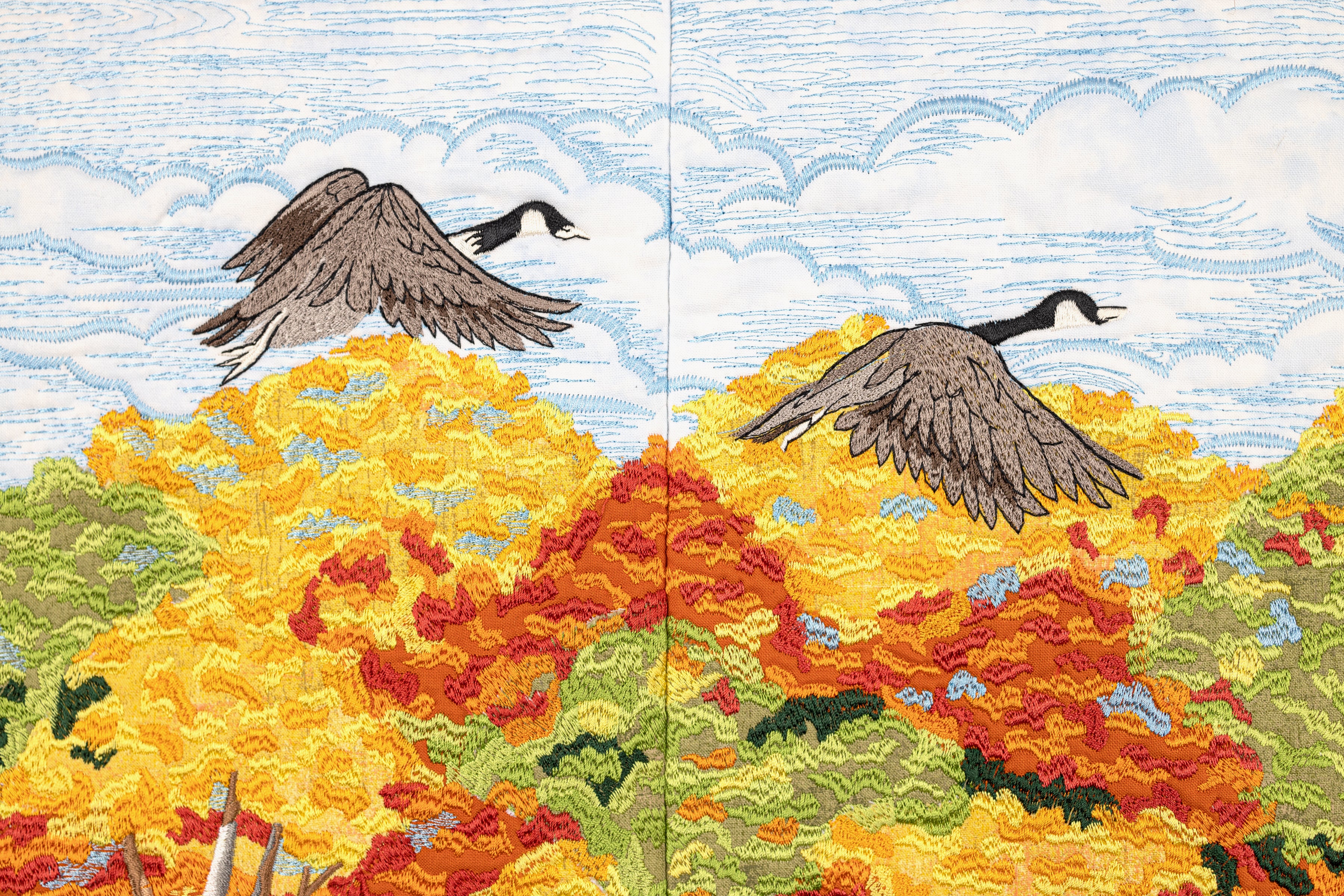 Rich details are added overtop of hidden appliqué fabrics, allowing this tile scene to burst to life with embroidered color.