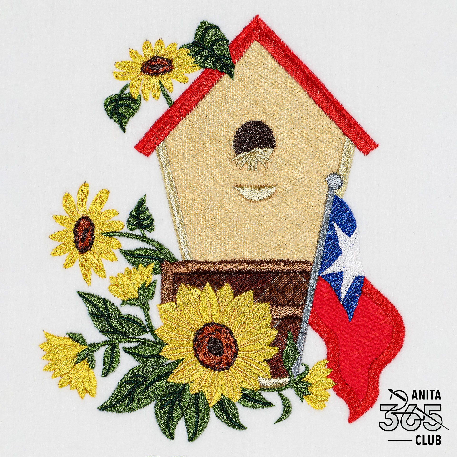 Get your scraps and scissors ready for this super fun confetti bird house design! Three areas of appliqué give you plenty of room to play with confetti fabric scraps while beautiful embroidered flowers provide realistic details to this mini scene.
