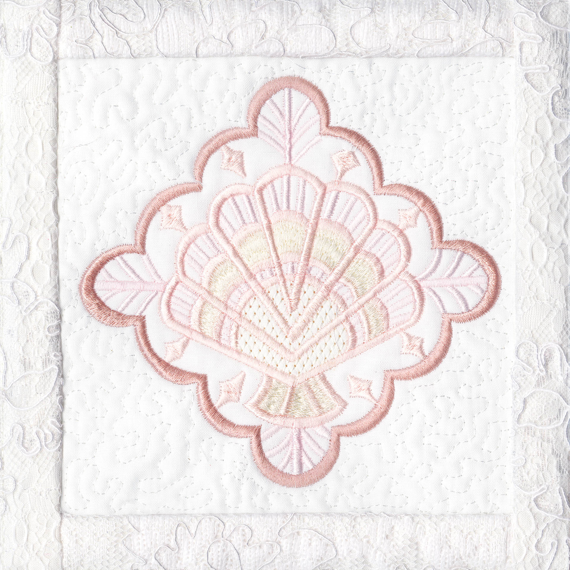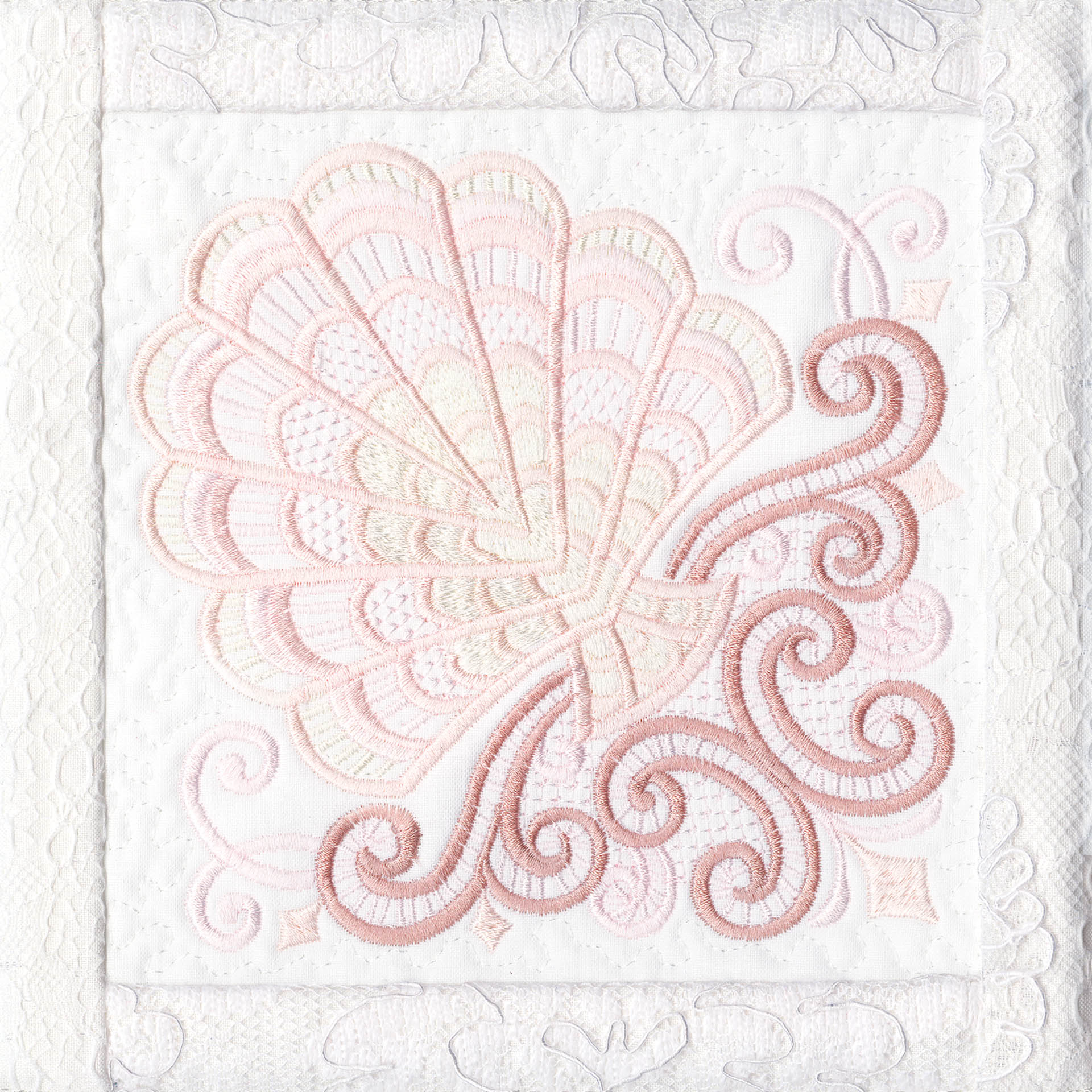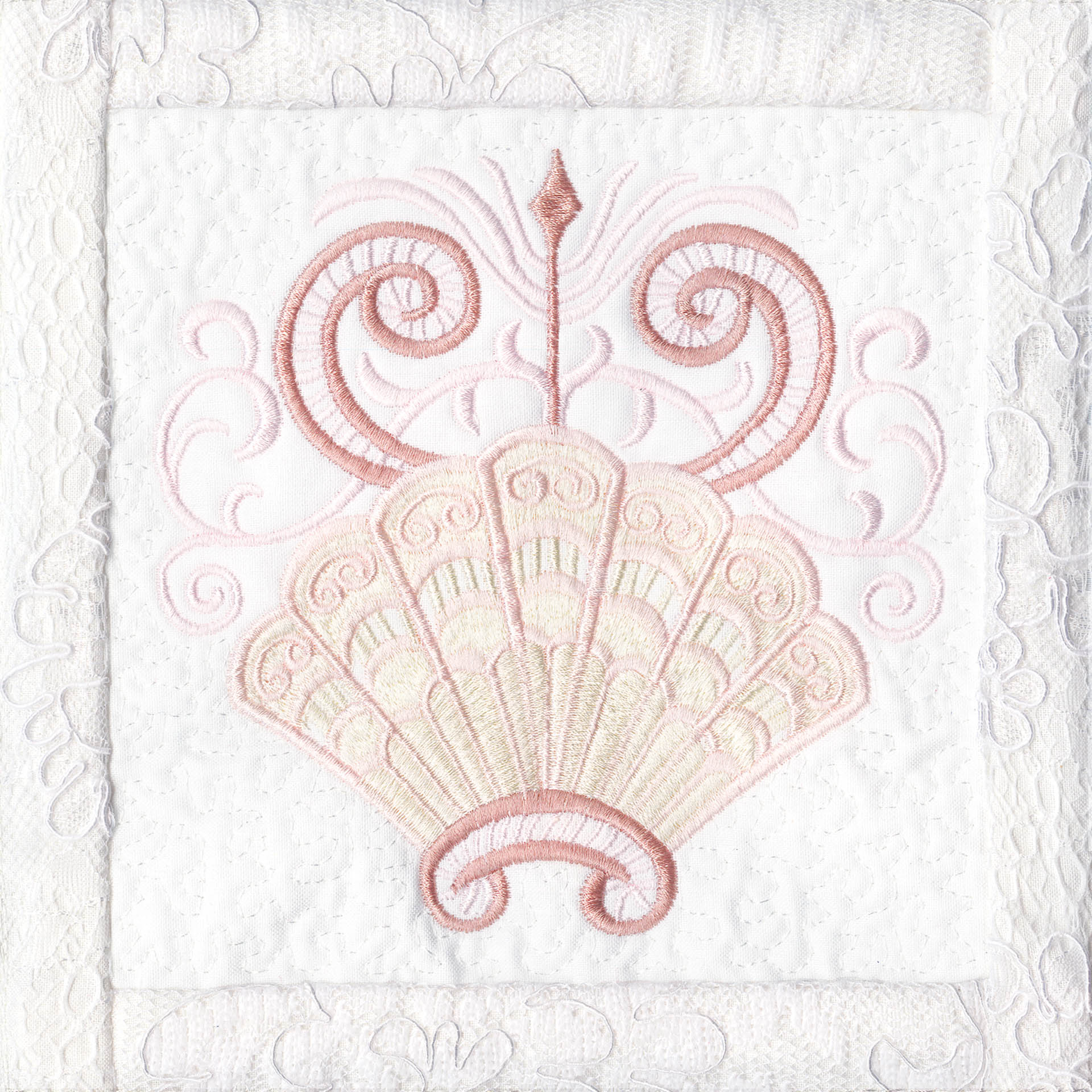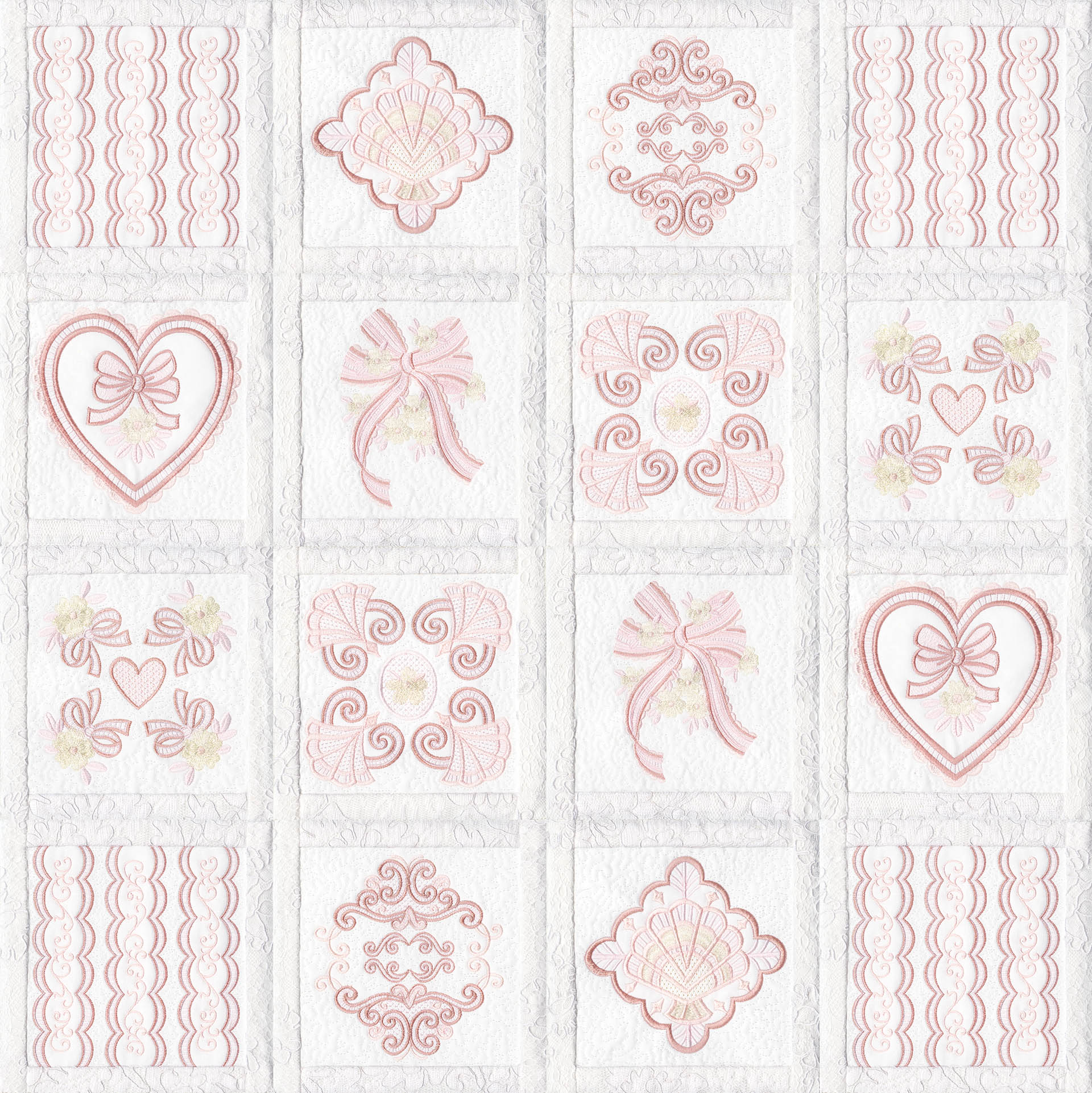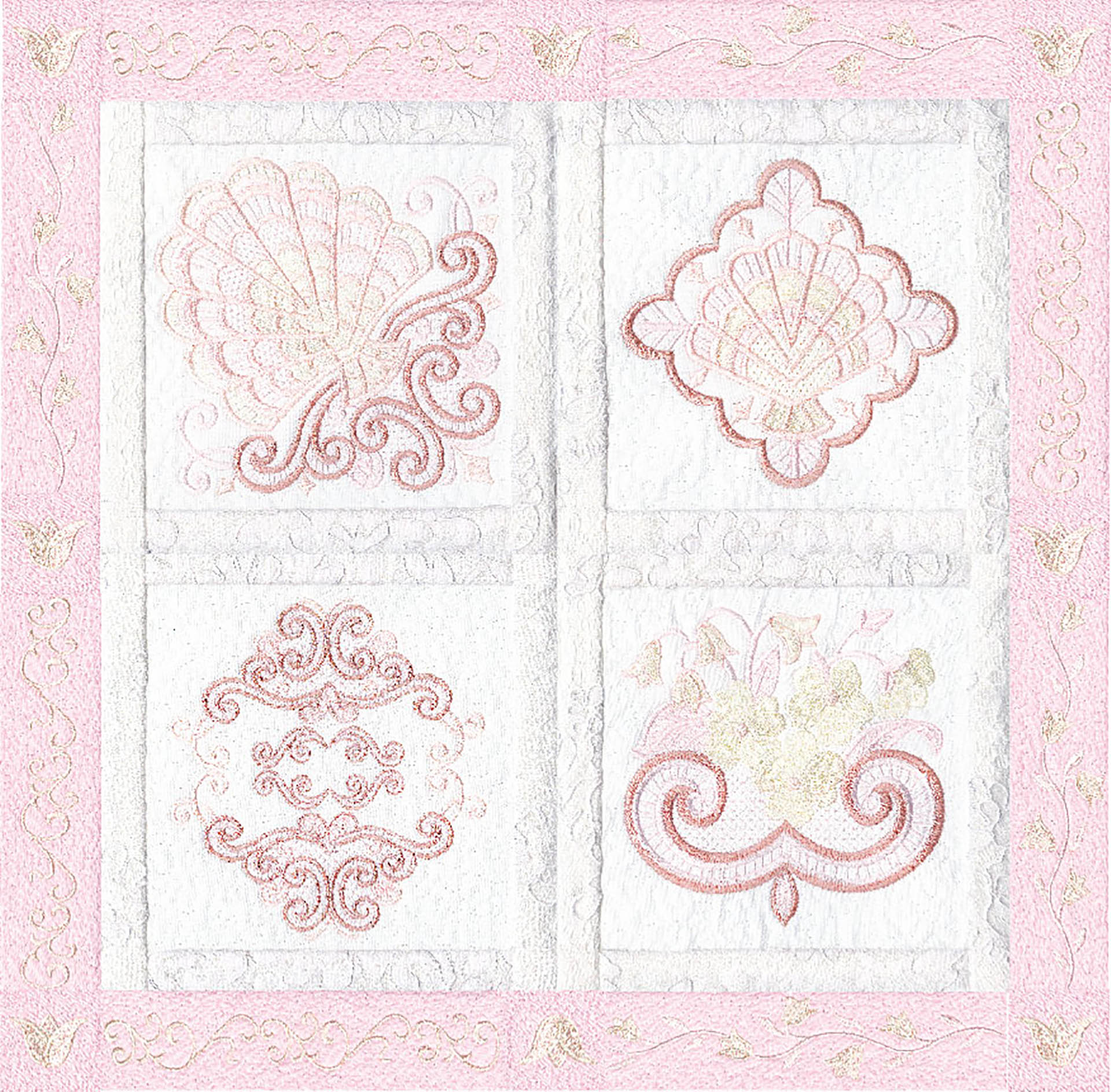 Blushing Impressions is a combination of small fancy floral motifs, scrolls, fans, ocean shells & decorative elements. We wanted to create a quilting collection with an overall vintage feel inspired by the cutwork technique. Although Blushing Impressions has no cutwork at all, the embroidery designs for each quilt block mimic the time-honored look.