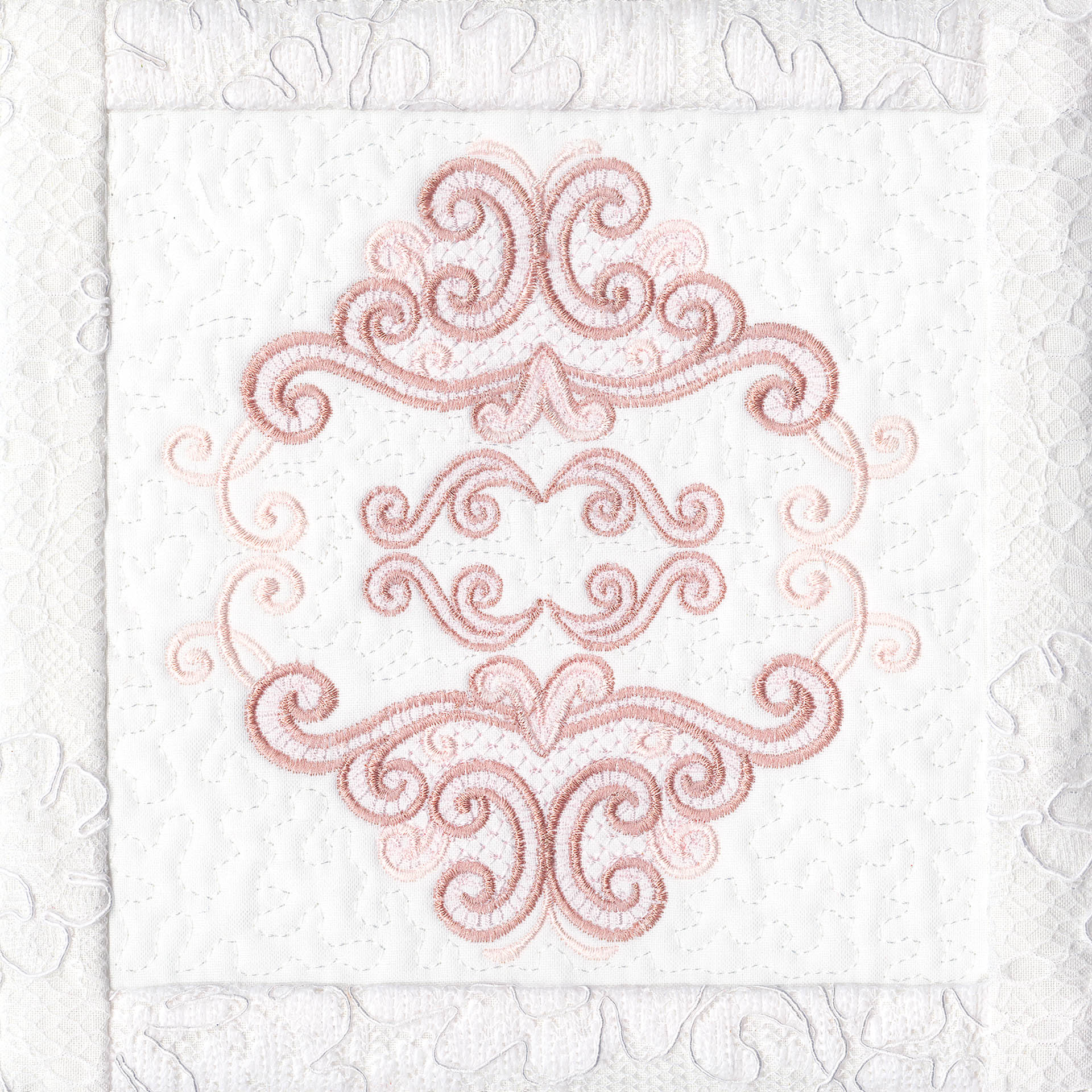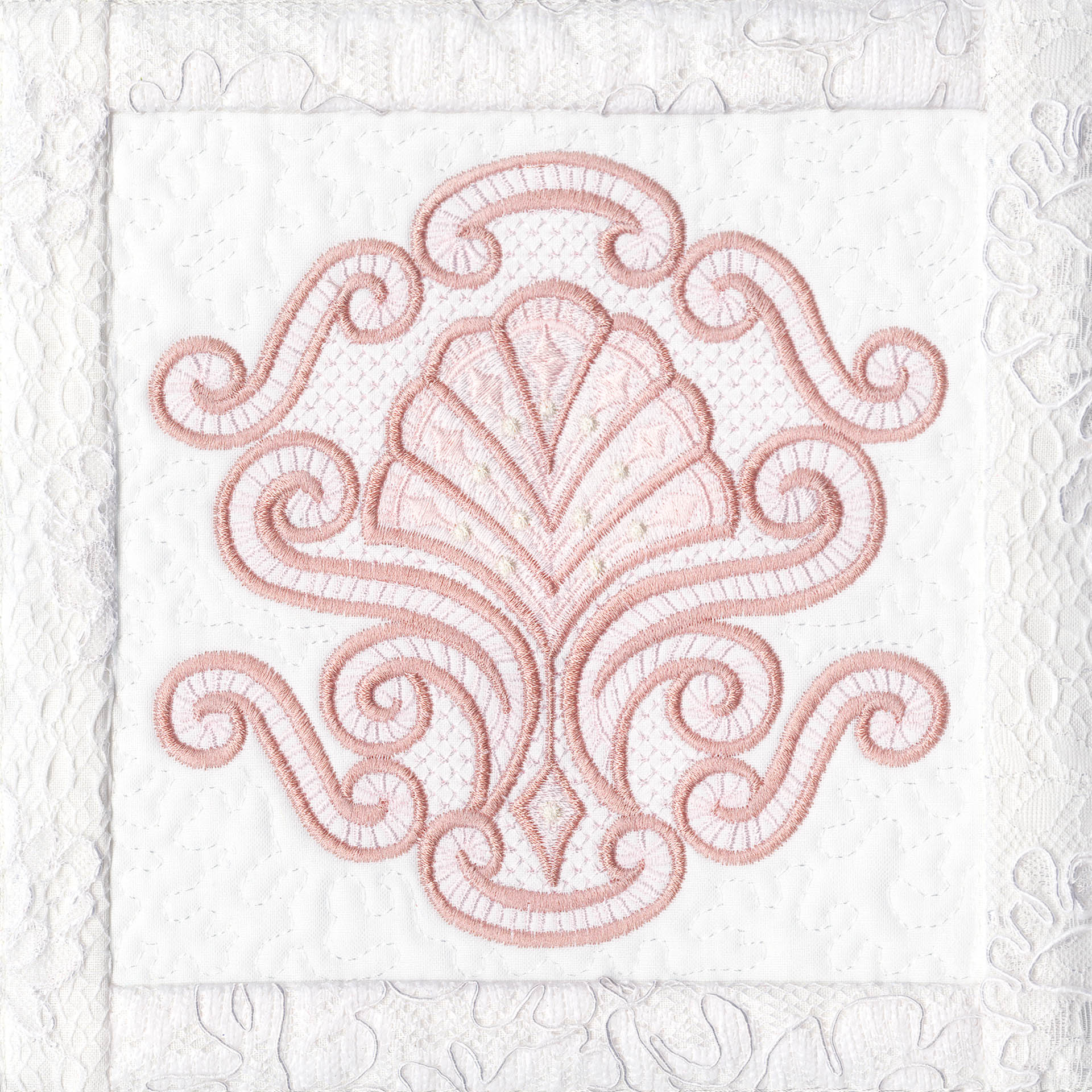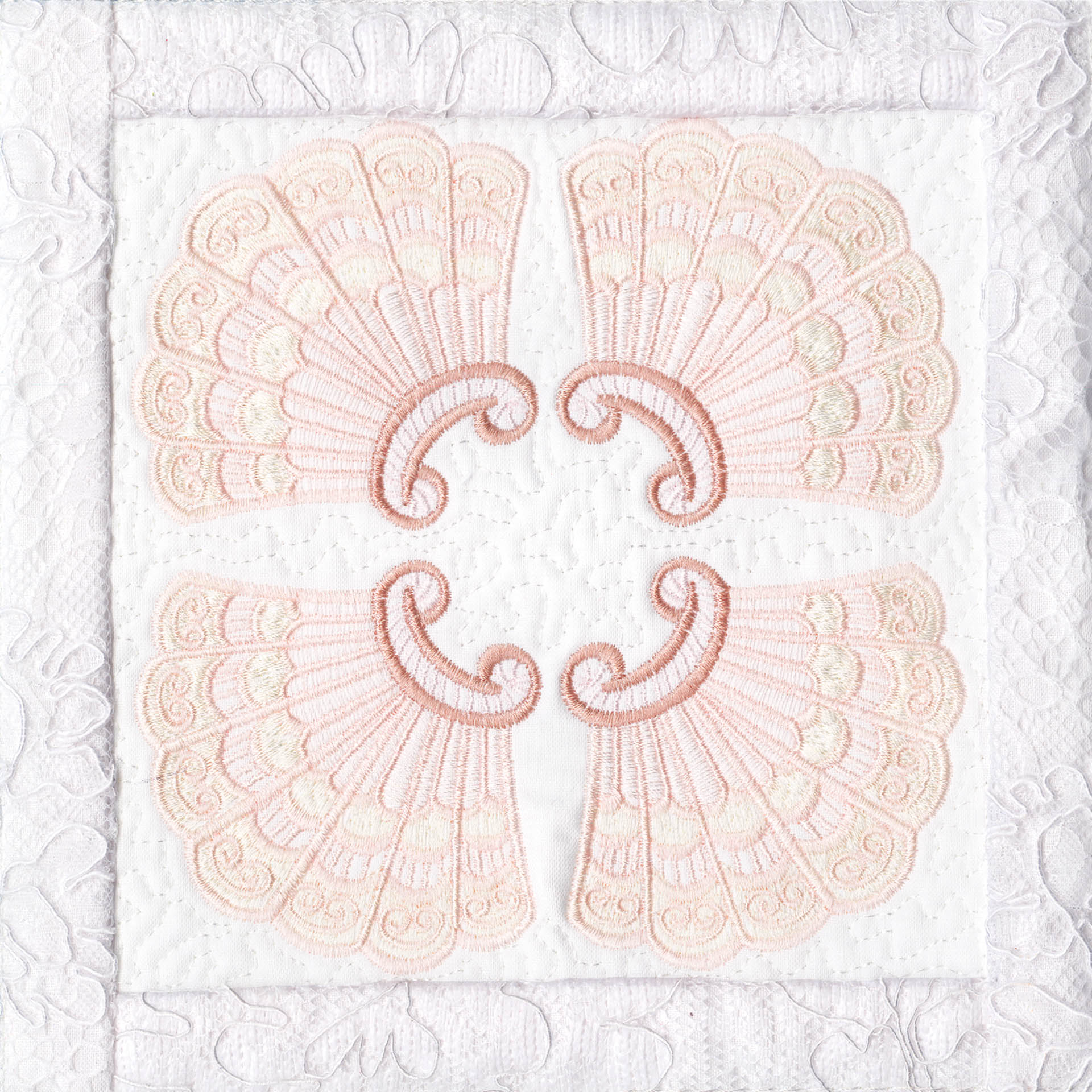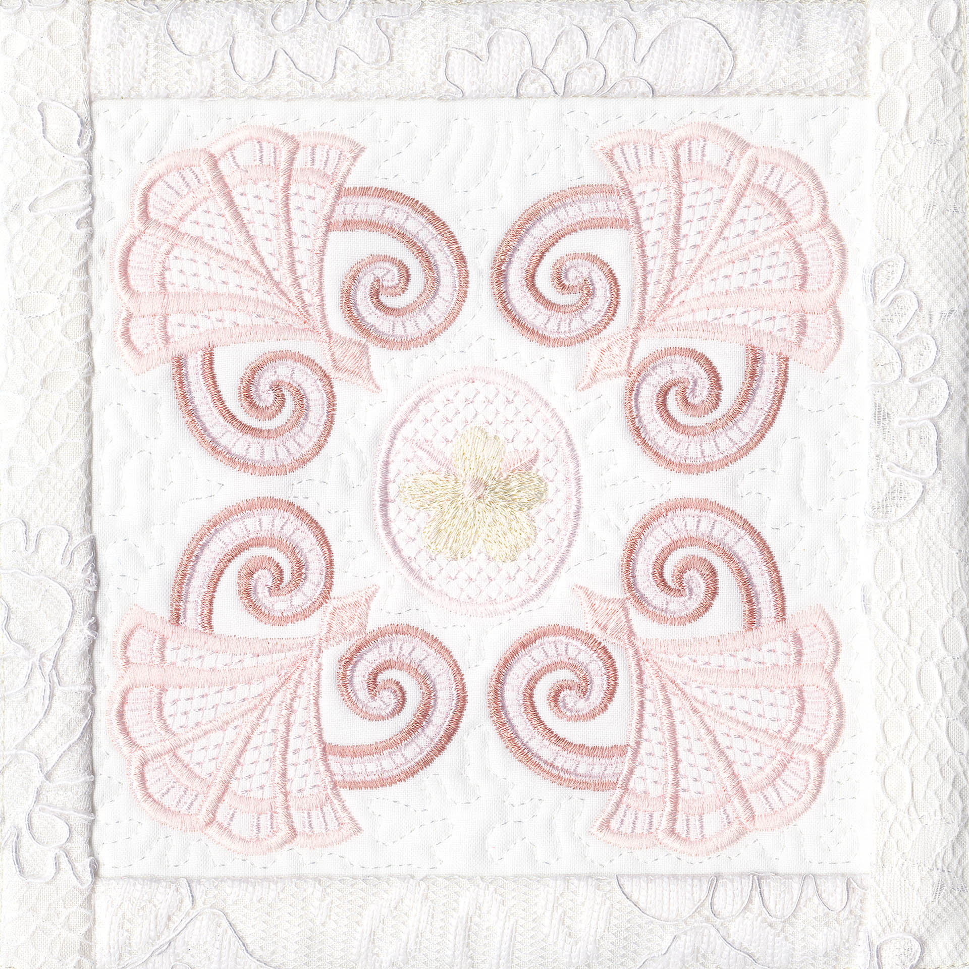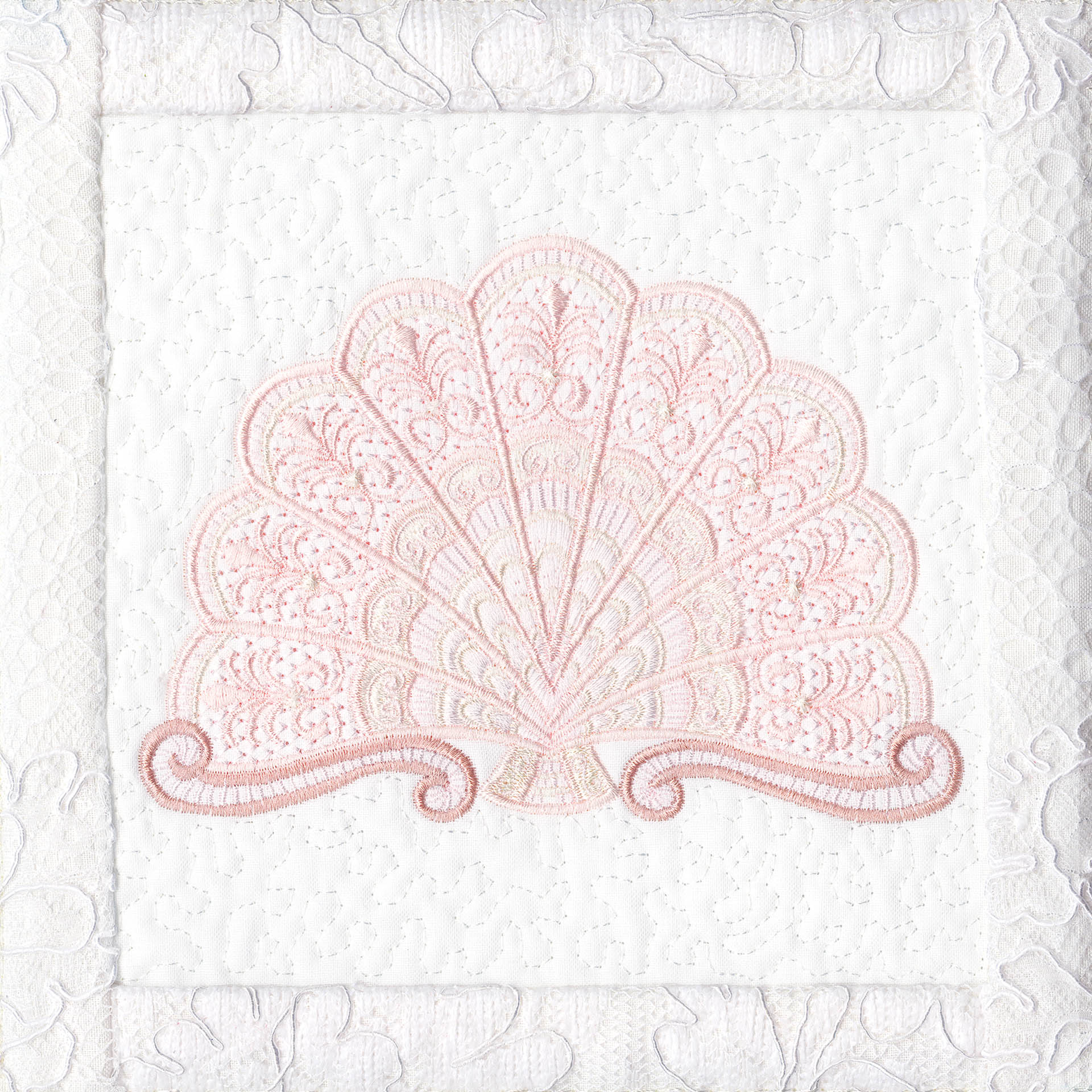 Blushing Impressions is a combination of small fancy floral motifs, scrolls, fans, ocean shells & decorative elements. We wanted to create a quilting collection with an overall vintage feel inspired by the cutwork technique. Although Blushing Impressions has no cutwork at all, the embroidery designs for each quilt block mimic the time-honored look.