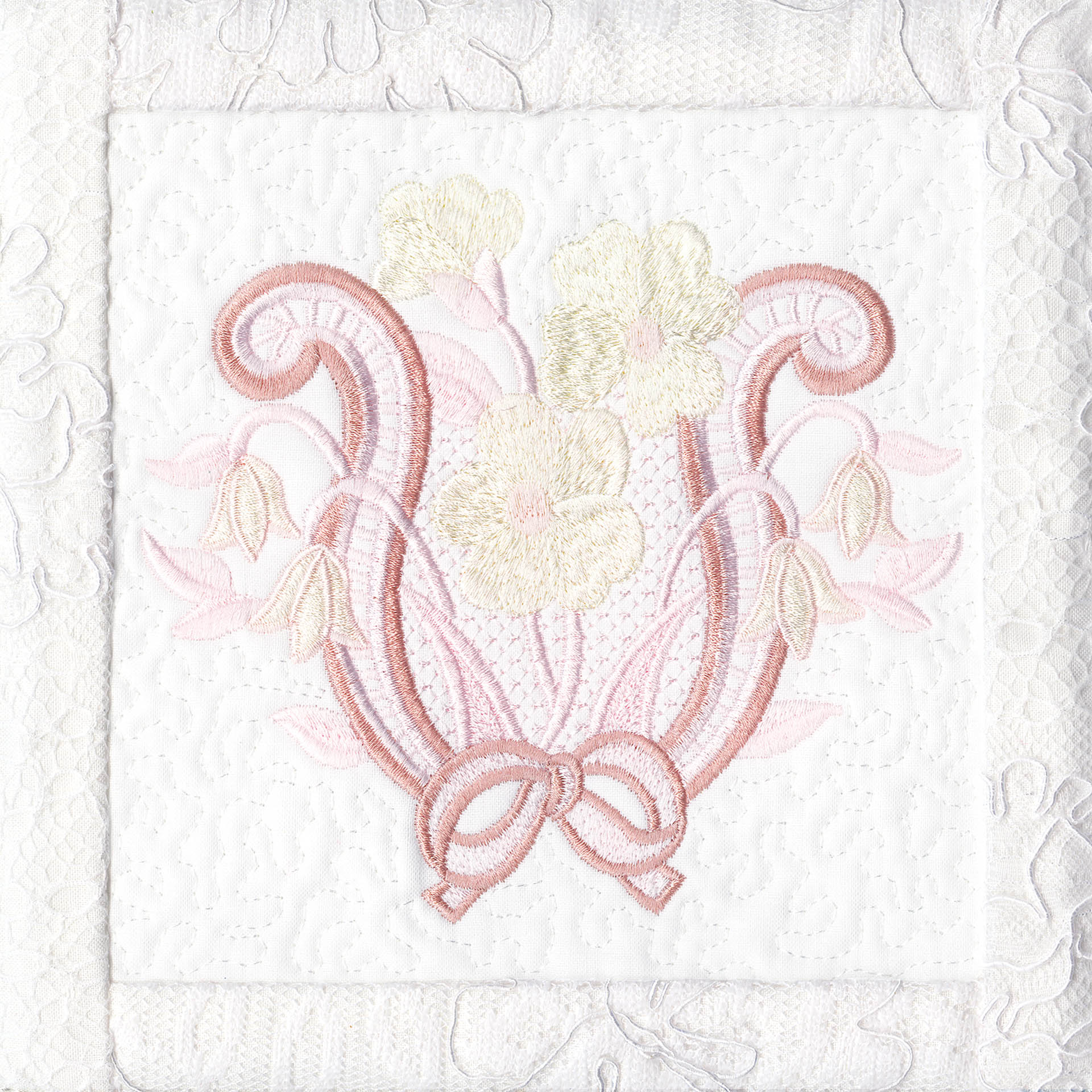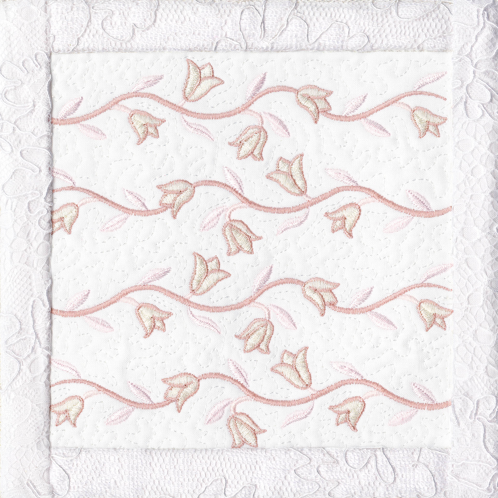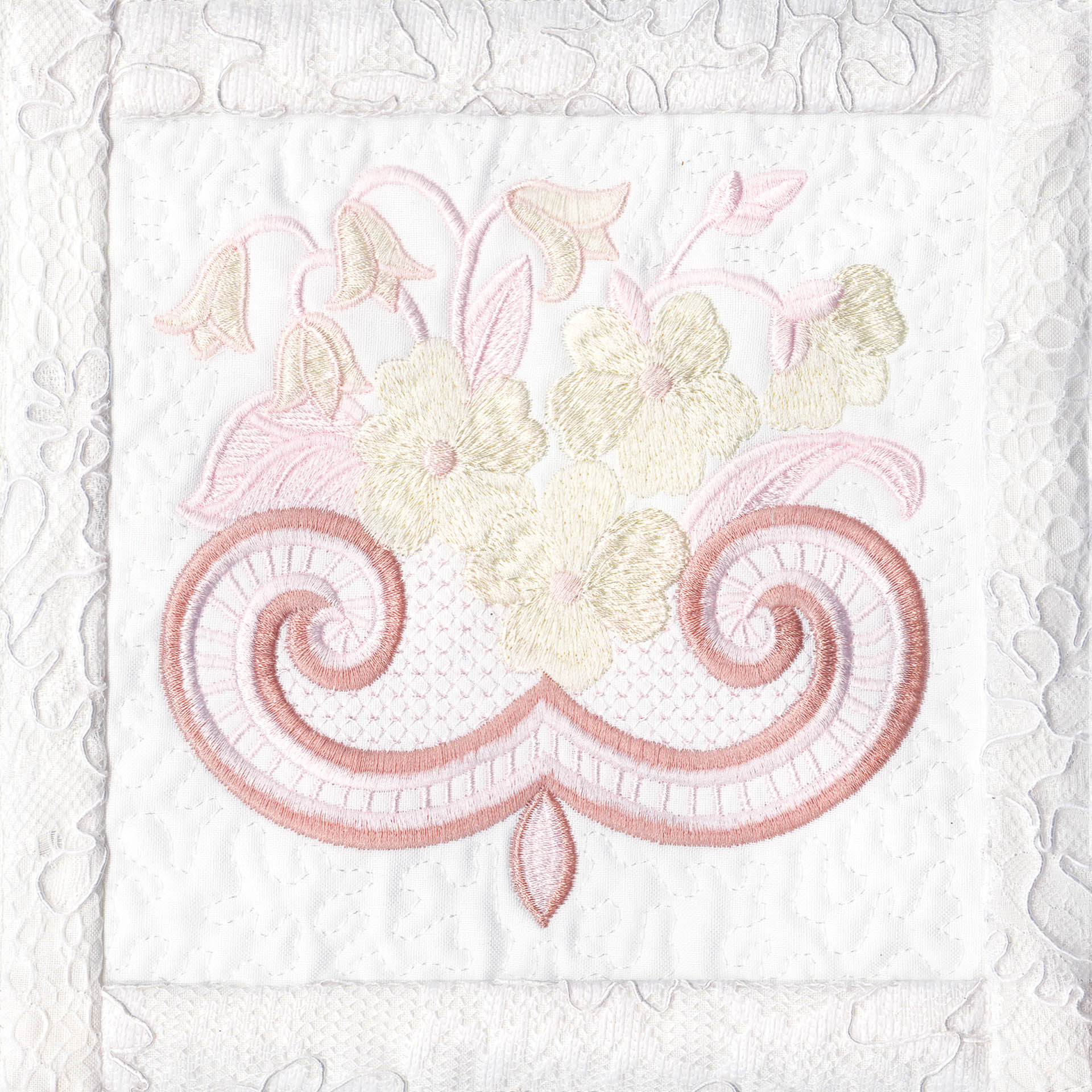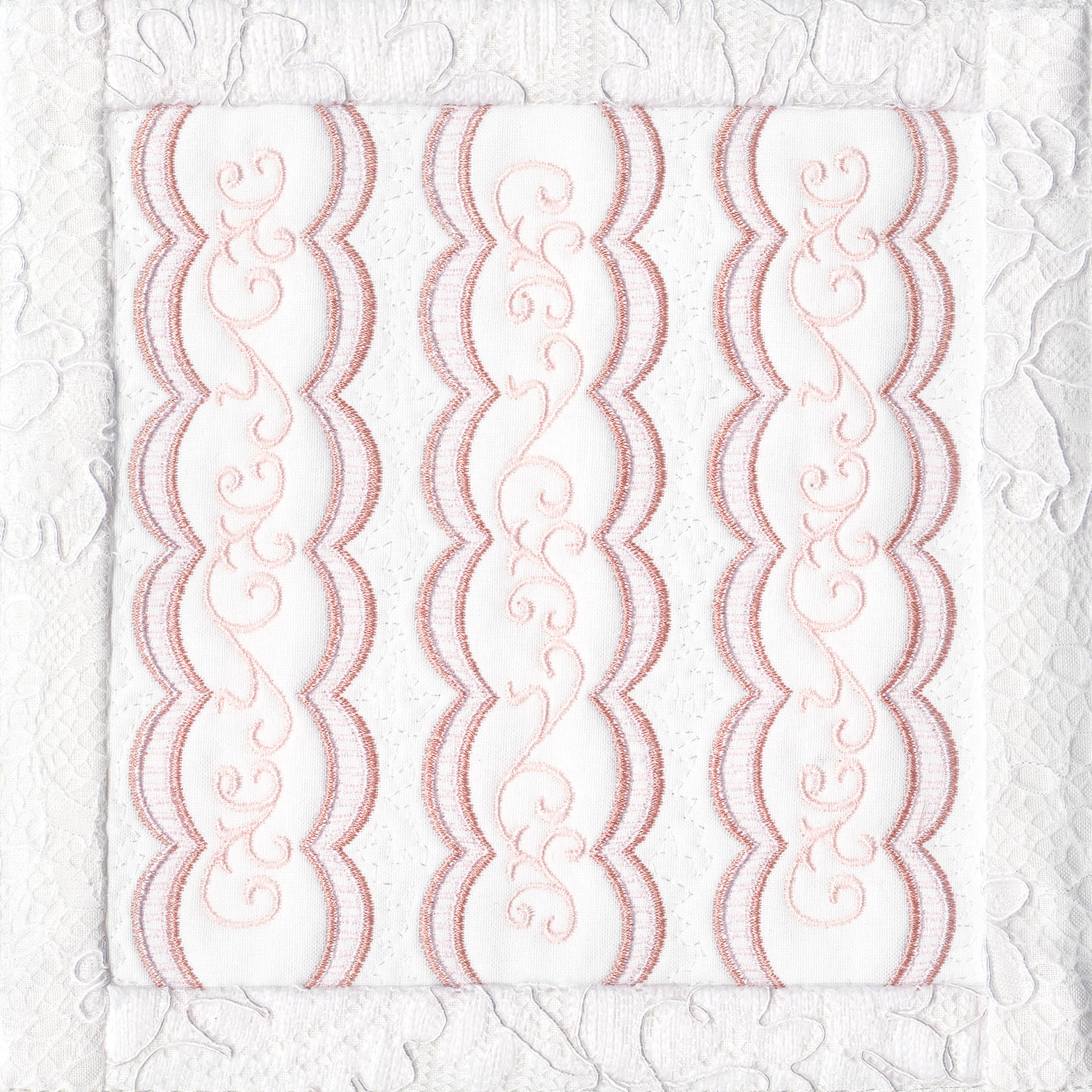 Blushing Impressions is a combination of small fancy floral motifs, scrolls, fans, ocean shells & decorative elements. We wanted to create a quilting collection with an overall vintage feel inspired by the cutwork technique. Although Blushing Impressions has no cutwork at all, the embroidery designs for each quilt block mimic the time-honored look.