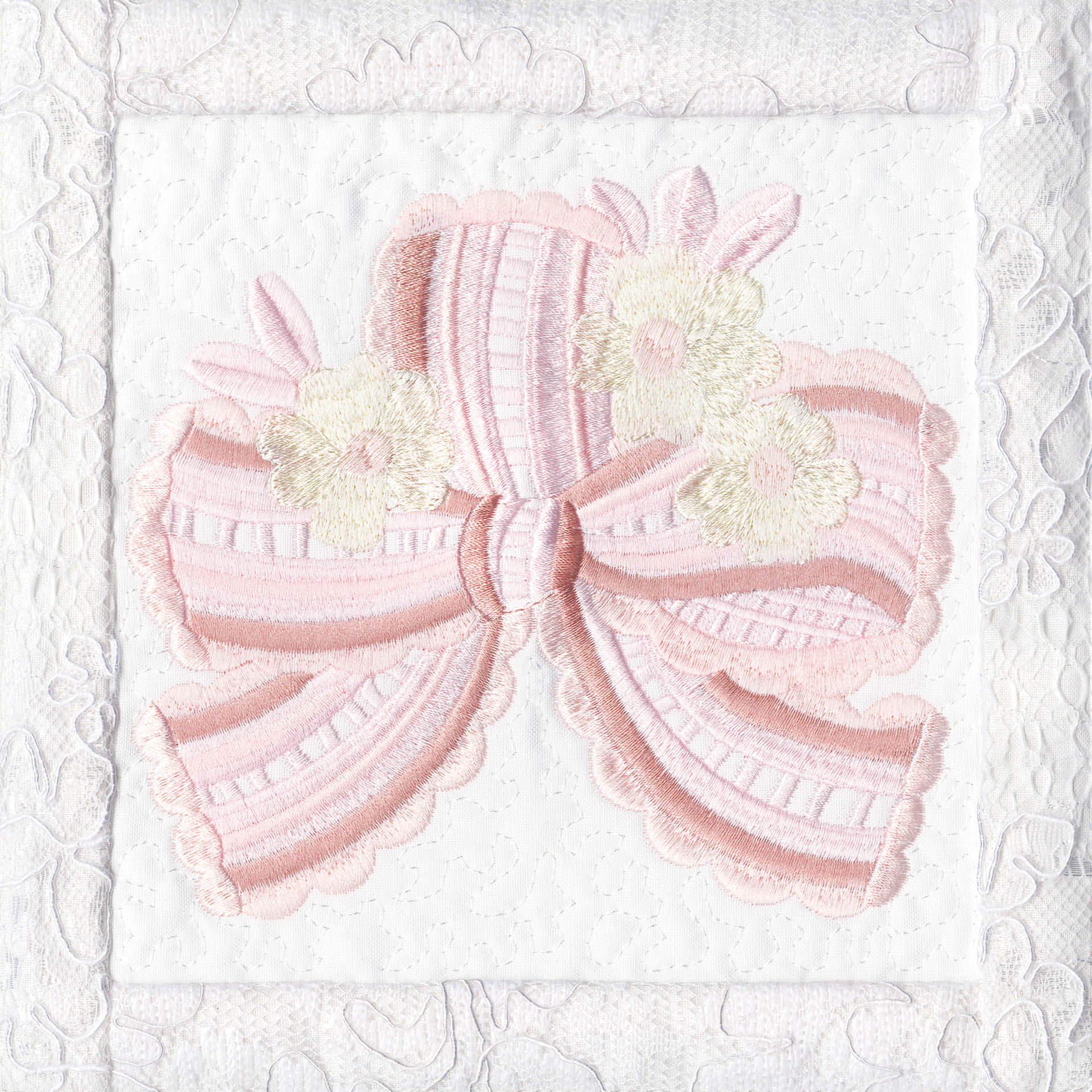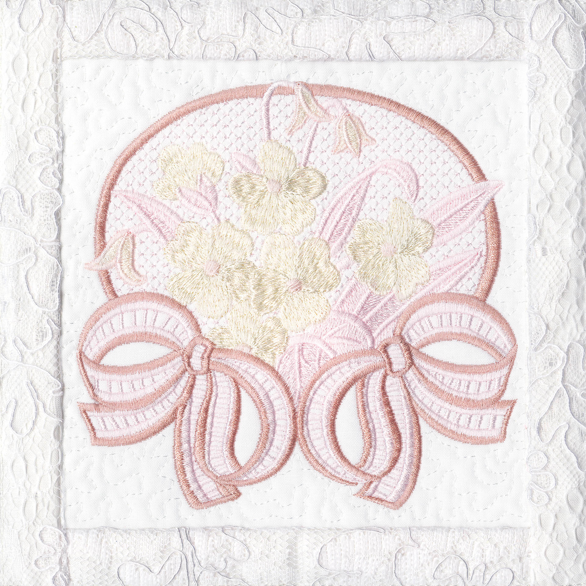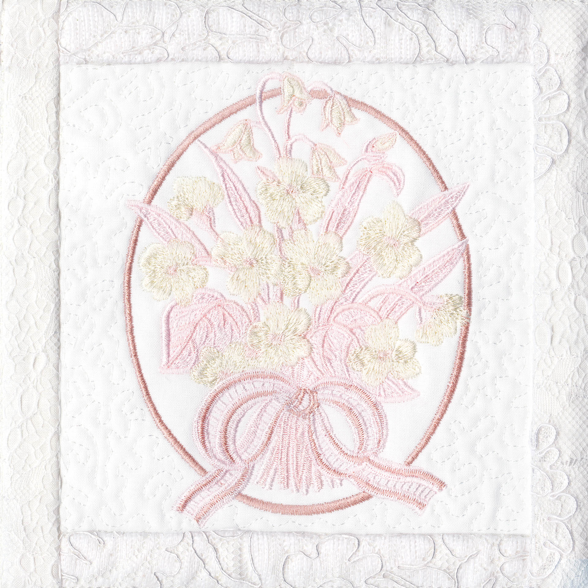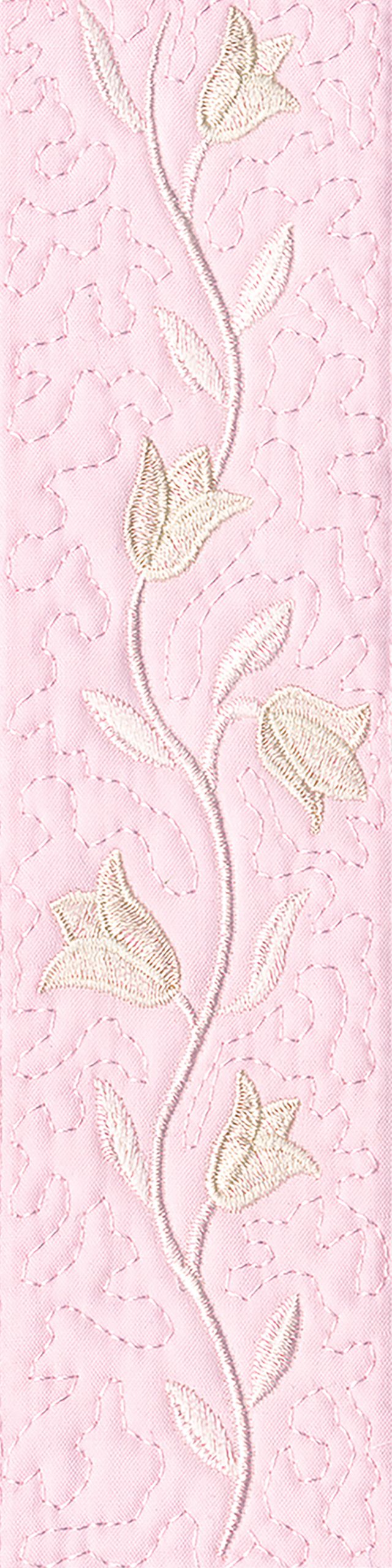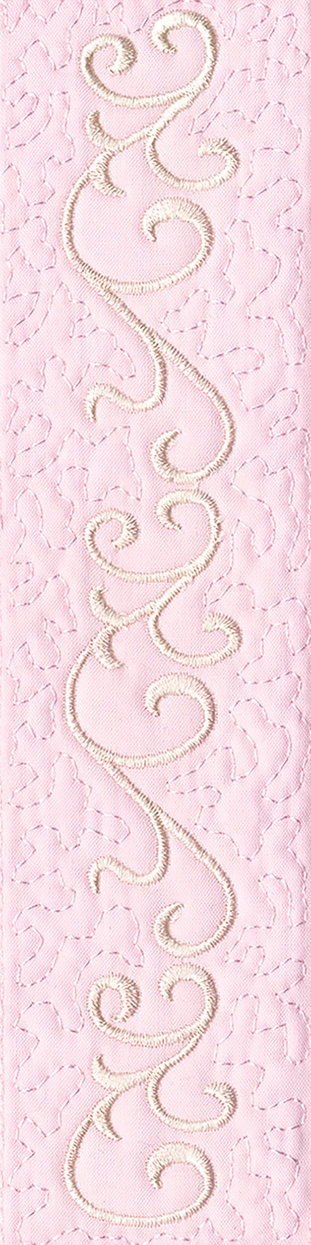 Blushing Impressions is a combination of small fancy floral motifs, scrolls, fans, ocean shells & decorative elements. We wanted to create a quilting collection with an overall vintage feel inspired by the cutwork technique. Although Blushing Impressions has no cutwork at all, the embroidery designs for each quilt block mimic the time-honored look.