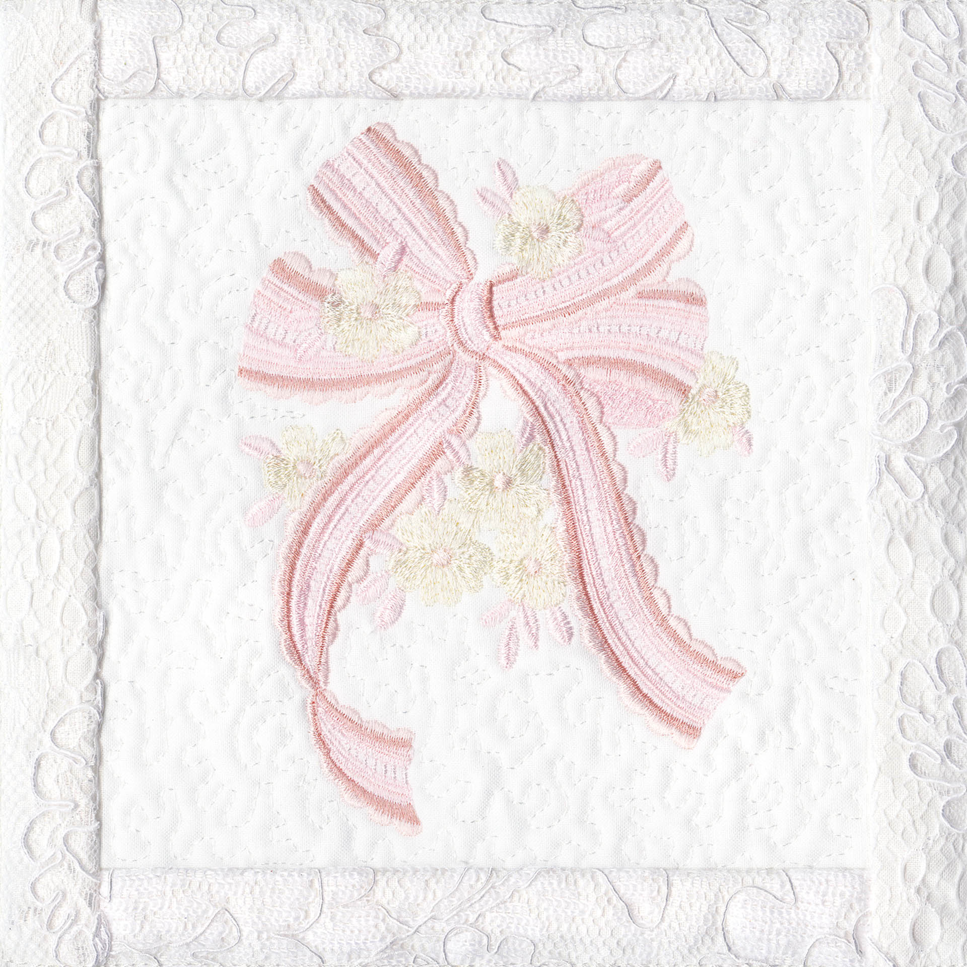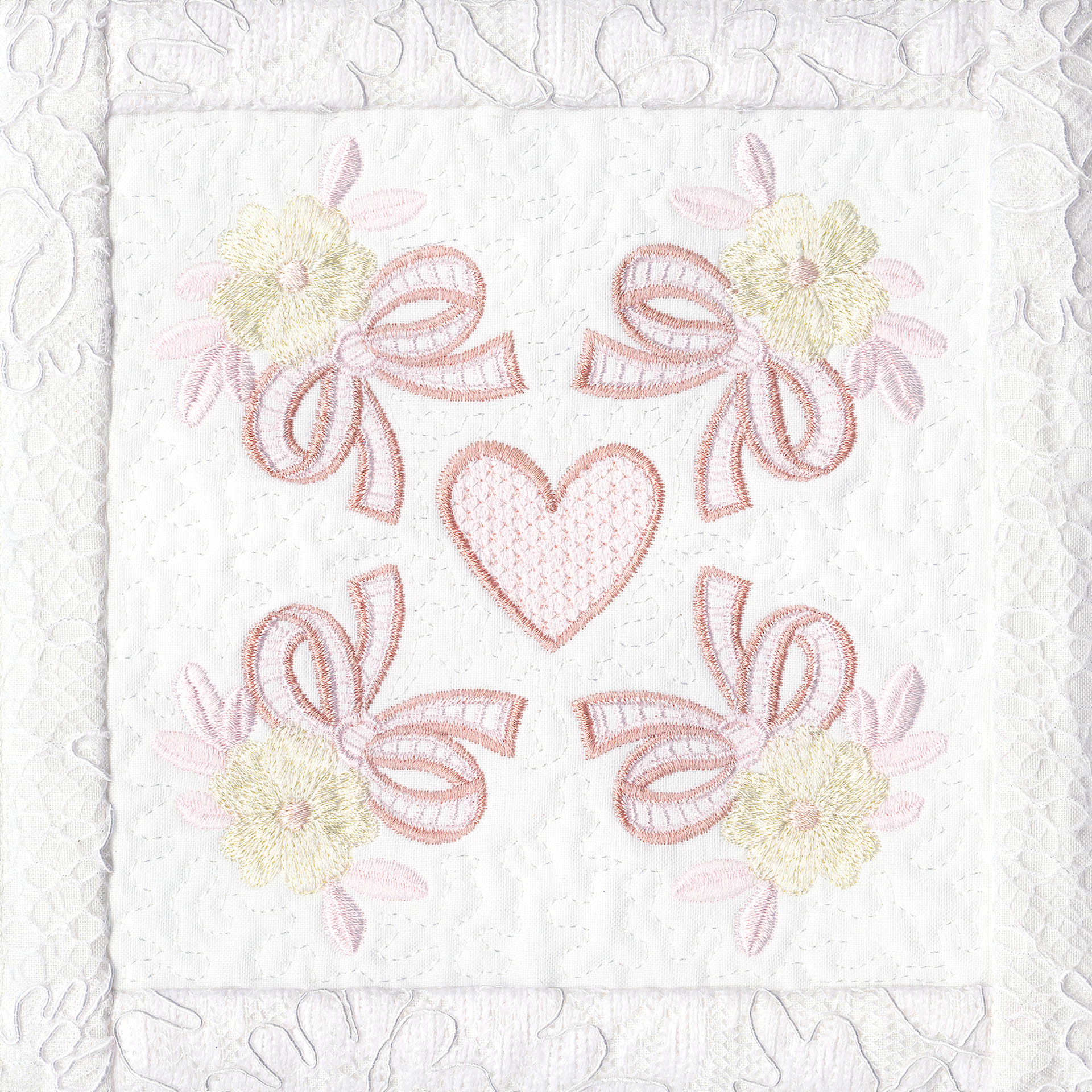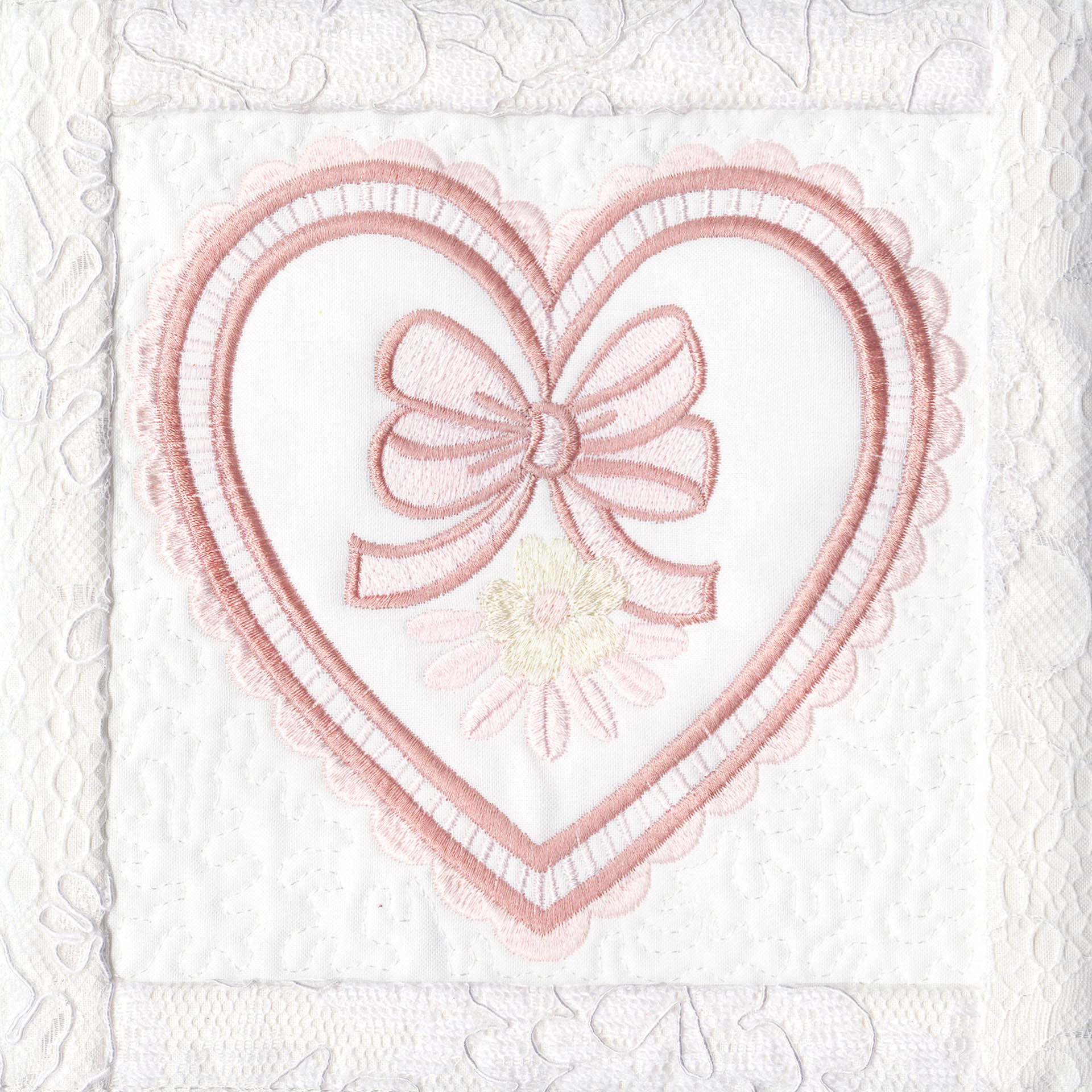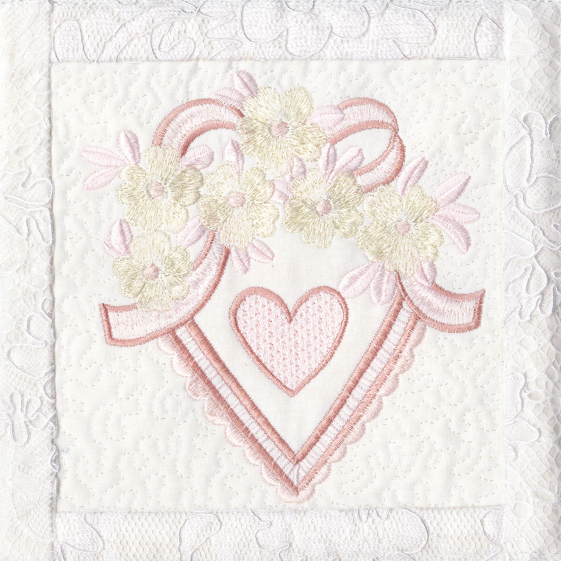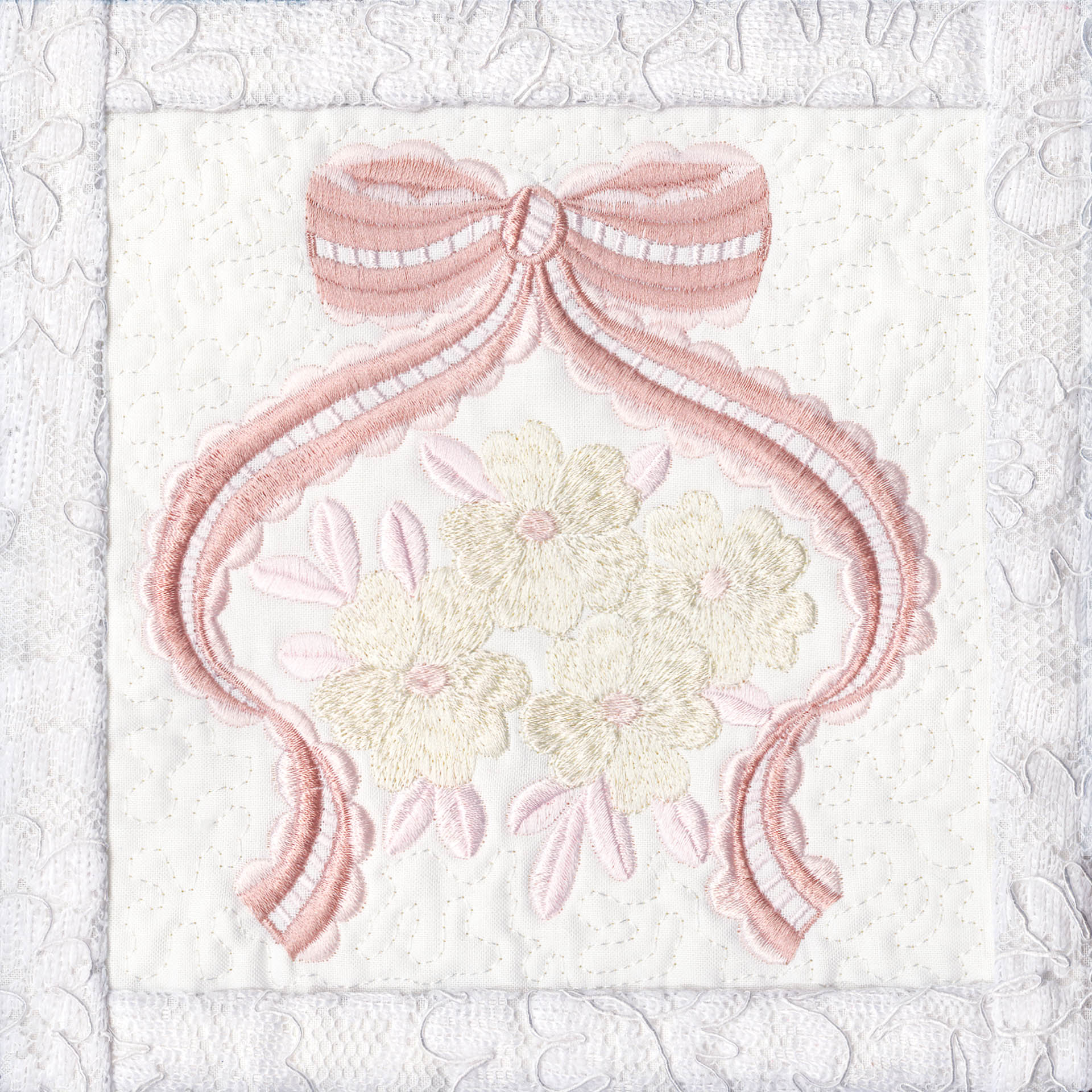 Blushing Impressions is a combination of small fancy floral motifs, scrolls, fans, ocean shells & decorative elements. We wanted to create a quilting collection with an overall vintage feel inspired by the cutwork technique. Although Blushing Impressions has no cutwork at all, the embroidery designs for each quilt block mimic the time-honored look.
