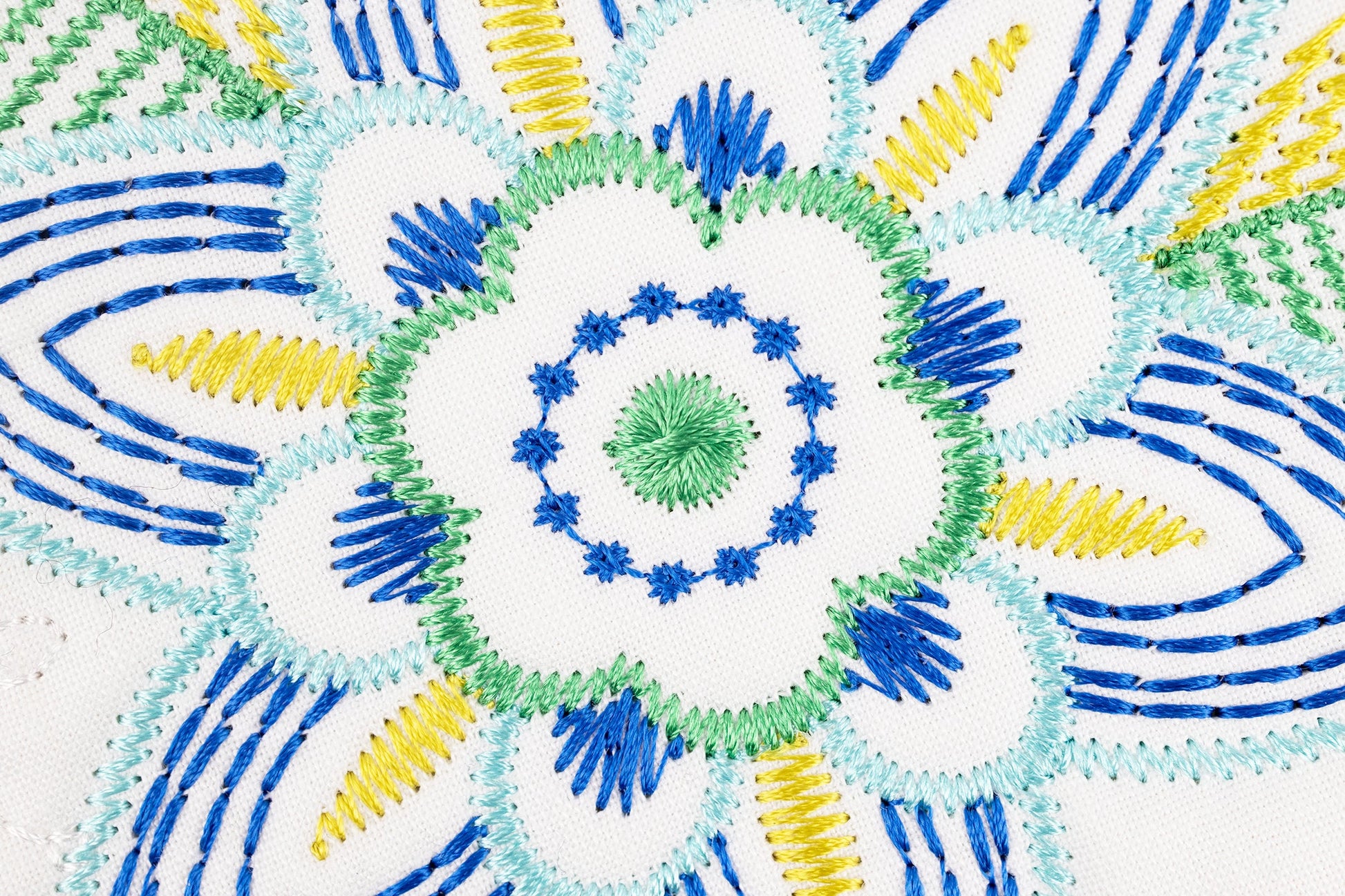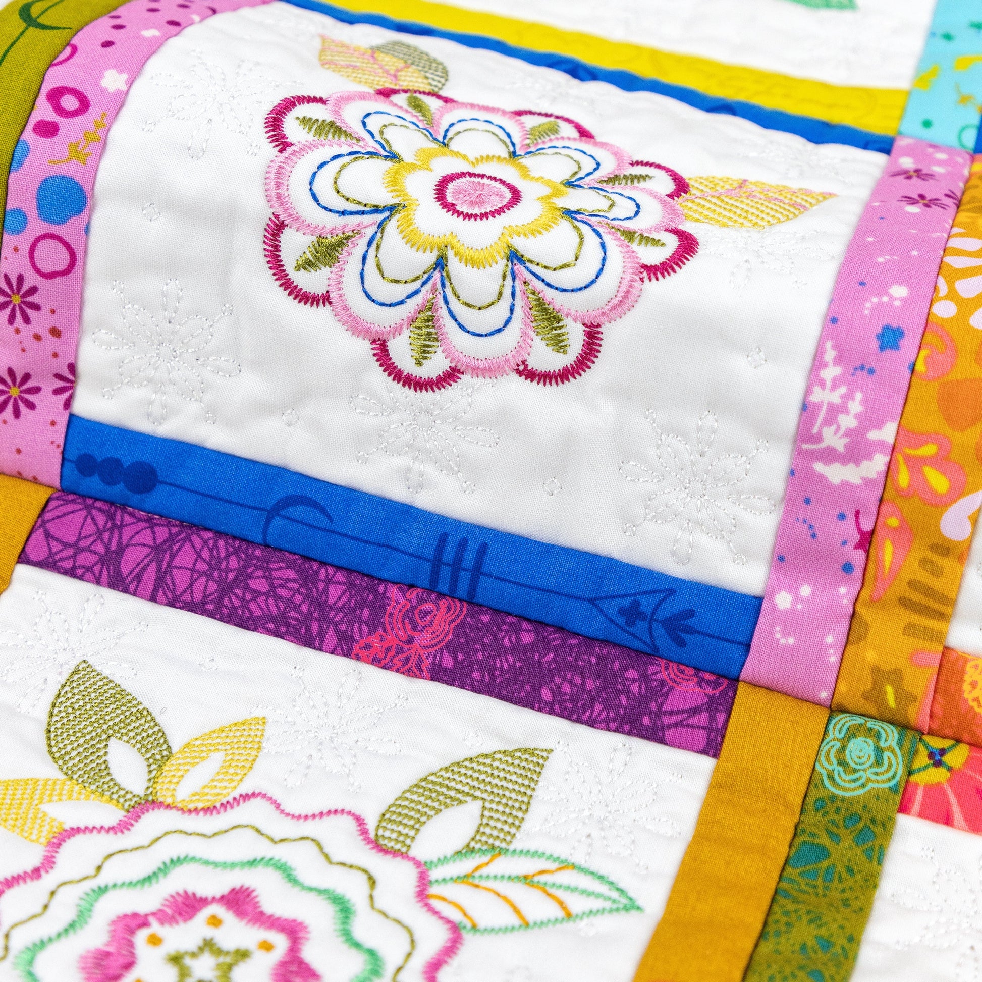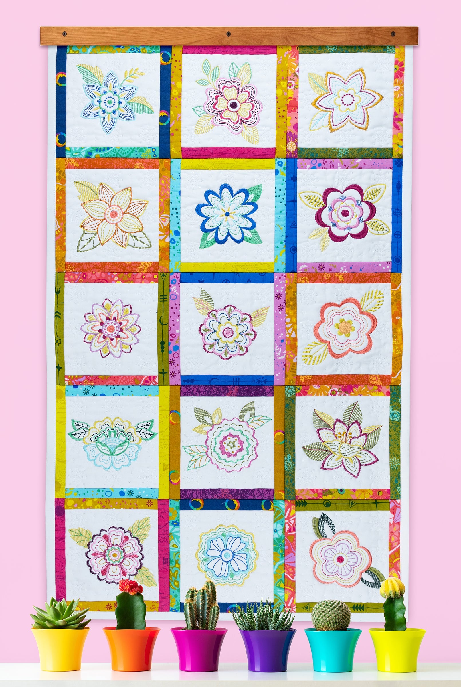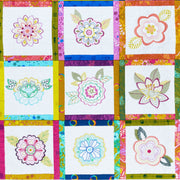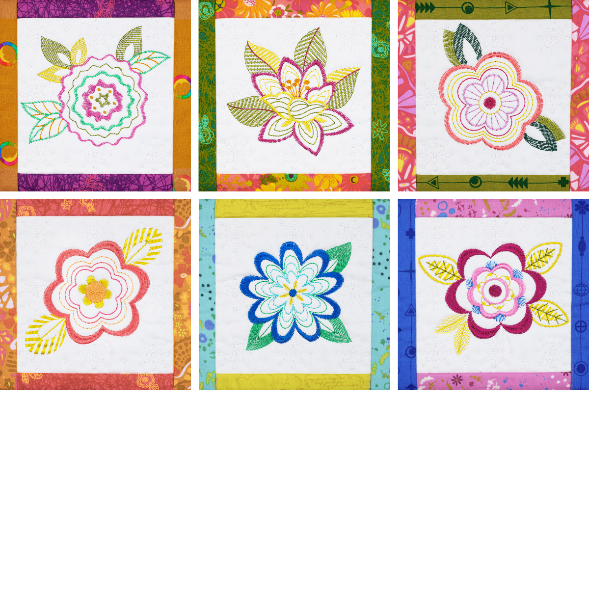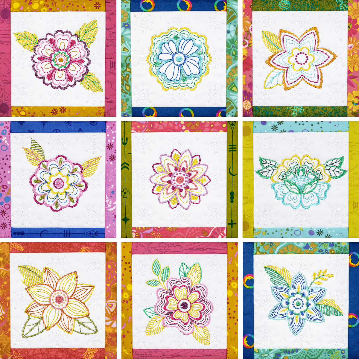This groovy collection is all about flower power! Bohemian art is notable for its eclectic mix of various patterns, colors, and nature-themed motifs. Each block has folded fabric borders for clean edges that gives the final project a seamless look! The flower designs are digitized with traditional, hand-stitched style stitch patterns like chain, satin, running, and faux french knots. The backgrounds in each quilt block have floral motif quilting stitches so there are no empty looking spaces and adds extra detailing!