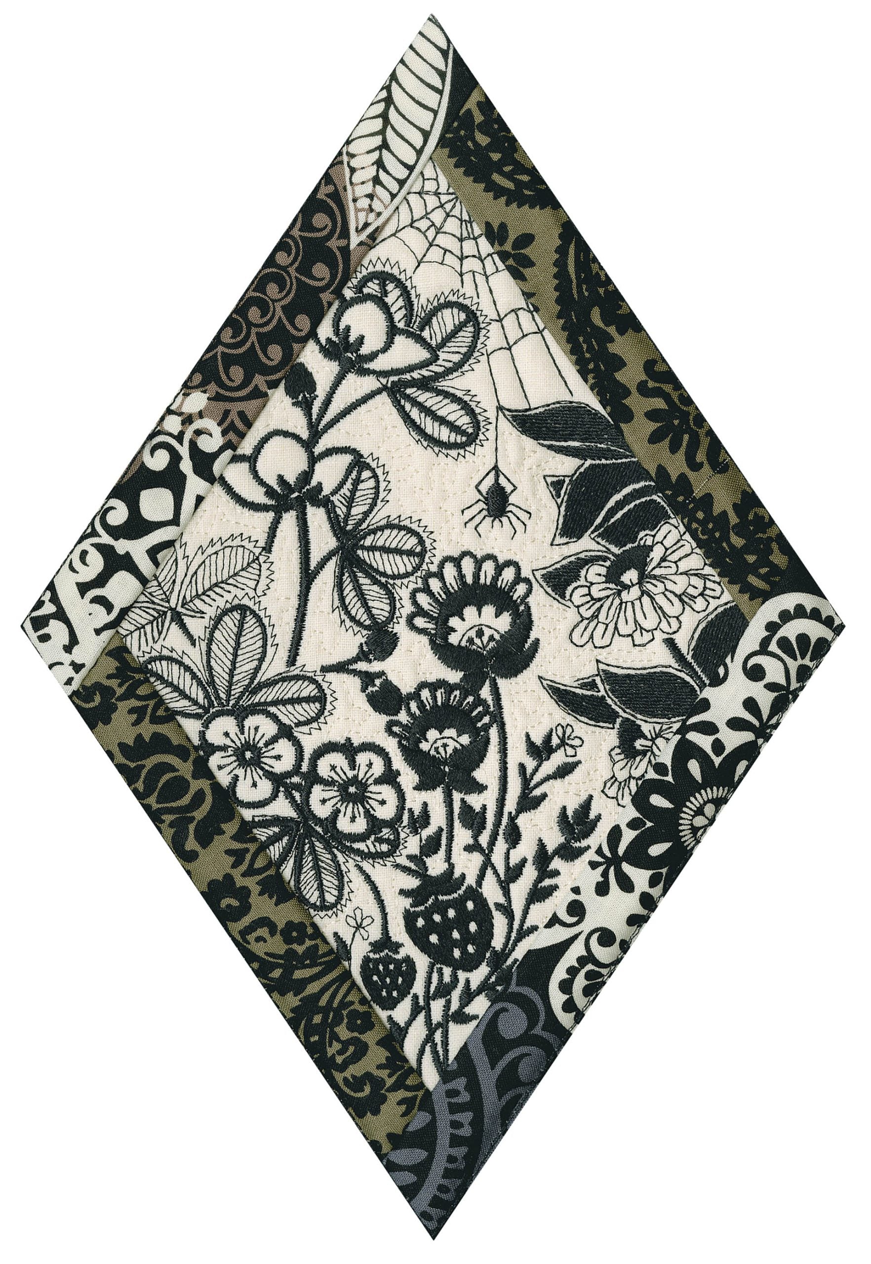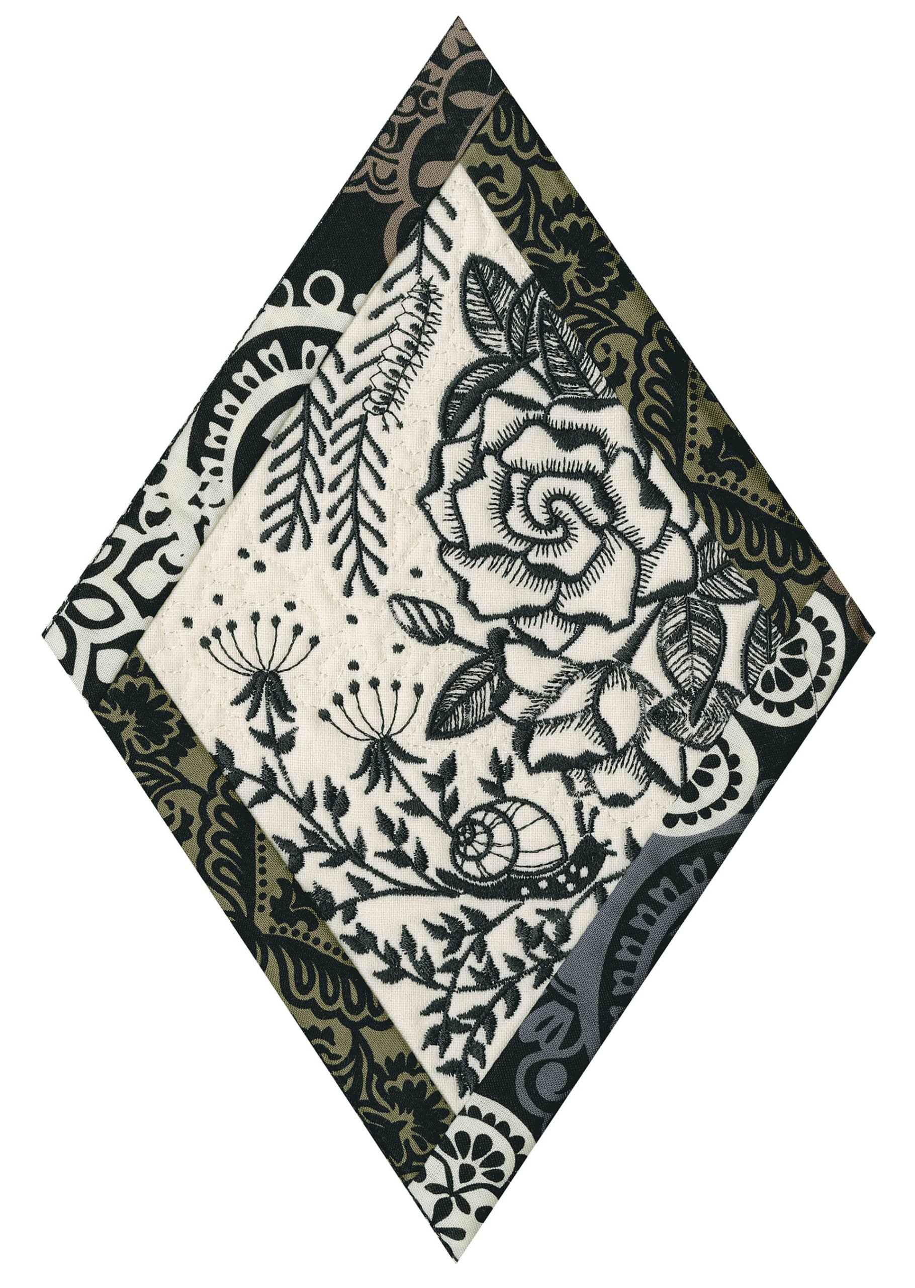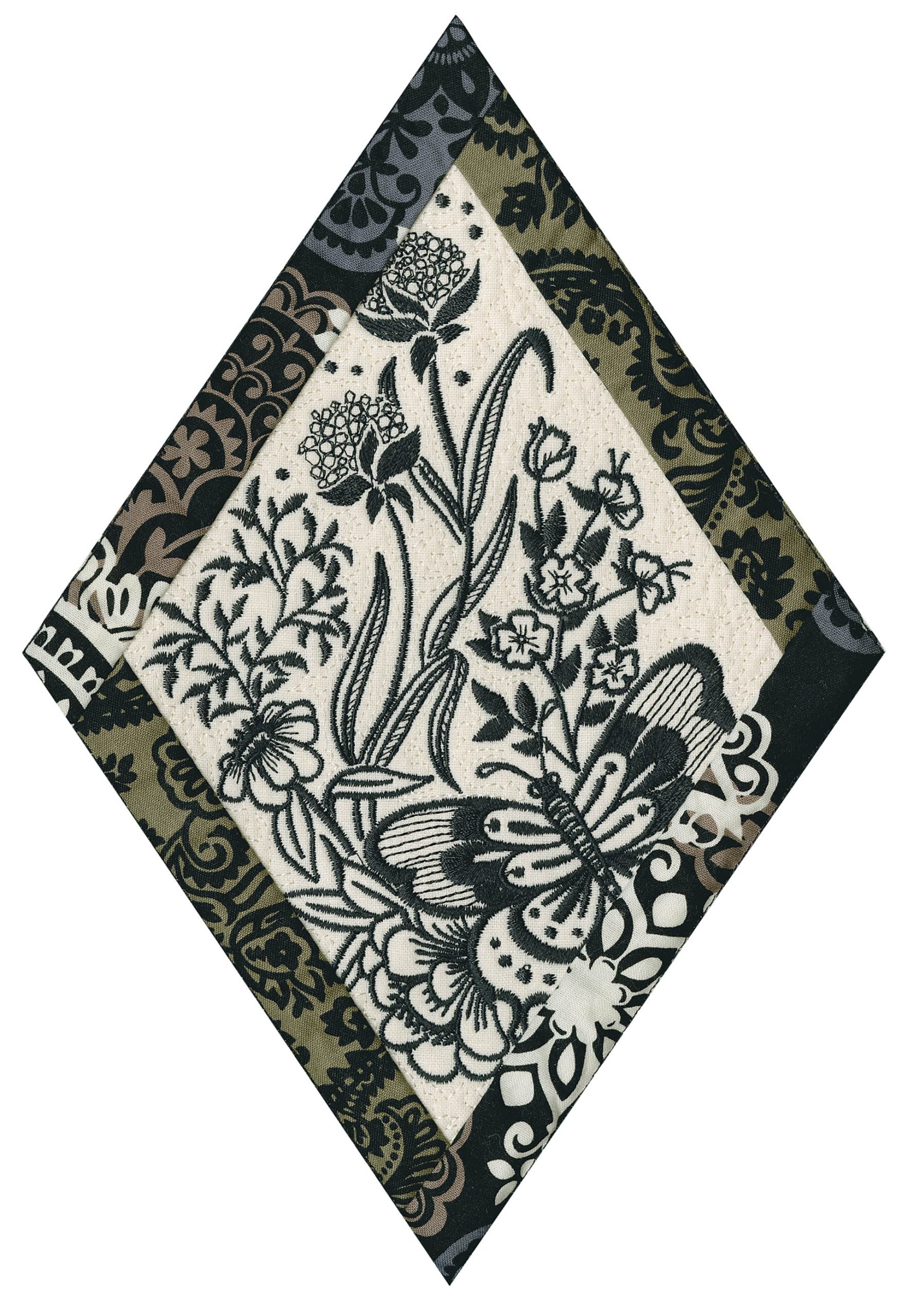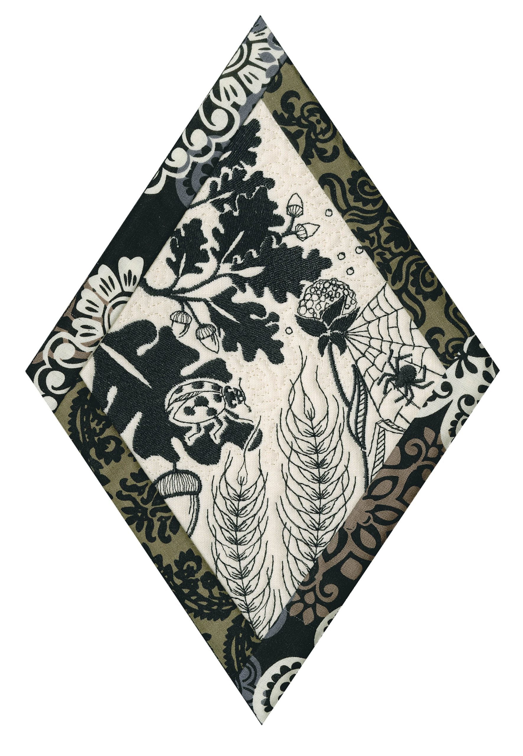 We wanted to create a quilting collection that didn’t use a square as the base. We decided to design the Botanical Impressions collection using the harlequin diamond instead. The designs themselves were designed to be stitched in one color and contain beautiful flora and fauna elements. There is a huge amount of detail in every one of these designs. Every time you look at them you will notice something new! Each block is bordered with a 3/4” folded fabric border so that you don’t need to add one later. There are 4 different shapes included in this collection; they are all used to square off the diamond quilt blocks.