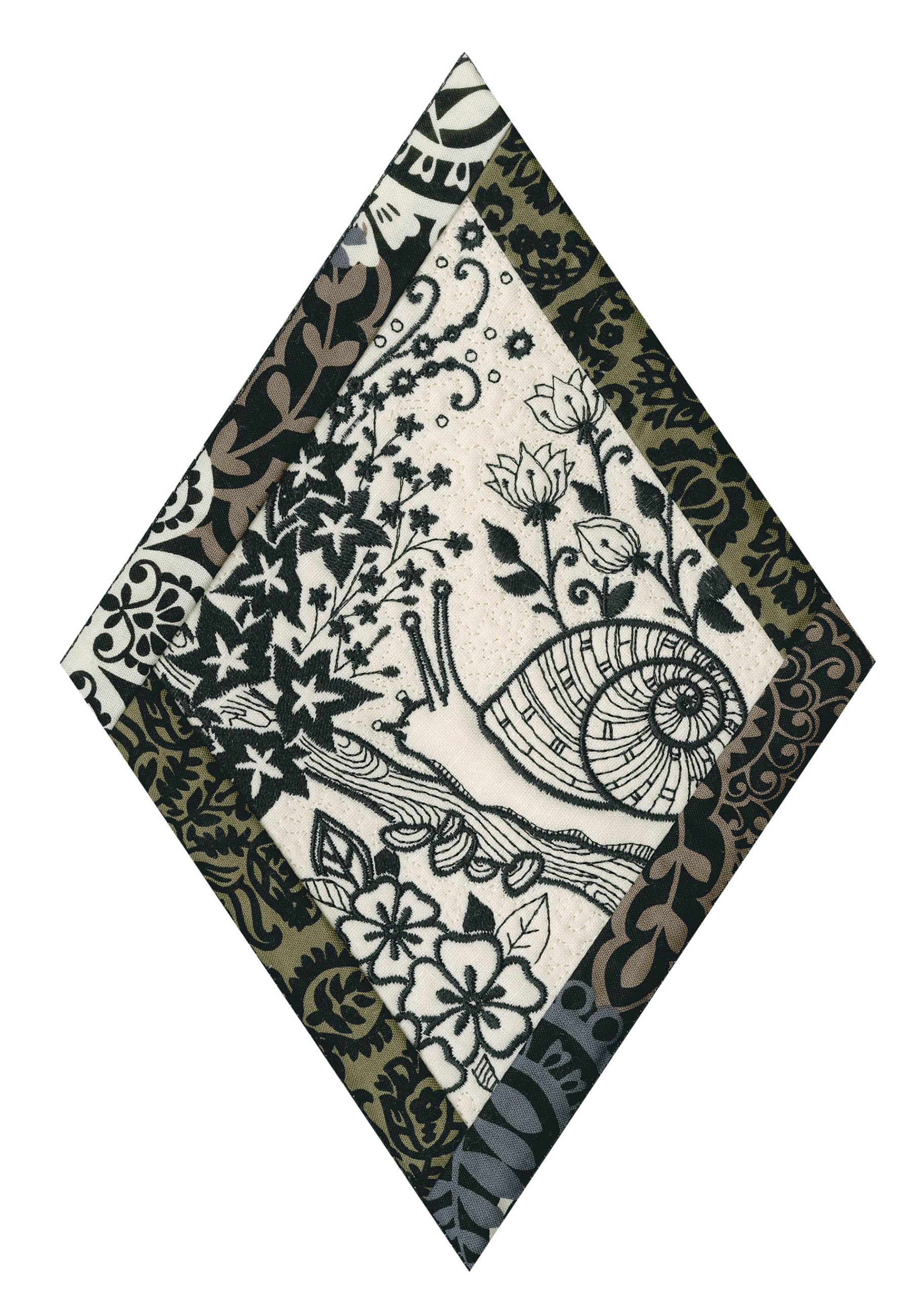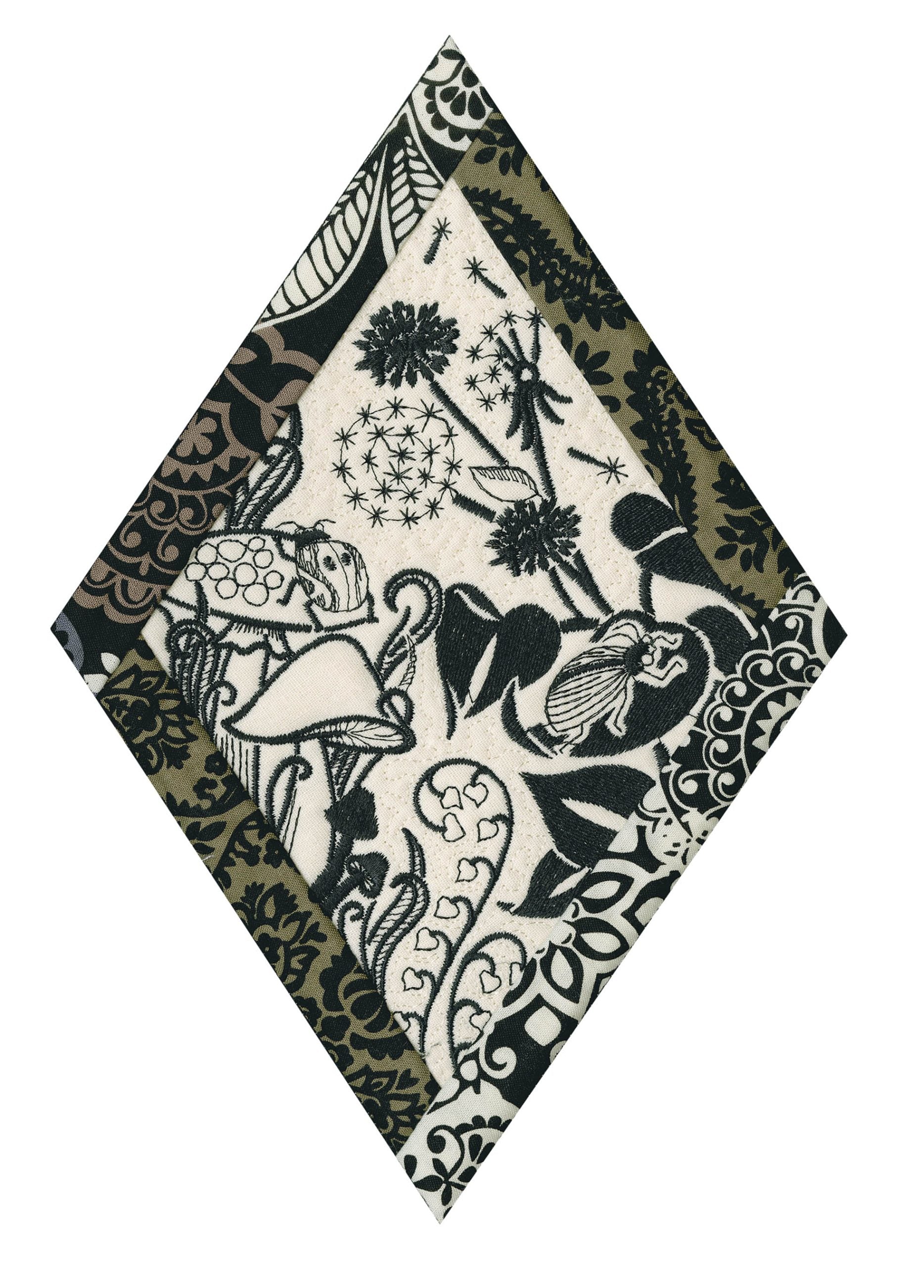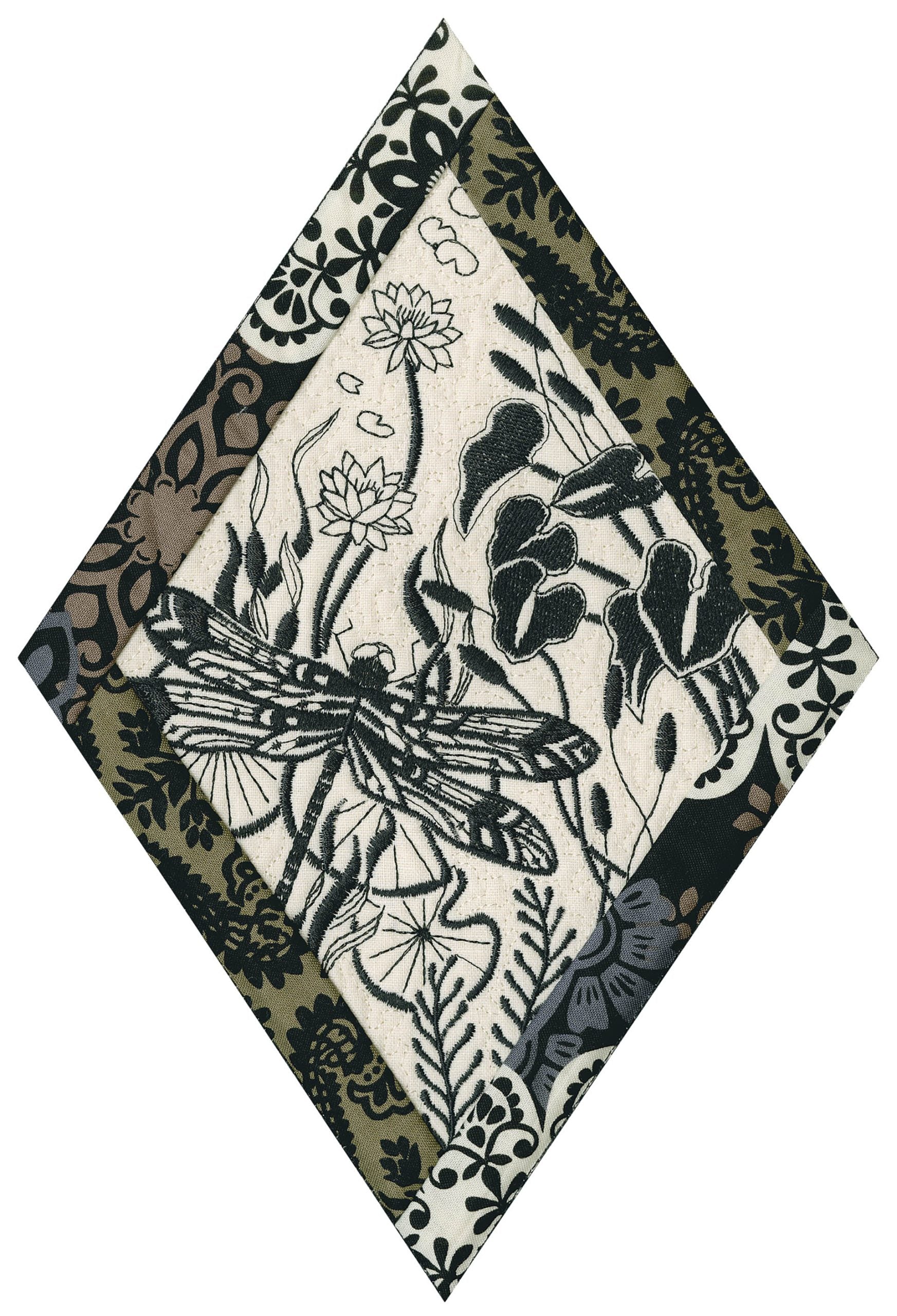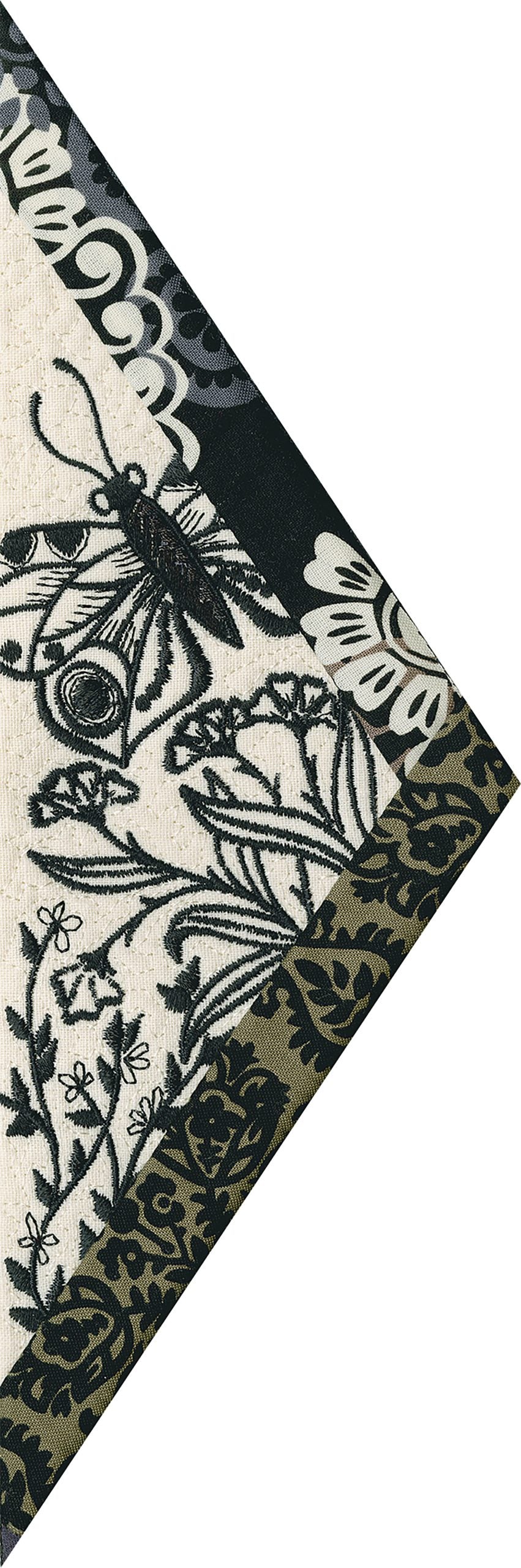 We wanted to create a quilting collection that didn’t use a square as the base. We decided to design the Botanical Impressions collection using the harlequin diamond instead. The designs themselves were designed to be stitched in one color and contain beautiful flora and fauna elements. There is a huge amount of detail in every one of these designs. Every time you look at them you will notice something new! Each block is bordered with a 3/4” folded fabric border so that you don’t need to add one later. There are 4 different shapes included in this collection; they are all used to square off the diamond quilt blocks.