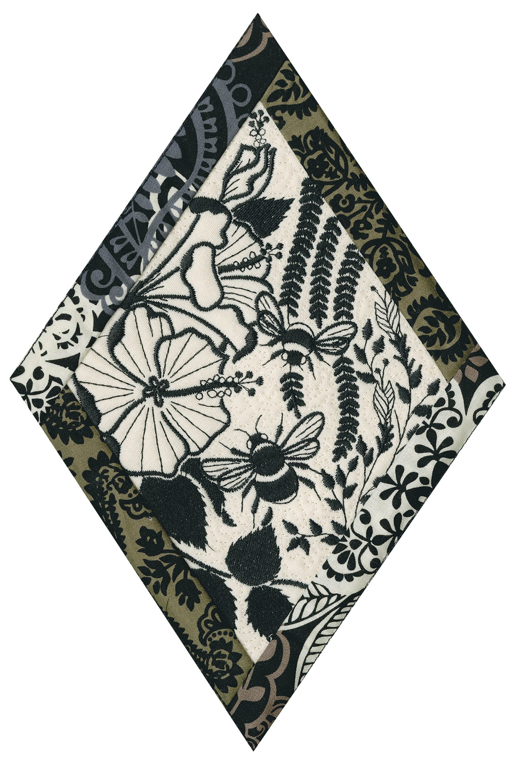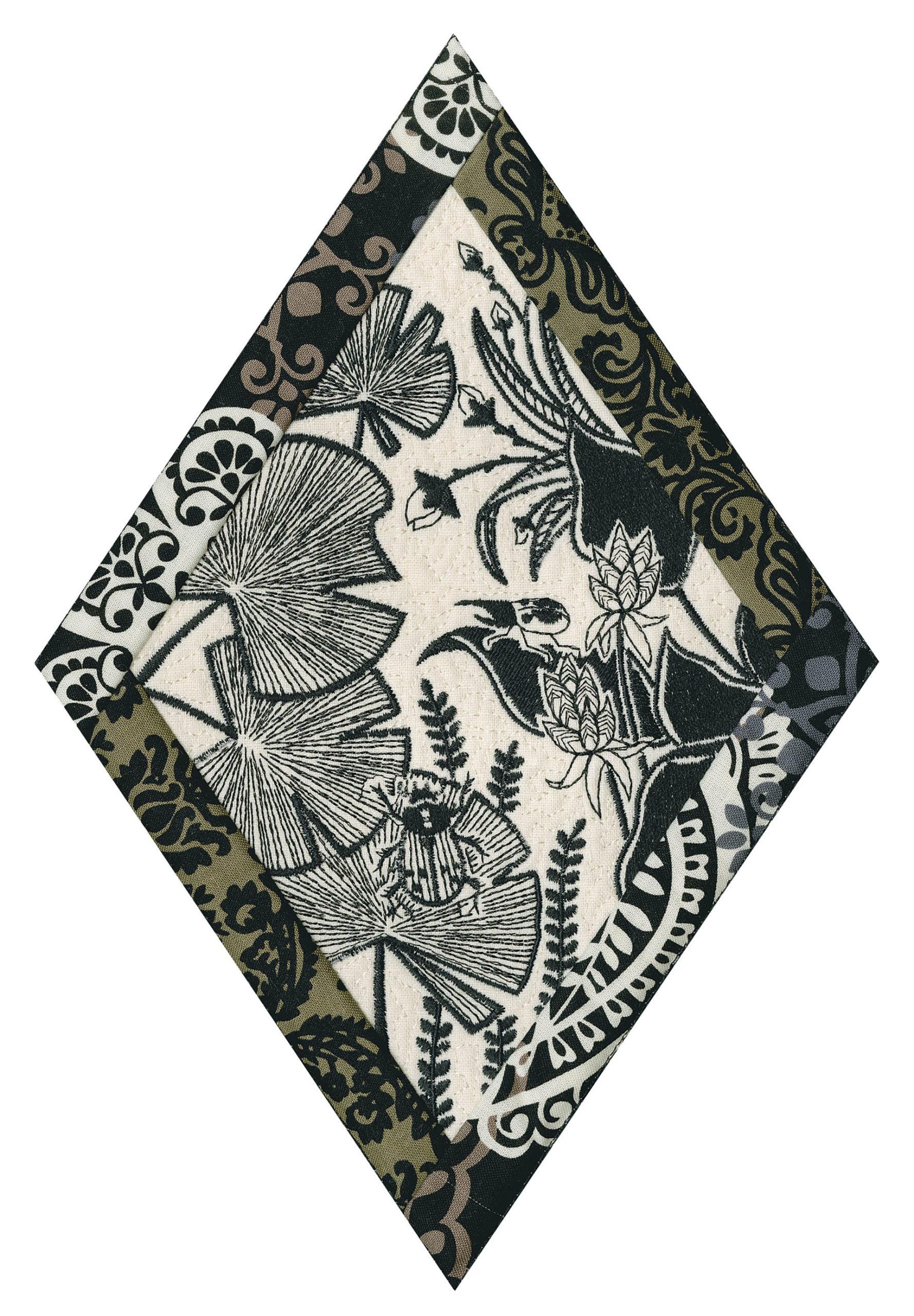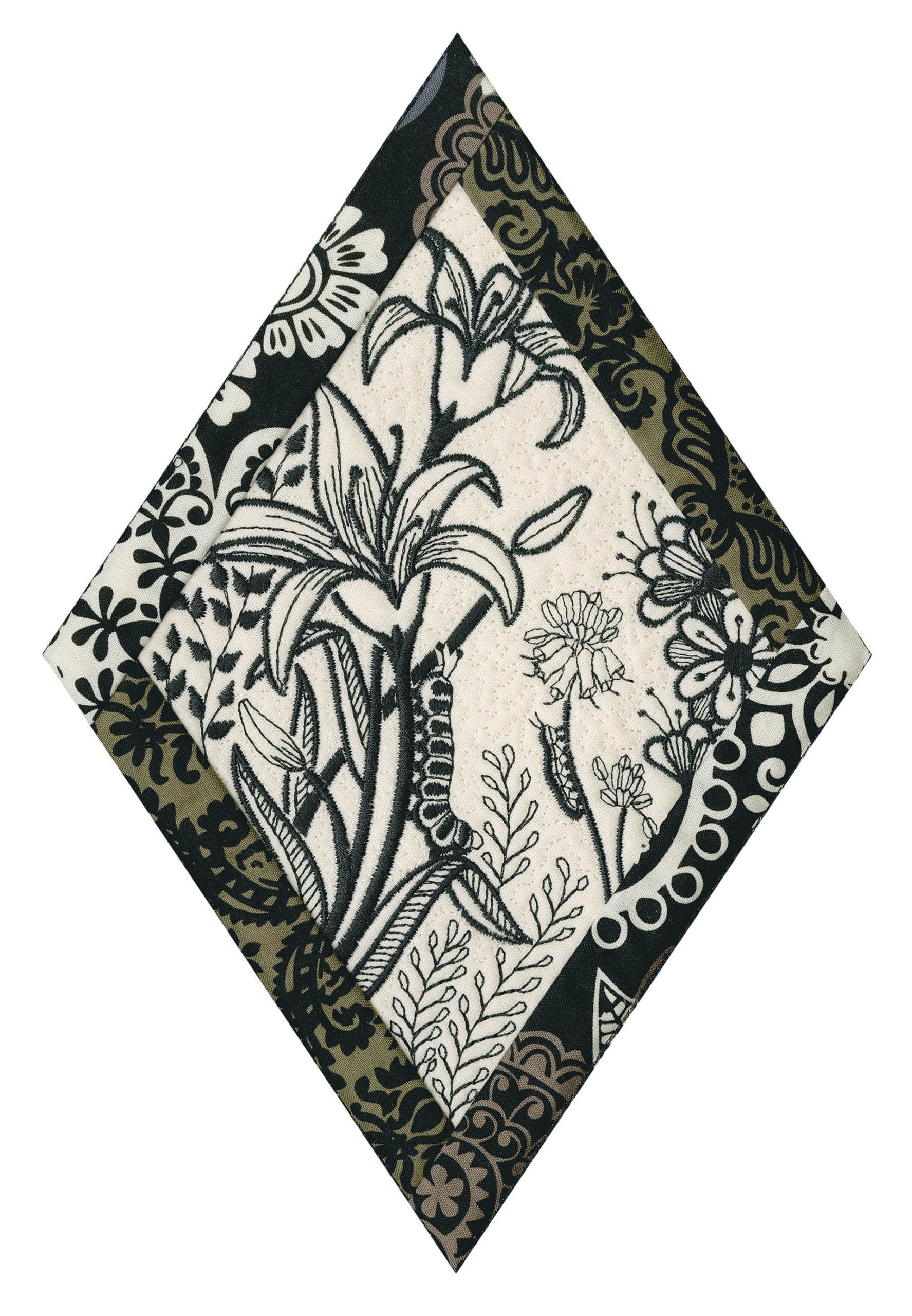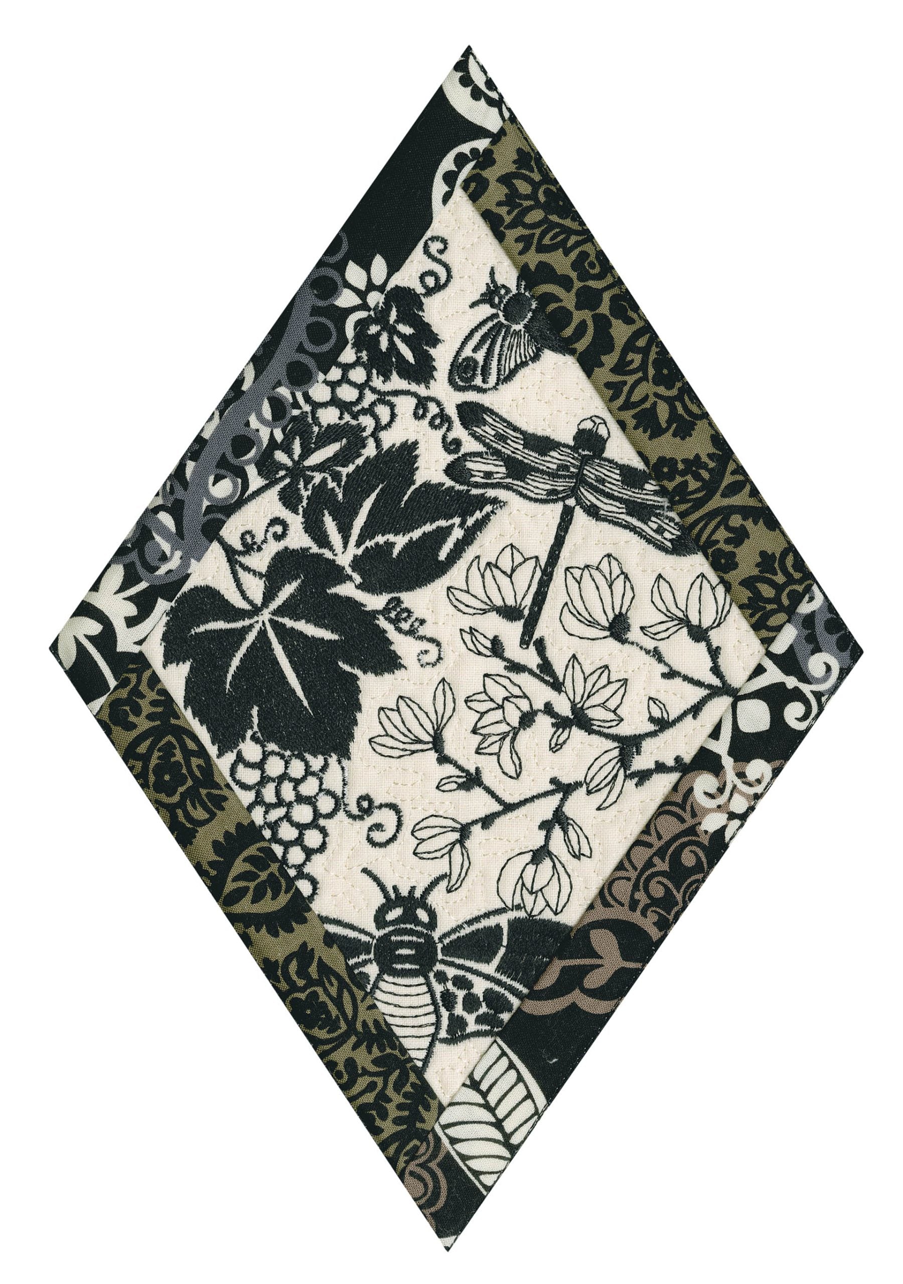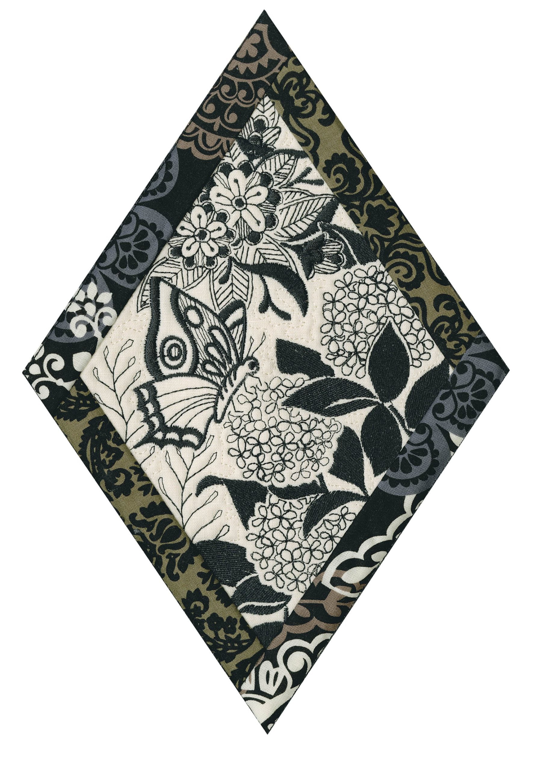 We wanted to create a quilting collection that didn’t use a square as the base. We decided to design the Botanical Impressions collection using the harlequin diamond instead. The designs themselves were designed to be stitched in one color and contain beautiful flora and fauna elements. There is a huge amount of detail in every one of these designs. Every time you look at them you will notice something new! Each block is bordered with a 3/4” folded fabric border so that you don’t need to add one later. There are 4 different shapes included in this collection; they are all used to square off the diamond quilt blocks.