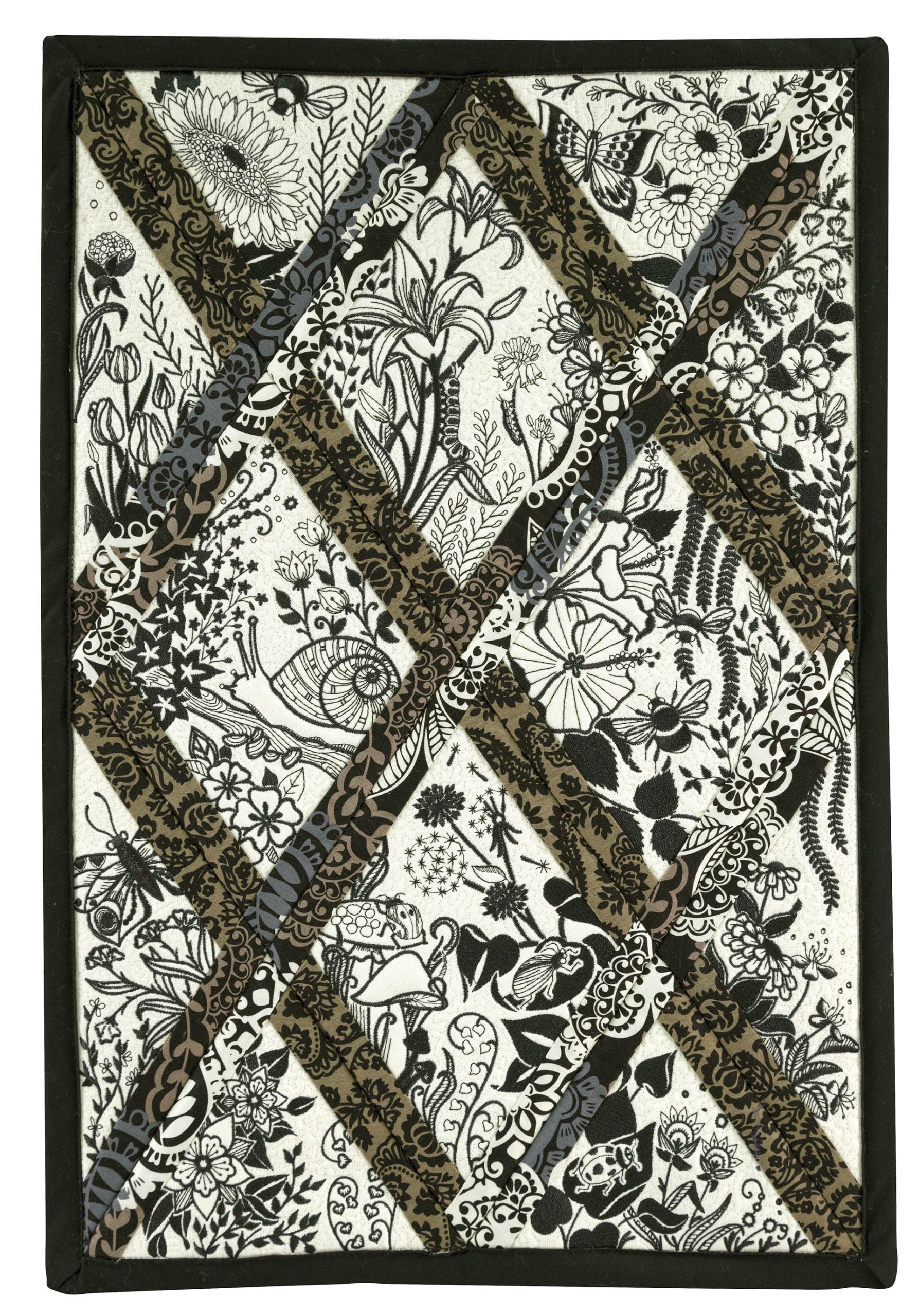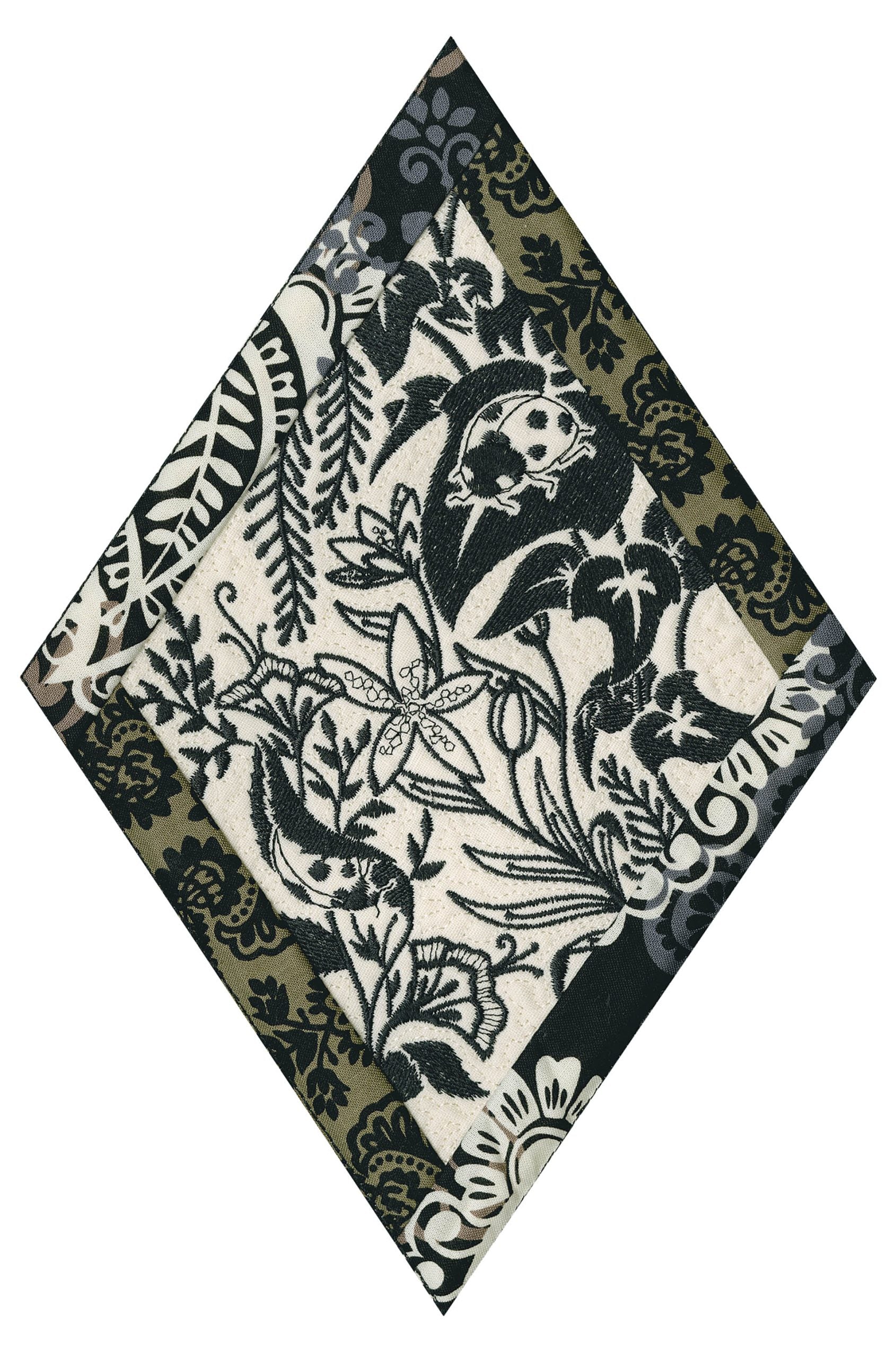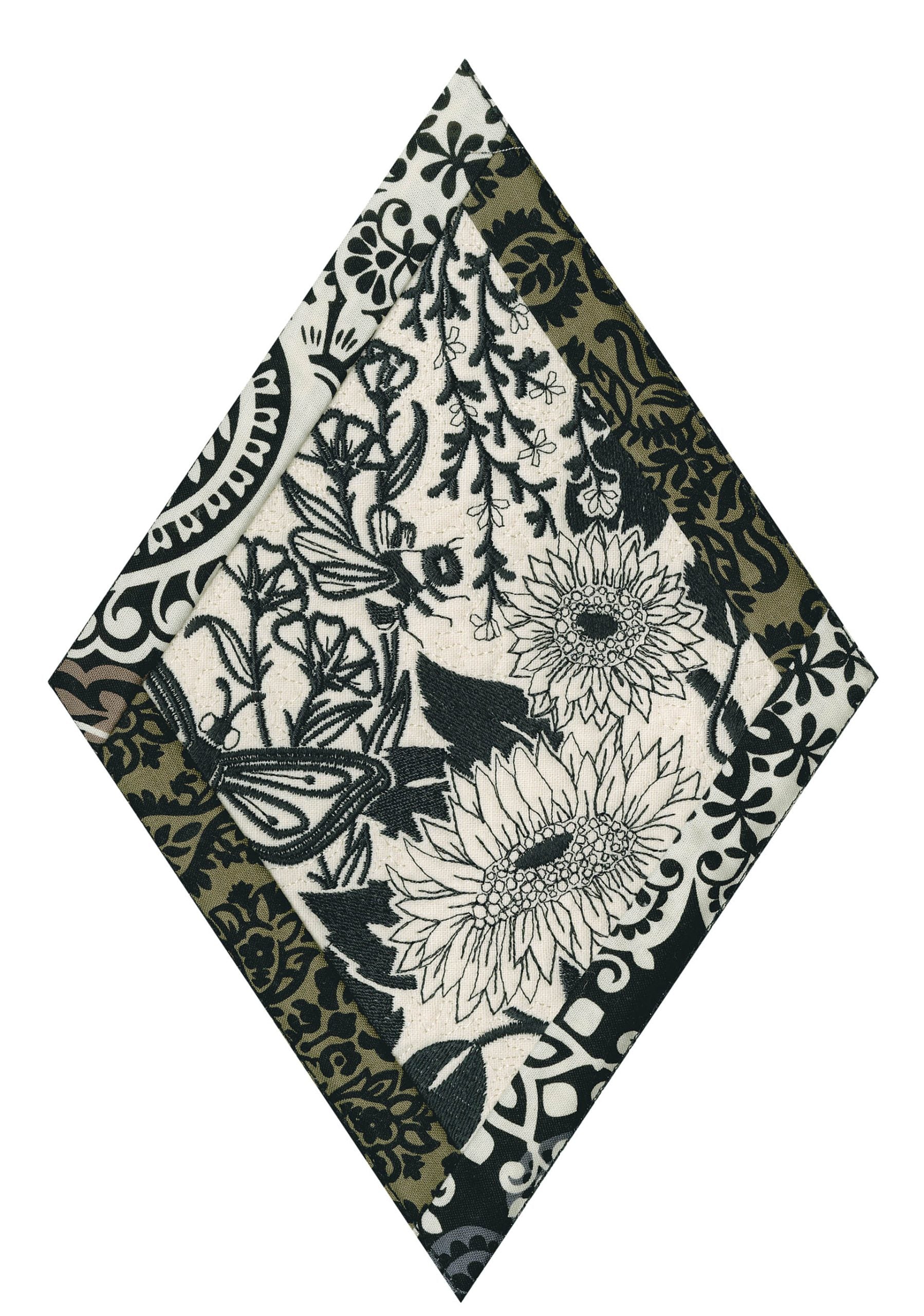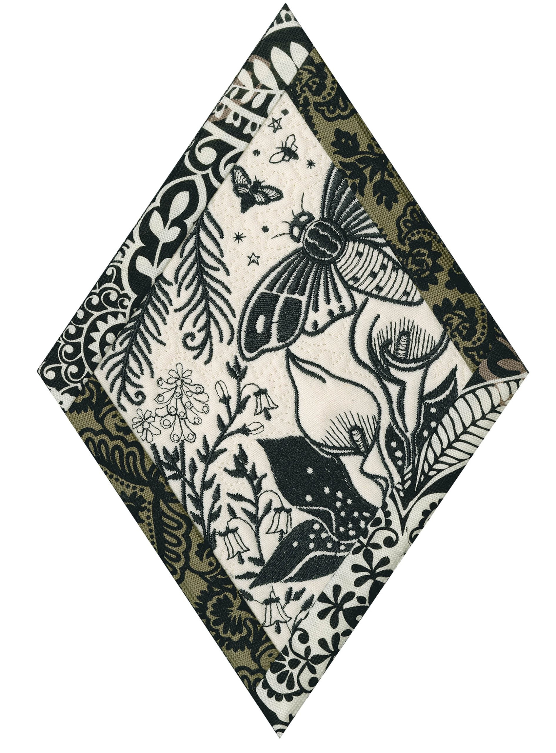 We wanted to create a quilting collection that didn’t use a square as the base. We decided to design the Botanical Impressions collection using the harlequin diamond instead. The designs themselves were designed to be stitched in one color and contain beautiful flora and fauna elements. There is a huge amount of detail in every one of these designs. Every time you look at them you will notice something new! Each block is bordered with a 3/4” folded fabric border so that you don’t need to add one later. There are 4 different shapes included in this collection; they are all used to square off the diamond quilt blocks.