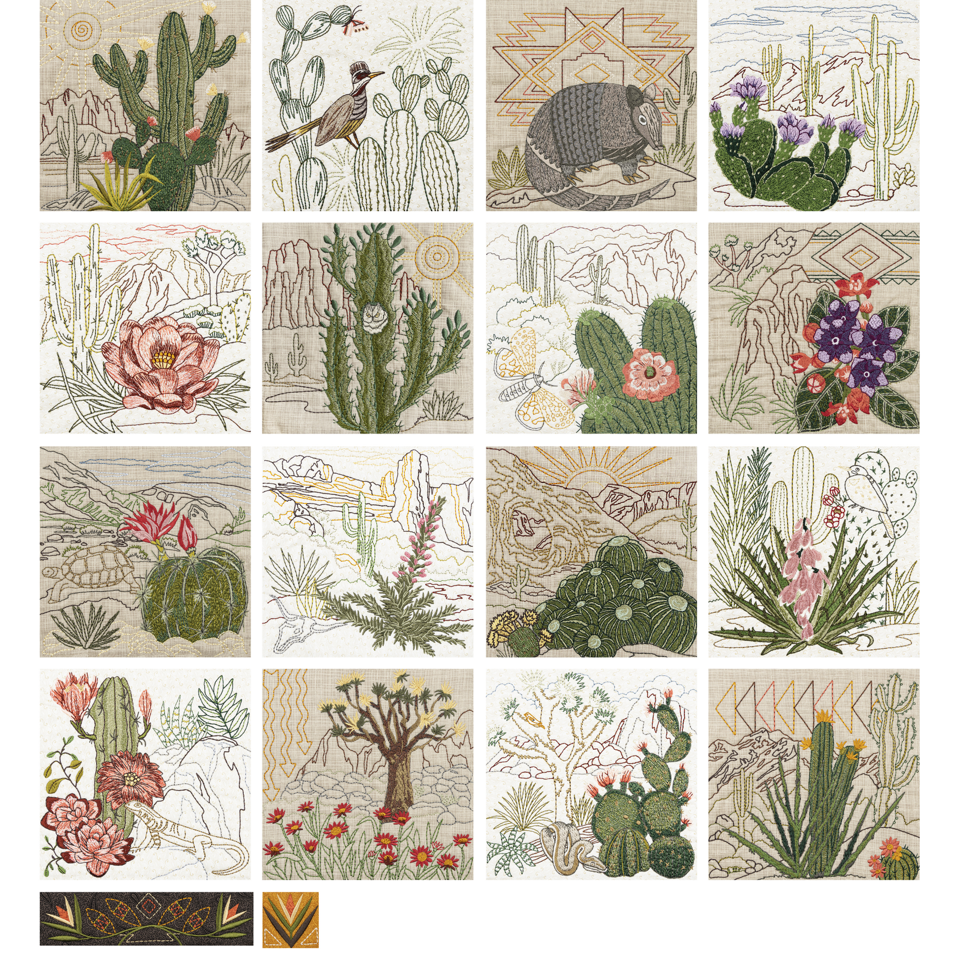 Cacti & Creatures is the perfect combination of hidden appliqué and delicate bean stitching, with each design specially-digitized for a realistic finish! Upon closer look, you will notice the detail in the prickly spines of the cacti and even on the armadillo’s armor. With 18 different block designs to choose from, this collection has it all!