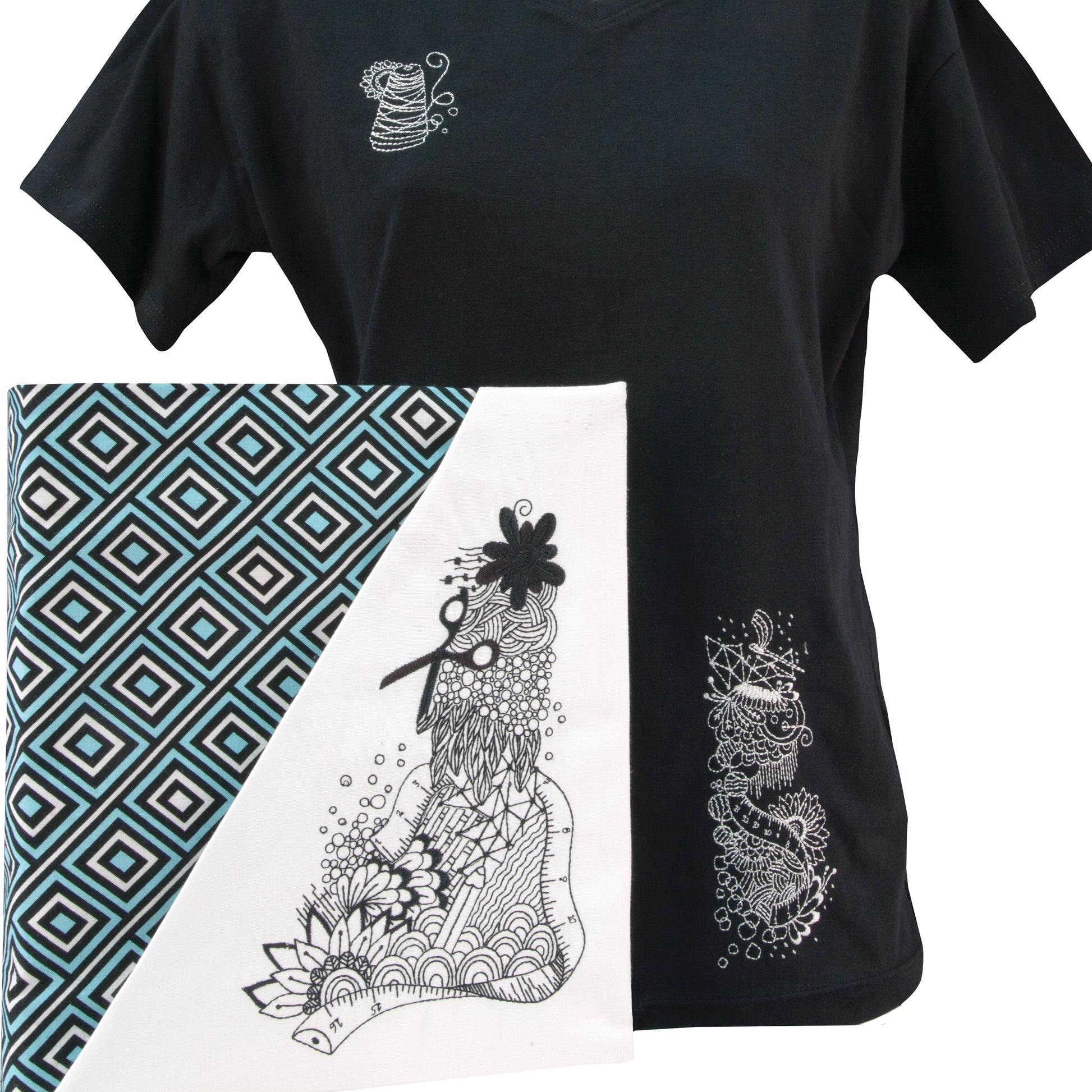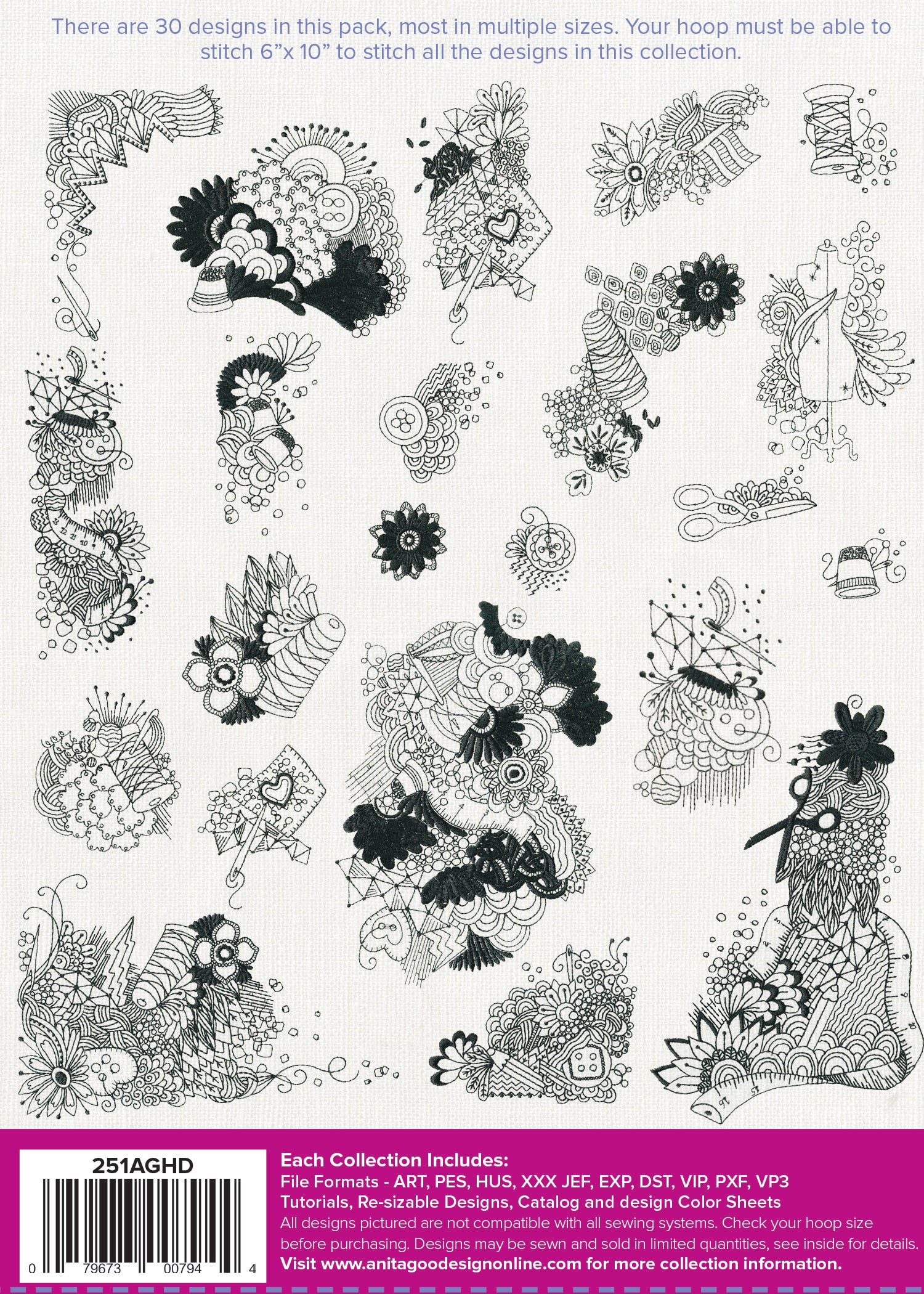 If you have ever attended one of our Anita’s Embroidery Workshops at one of our participating retailers nationwide you probably noticed the beautiful sewing doodle designs on the newspapers that you receive with each class. Carol Lantis, one of the artists at Anita Goodesign, created those doodles. We have had dozens of requests to digitize those doodles and make them available as a collection. Your wishes came true. Carol created over 30 different doodles for this collection and each of the pieces of art are truly unique. Every time you look at one of these designs you will notice something different. Hidden inside the doodles are scissors, needles and an assortment of other sewing notions. These designs will look wonderful on anything you stitch them on and the best part is that they stitch very quickly since they are all created using only one color of thread and they stitch without stops.