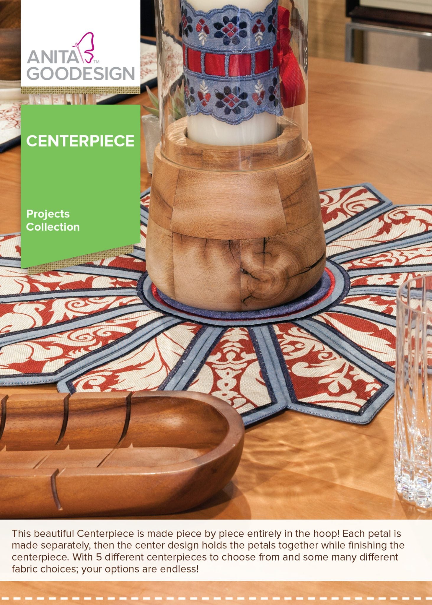 This beautiful Centerpiece is made piece by piece entirely in the hoop! Each petal is made separately, and then the center design holds the petals together while finishing the centerpiece. With 5 different centerpieces to choose from and so many different fabric choices; your options are endless!