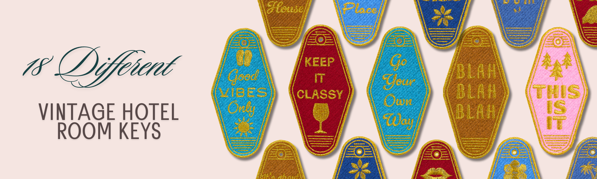 vintage hotel key fobs, travel icons, playful sayings, animals, camping, and outdoor-inspired designs.