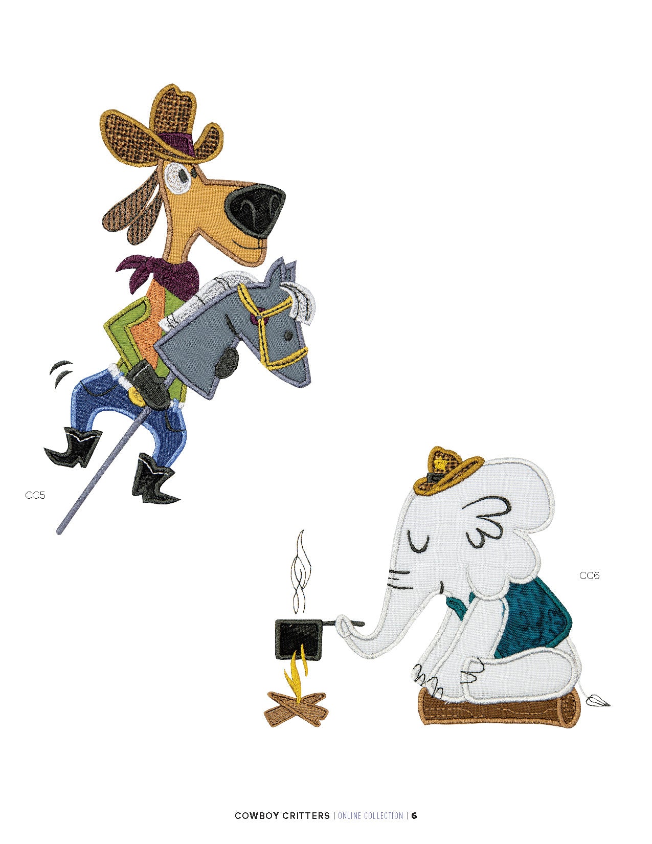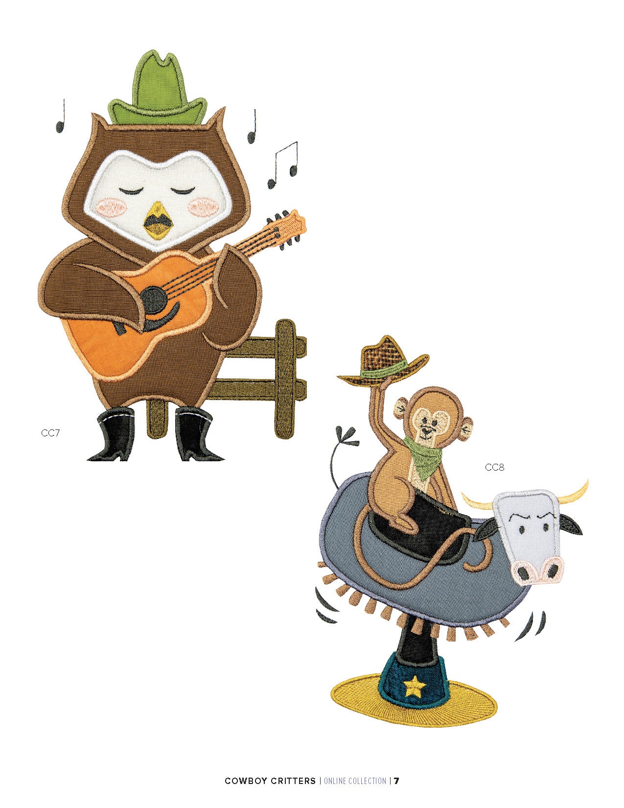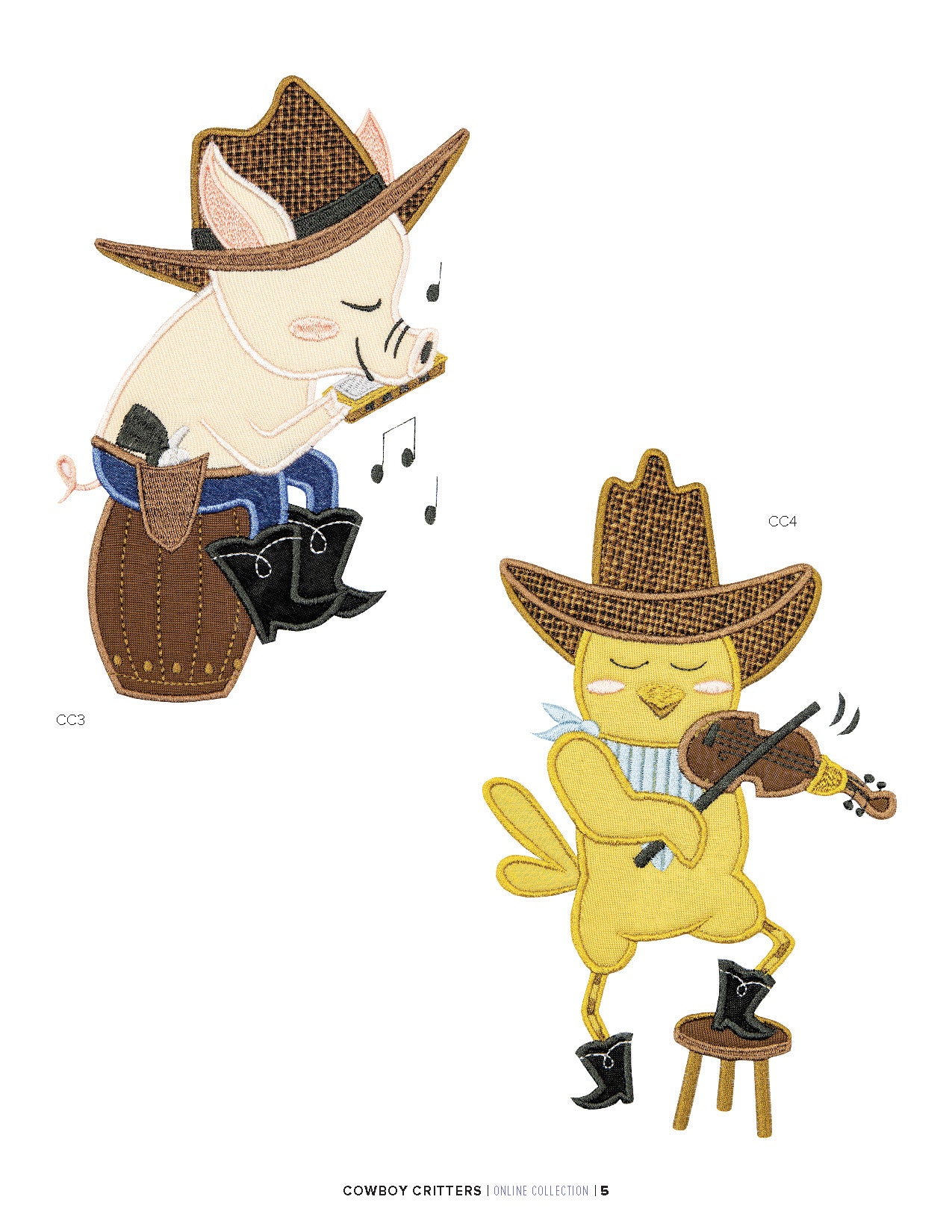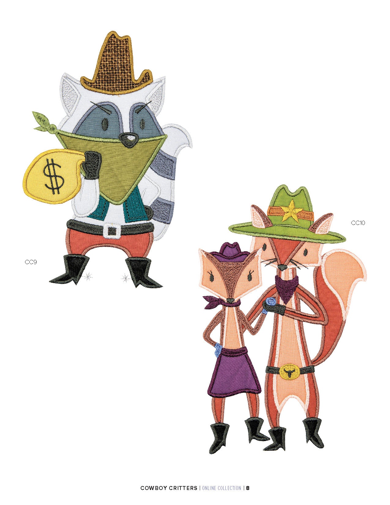 Each design in Cowboy Critters features a perfect blend of standard appliqué and embroidery techniques. We carefully selected fabrics for the appliqué to match the satin stitch outlines, ensuring every design's cohesive and polished look. The combination of appliqué and embroidery adds depth and texture, bringing these charming critters to life.
