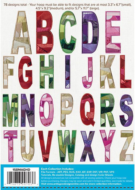 Why should crazy quilting only be used on quilts? We decided to use our crazy quilt technique on a monogramming collection so we designed Crazy Quilt Lettering. Each of the letters come in 3 different sizes so you can easily add either a single letter or three letter monogram to any item you would like to embroider. The designs look beautiful on pillows and tote bags! The designs can look vintage or modern depending on the colors of thread that you choose. We stitched the designs in several color variations so you can see the possibilities. You can also mix different fabric types for exciting results.