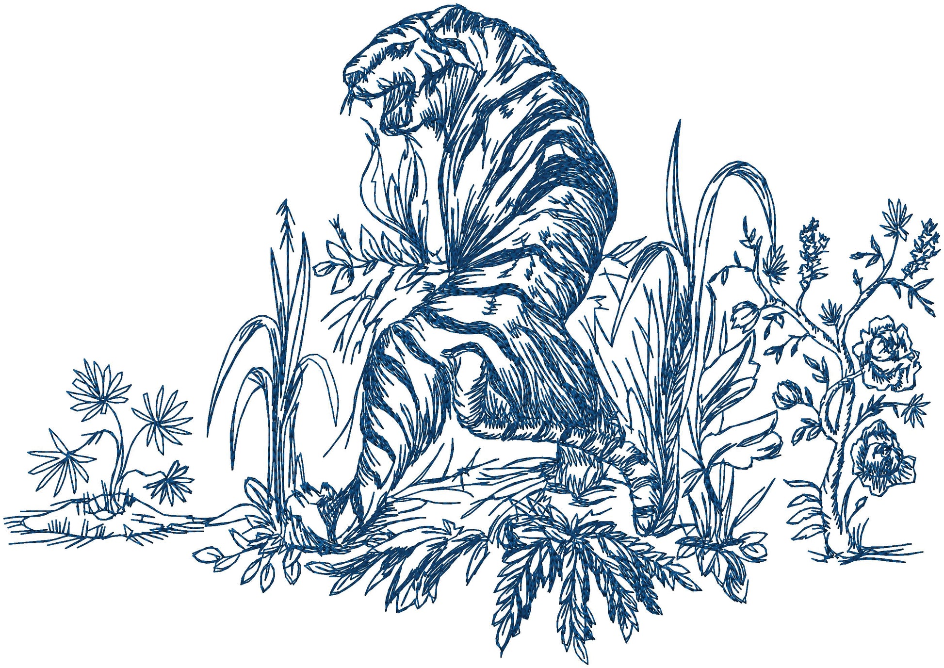 Imagine the vibrant hues of the tiger's coat, with its distinctive stripes, contrasting against the tranquil landscape. Steve's artistic interpretation captures the essence of the tiger's regal nature while incorporating the charm of a toile pattern. The combination of strength and delicacy in this design is sure to make a bold statement in your embroidery collection.