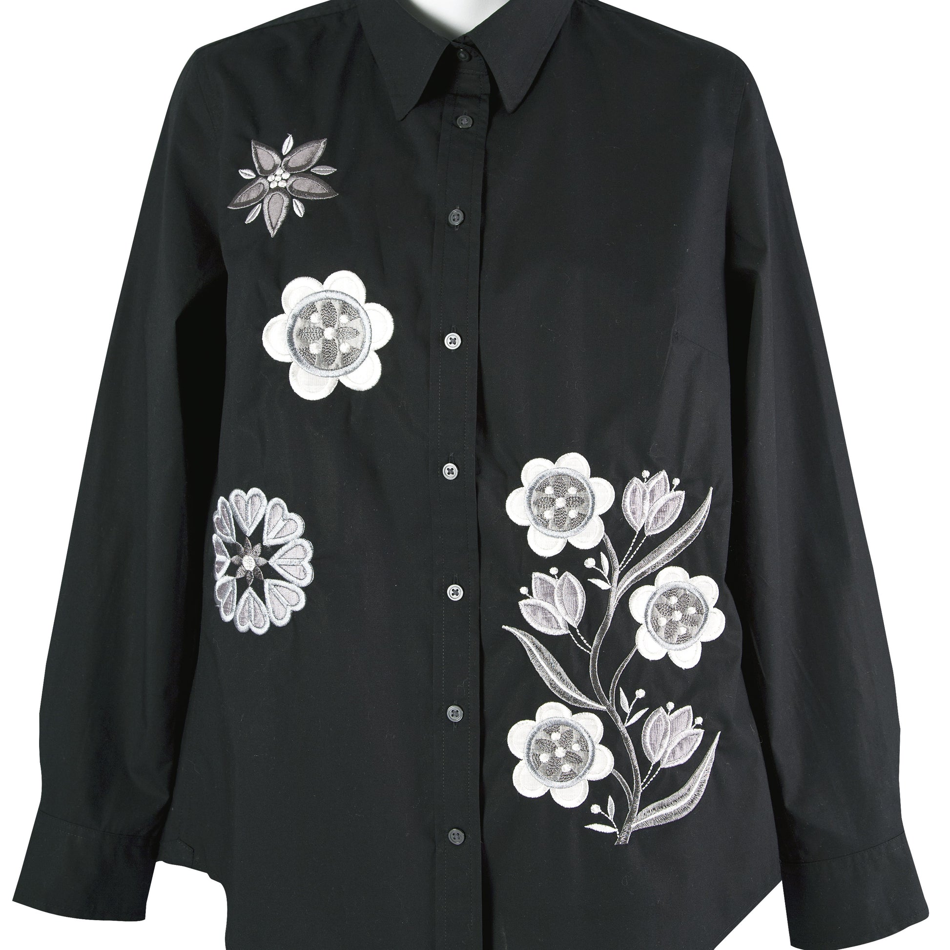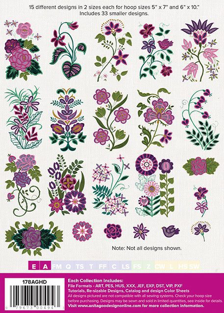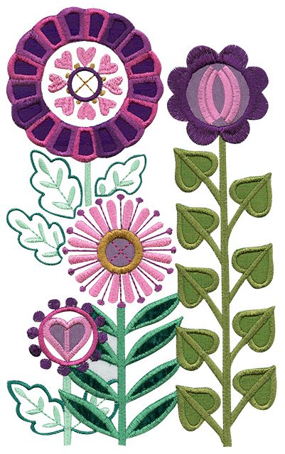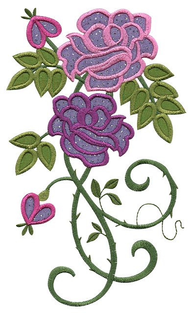 We wanted to create a floral collection that would look great on clothing, so the idea for Fantasy Floral was born. Fantasy Floral contains 15 jumbo designs that come in two sizes, 6”x10” and 5”x7”. There are also 25 smaller designs that compliment the larger ones. The most exciting part about designing this collection was choosing the appliqué fabrics and colors. We chose all different pinks and purples for the thread colors and then chose a wide variety of appliqué materials. We wanted a lot of texture so we used velvet, organza, sparkle organza, silk, felt and knit. The different fabrics really made the designs pop.