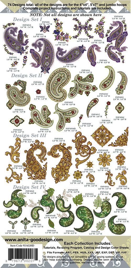 Resembling a large comma or twisted teardrop, the kidney-shaped paisley is one of the most recognized patterns in the world! Here at Anita-Goodesign we love paisley too, that is why we could not resist creating a new paisley collection.