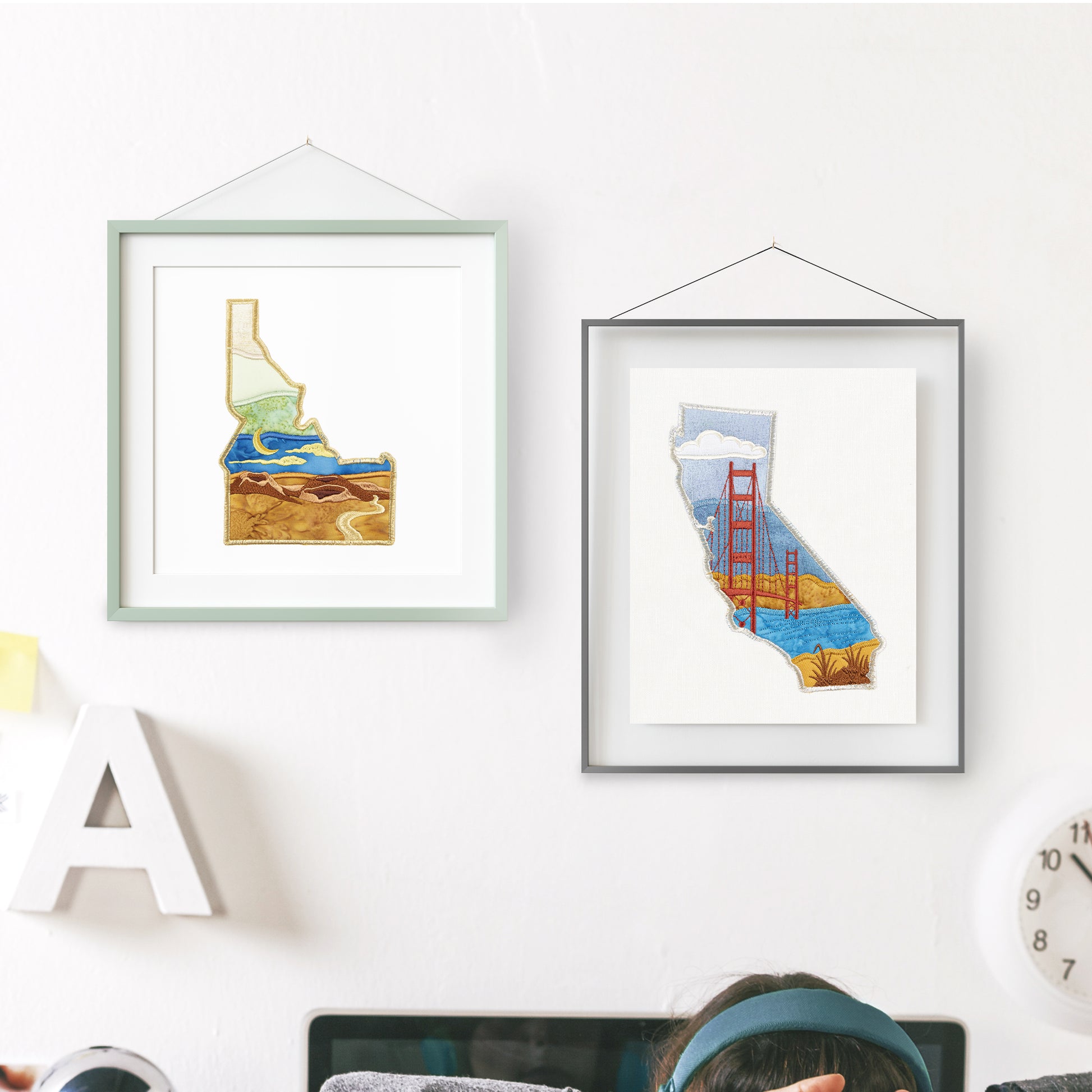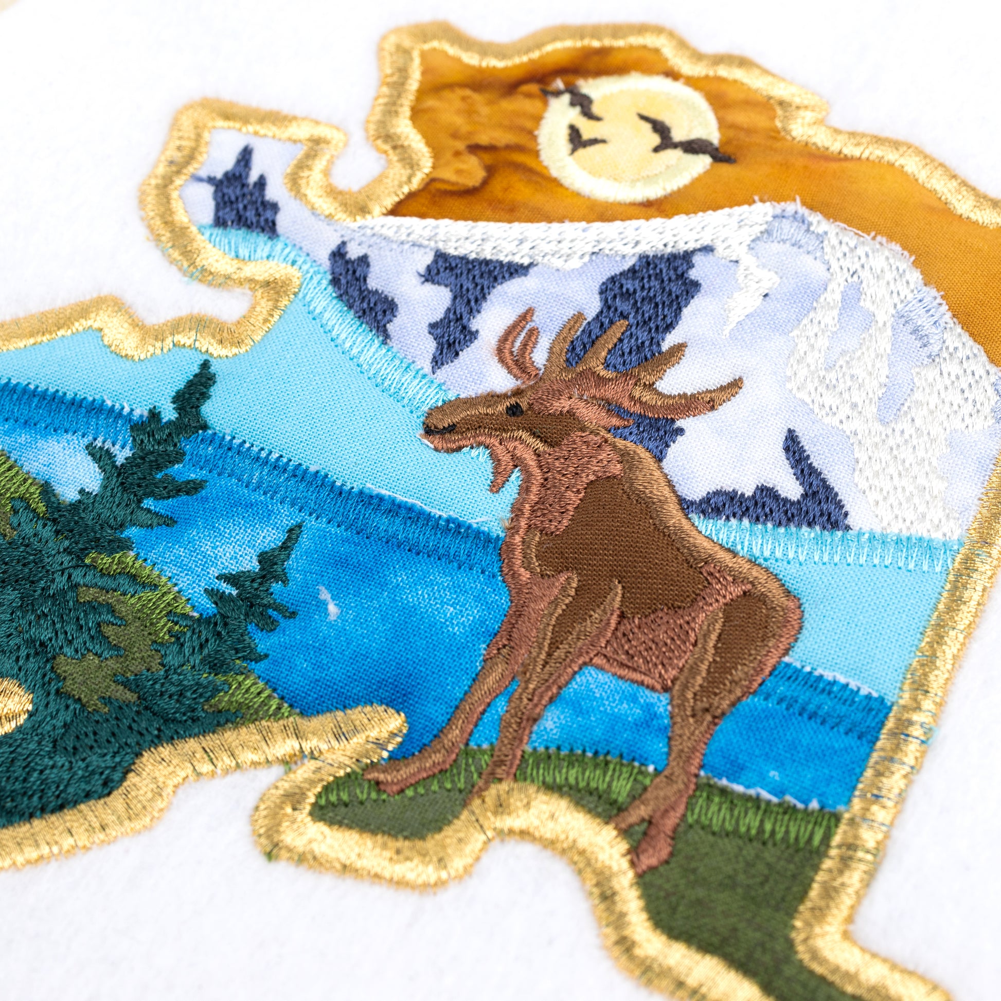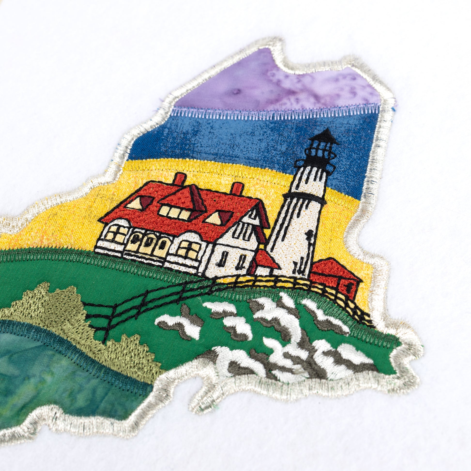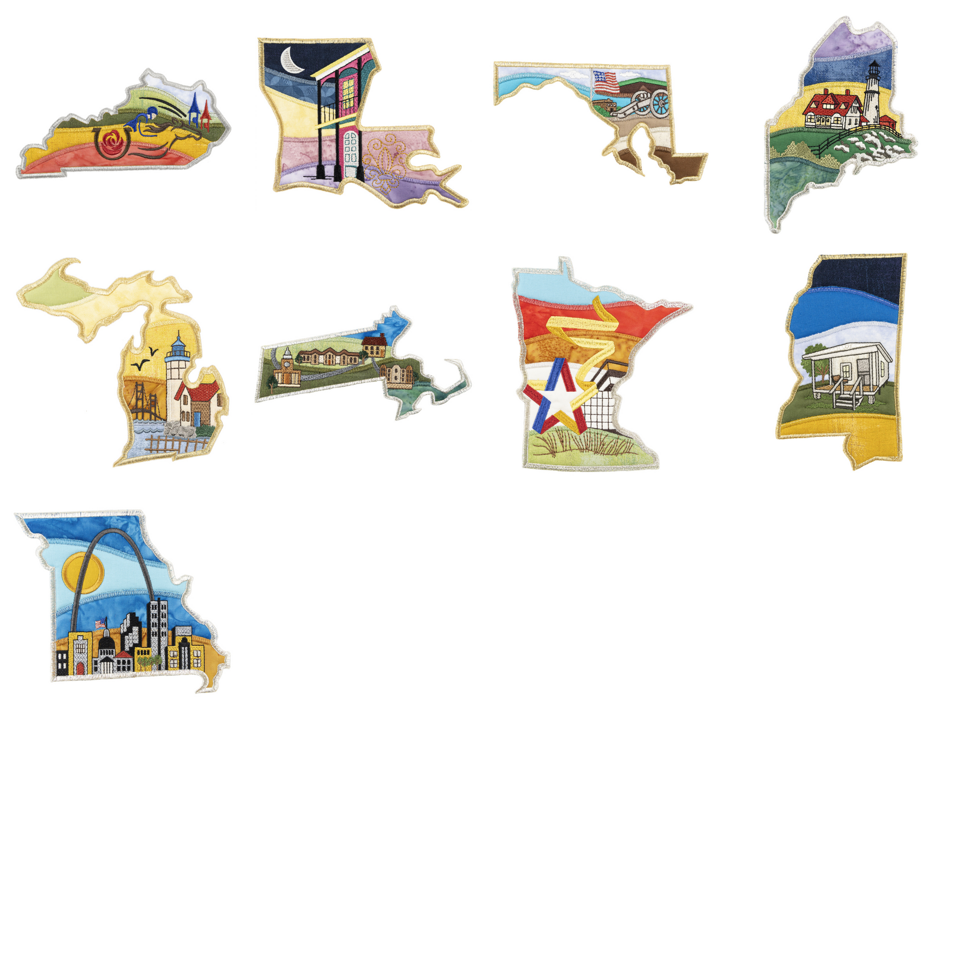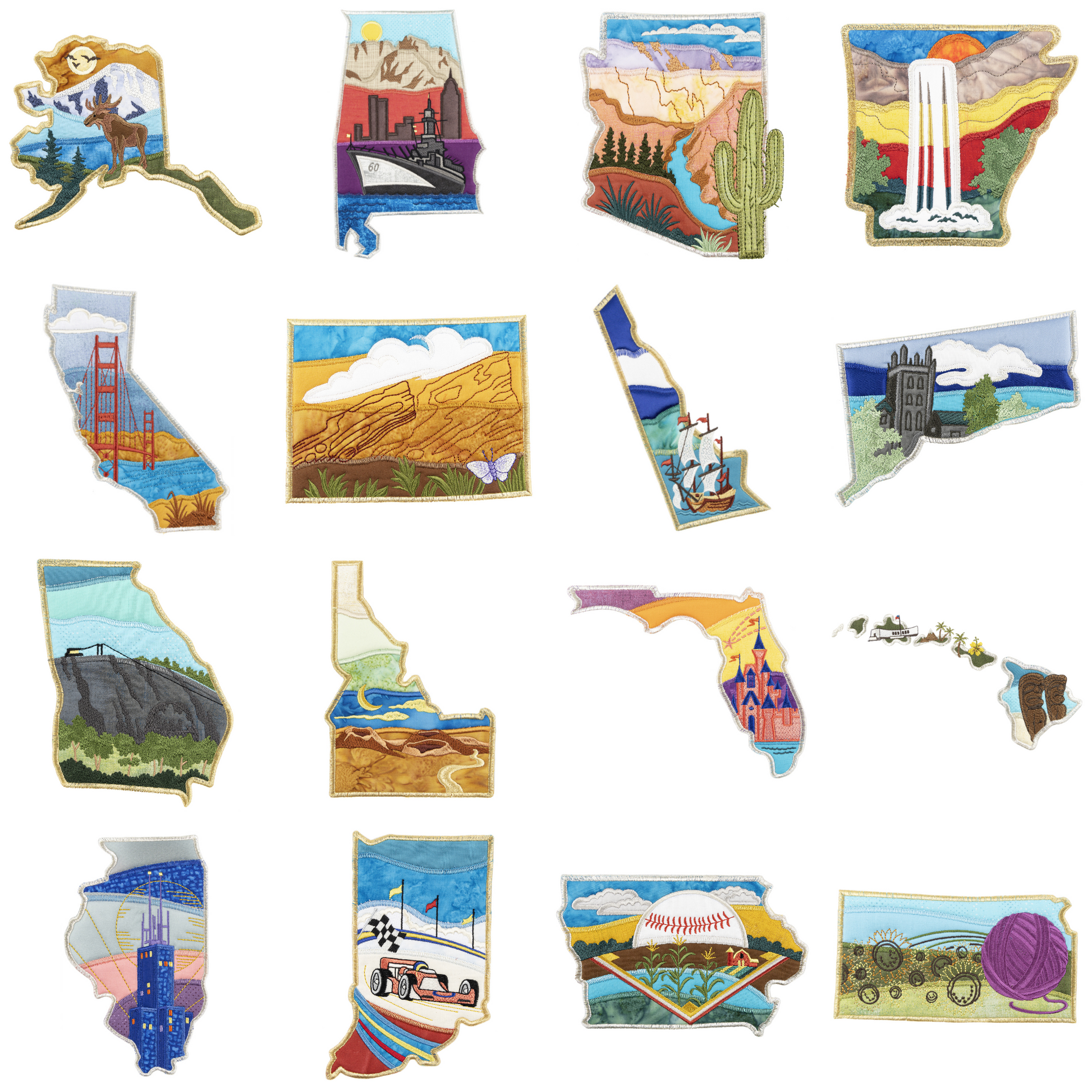 We are excited to release this first set of Nifty Fifty United States, a 2-part series of state designs, featuring 50 gorgeous landmarks from across our nation! For this first half of the country, we’ve included the first 25 states, Alabama through Missouri, in stunning, landscape appliqué style. Each state will be represented with one of their most popular landmarks within the silhouette. The scenes are then emphasized by layers of vivid cottons or linens and further embellished with standard appliqué and embroidery.