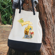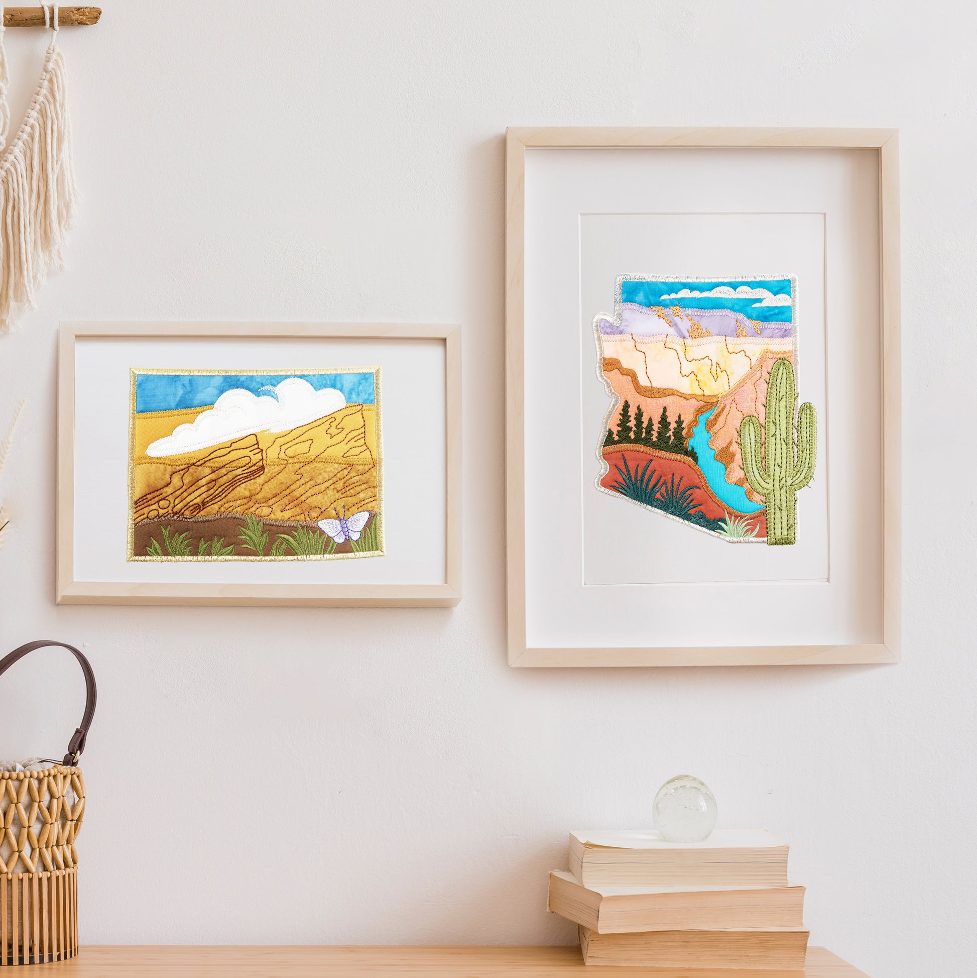 We scoured some sources online as well as consulting friends from near and far to help us select these state scenes! Each state landmark was chosen and then re-imagined in fabric and thread, highlighting both the iconic location as well as the stunning landscape-style skies behind them. We’ve included the name of the landmark under each full page design so you can easily look up images for inspiration. Add these embroidery designs to jackets, tote bags, or even framed on a wall to show your state some love!