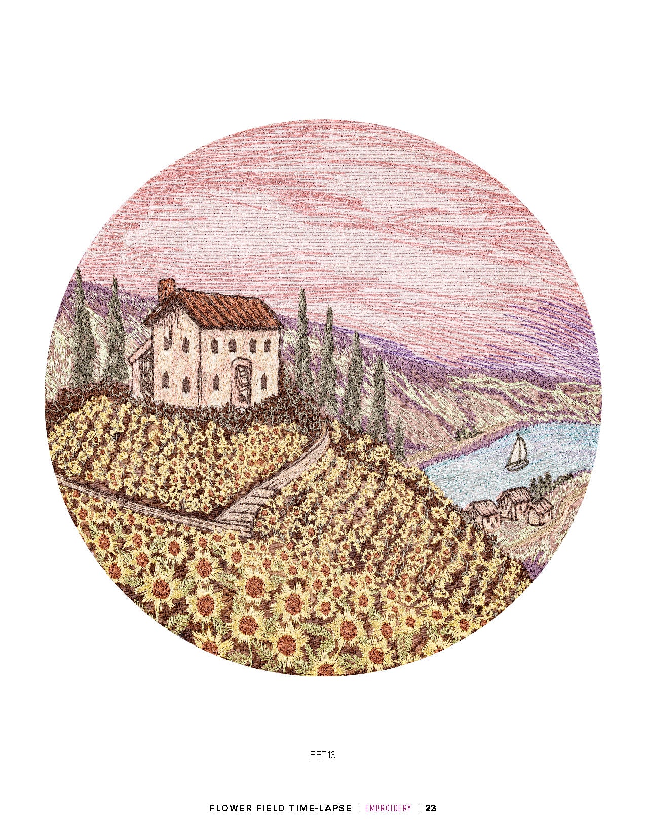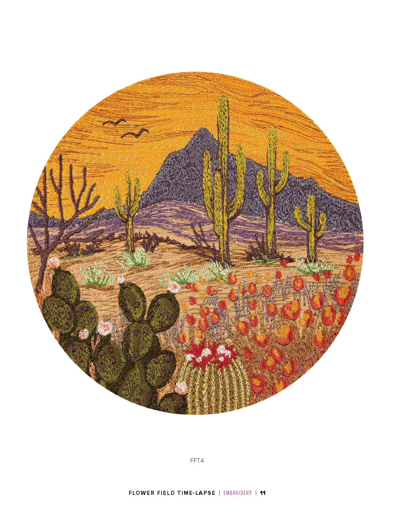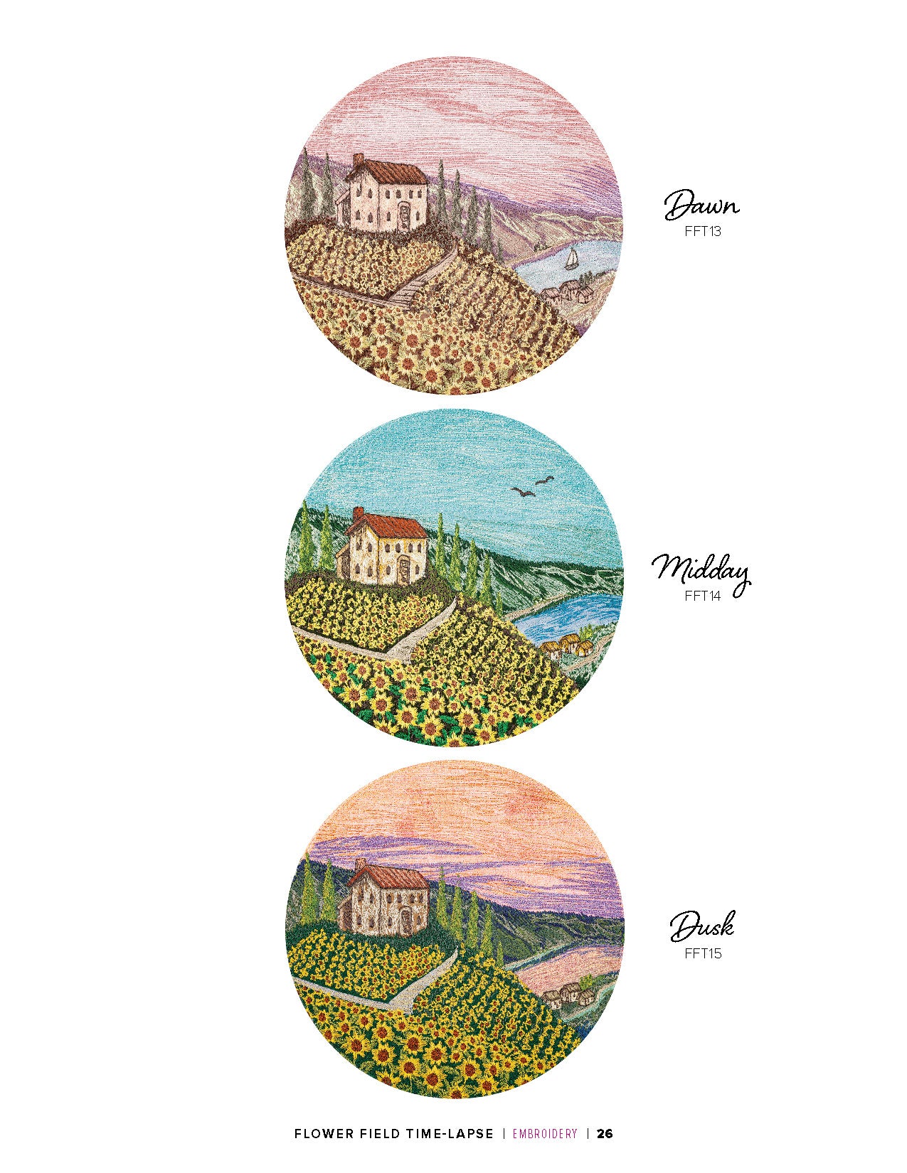film. Create your own natural landscape with embroidery thread, hidden appliqués, and any of these designs. This collection showcases 6 landscapes with 3 different versions of each, for a total of 18 designs. The 3 versions show the same scene during dawn, midday, and dusk. Each of the landscapes will feature a variety of flora. Lavender, cacti, rose bushes and tulips are just a few of many you will see throughout this collection. Find the scene that speaks to you and stitch it out as wall decor or as the embellishment for your next embroidery project. Each design comes in multiple sizes. Check out the numbered machine steps for exact dimensions and stitch count.