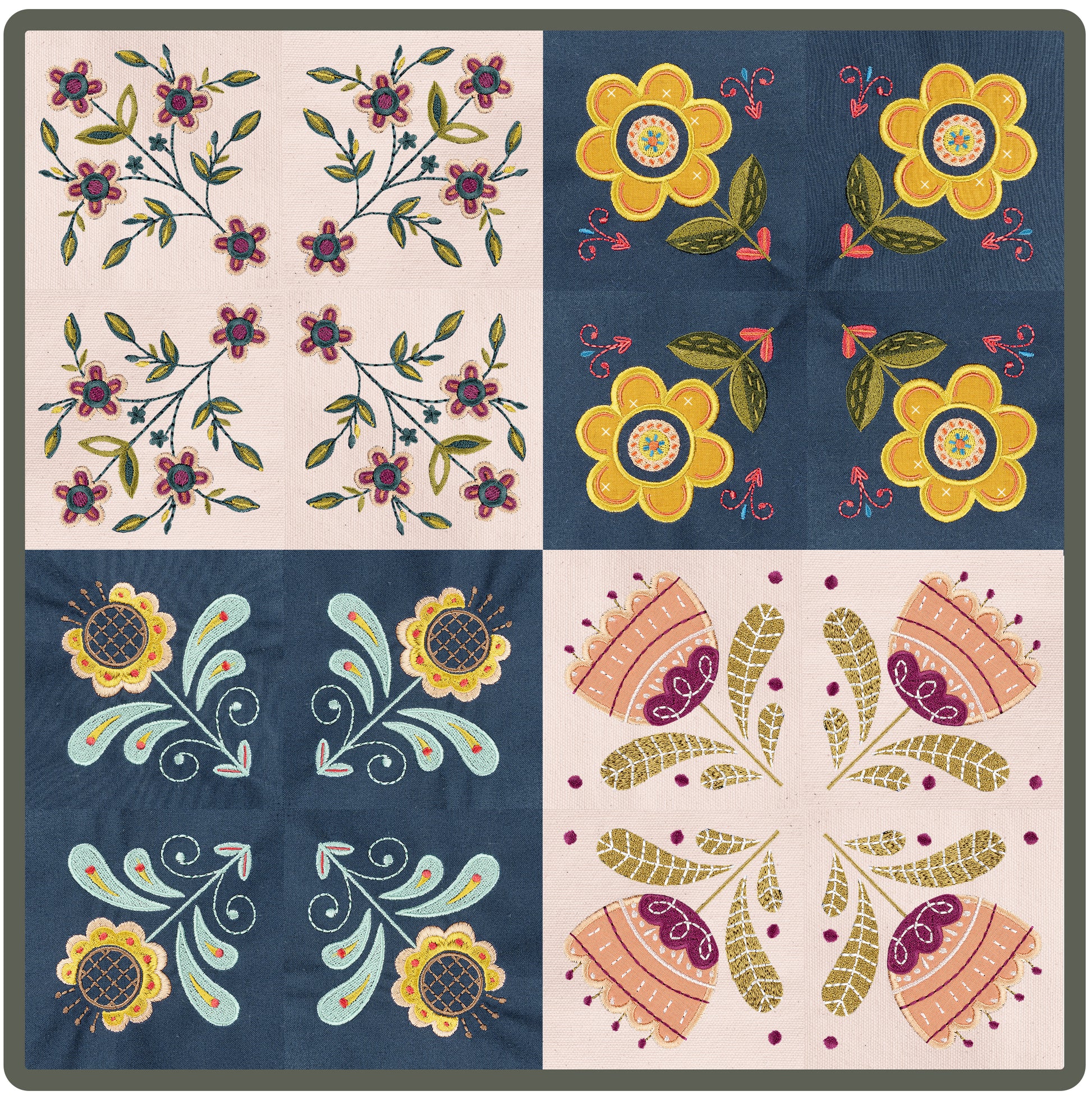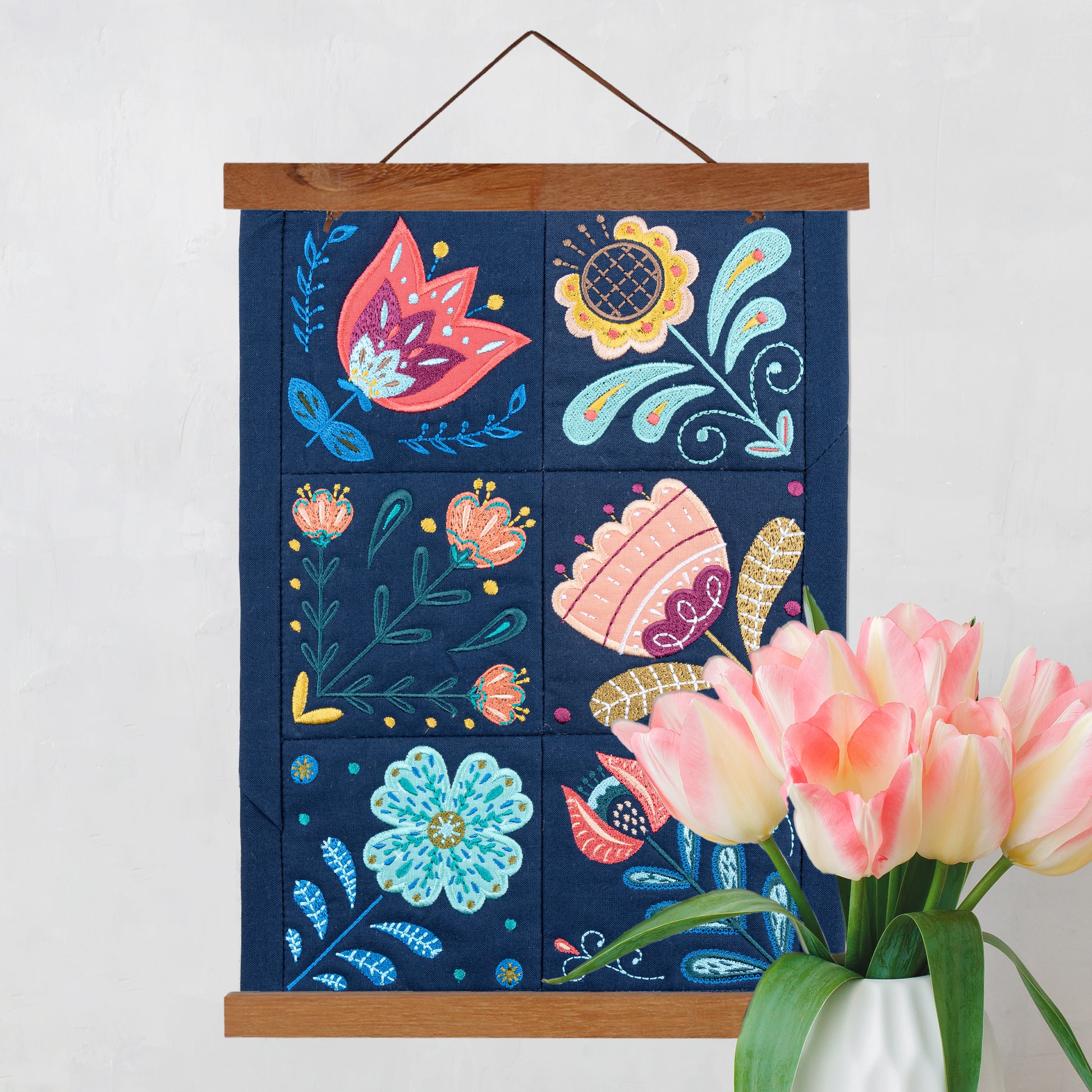 Just like all of our 4 x 4 collections, Folksy Florals comes with an additional blank 4” x 4” quilt block file. This way, any design in the collection can be merged with the blank block to create quilt blocks! Merging the files using your home embroidery machine is super simple because no adjustments are necessary to ensure that the designs fit, giving you a whole new way to use this collection! Stitch four of each design onto quilt blocks and arrange them in groups by quarter turning to create a dynamic and eye-catching floral quilt, or stitch all ten designs and create a charming wall hanging!