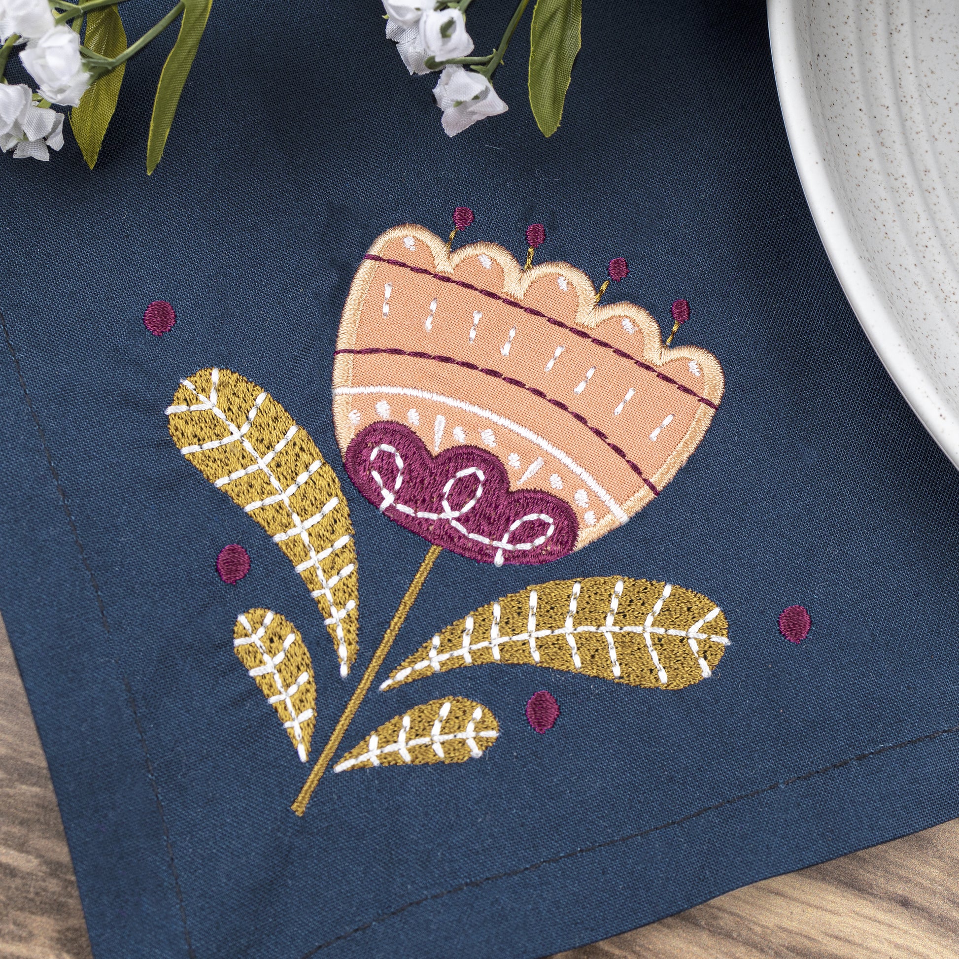 Our Folksy Florals collection can be used for many different types of projects! Each floral design is oriented at a 45° angle, which is perfect for embellishing the corners of hand towels, handkerchiefs, or napkins.