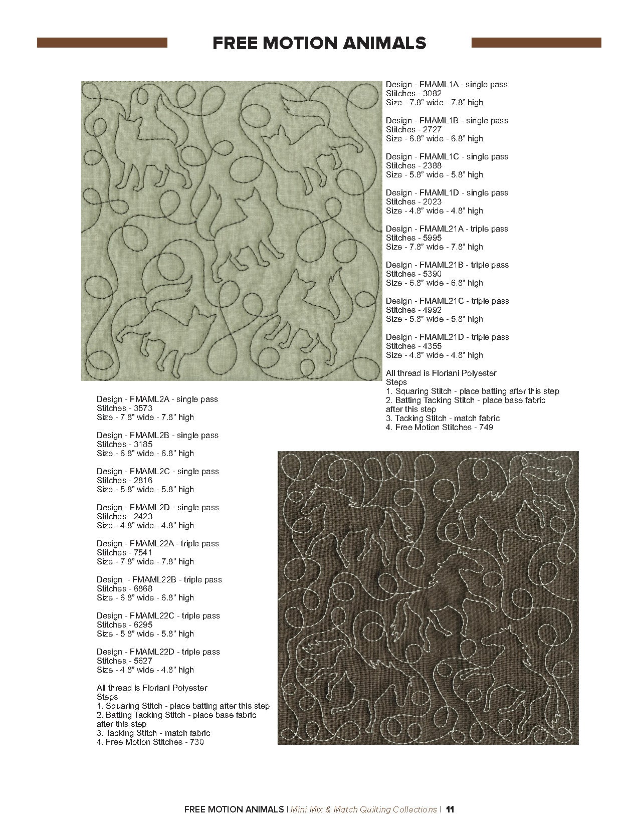 A few years ago we released a collection titled “Free Motion Christmas ” that took the concept of free motion quilting and adapted it to embroidery machines. There were 20 different designs that all connected left to right so that when the quilt was pieced together, the stitching looked continuous. This same concept was used to create our Free Motion Animals collection! There are 20 different animals that are playfully drawn and digitized using our free motion embroidery technique. There are dogs, cats and even elephants. Each of the designs comes two different ways. The first version is a single pass stitch, resembling free motion the most since it is only one layer of thread. The second version is a 3-ply or as it is usually called a bean-stitch. This stitch is much bolder and looks great when you stitch it with contrasting thread. We used the 3-ply stitch for all of our quilts shown in this project. You can mix the different animals together or use only one animal and change the fabric, either way you will have a beautiful quilt when you are finished. We are obsessed with these free motion animals and can't wait to see you all stitch this quilt out!