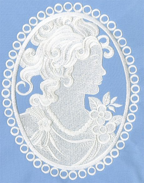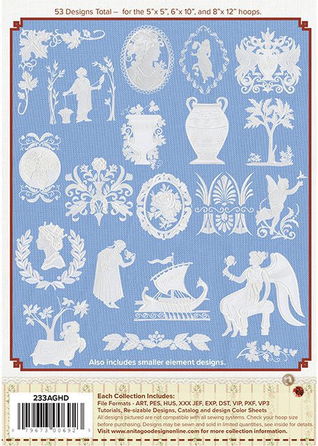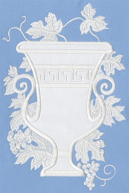 I’ve always loved the embossed details on pottery and cameos, especially Wedgwood pottery. The stark contrast of the white on blue is always striking. Digitizing this collection was a challenge because there is no outlining or other colors to create shading. Each of the different sections of stitching had to be placed in different directions with varying levels of underlay to make the individual features stand out. The end result is stunning in its simplicity. There are 20 main designs and they each come in 2 sizes, there are also 13 isolated smaller designs. The collection has everything from cameos, to flowers, leaves, grapes and classic Greek designs. The designs will look elegant and lovely on whatever you stitch them on.