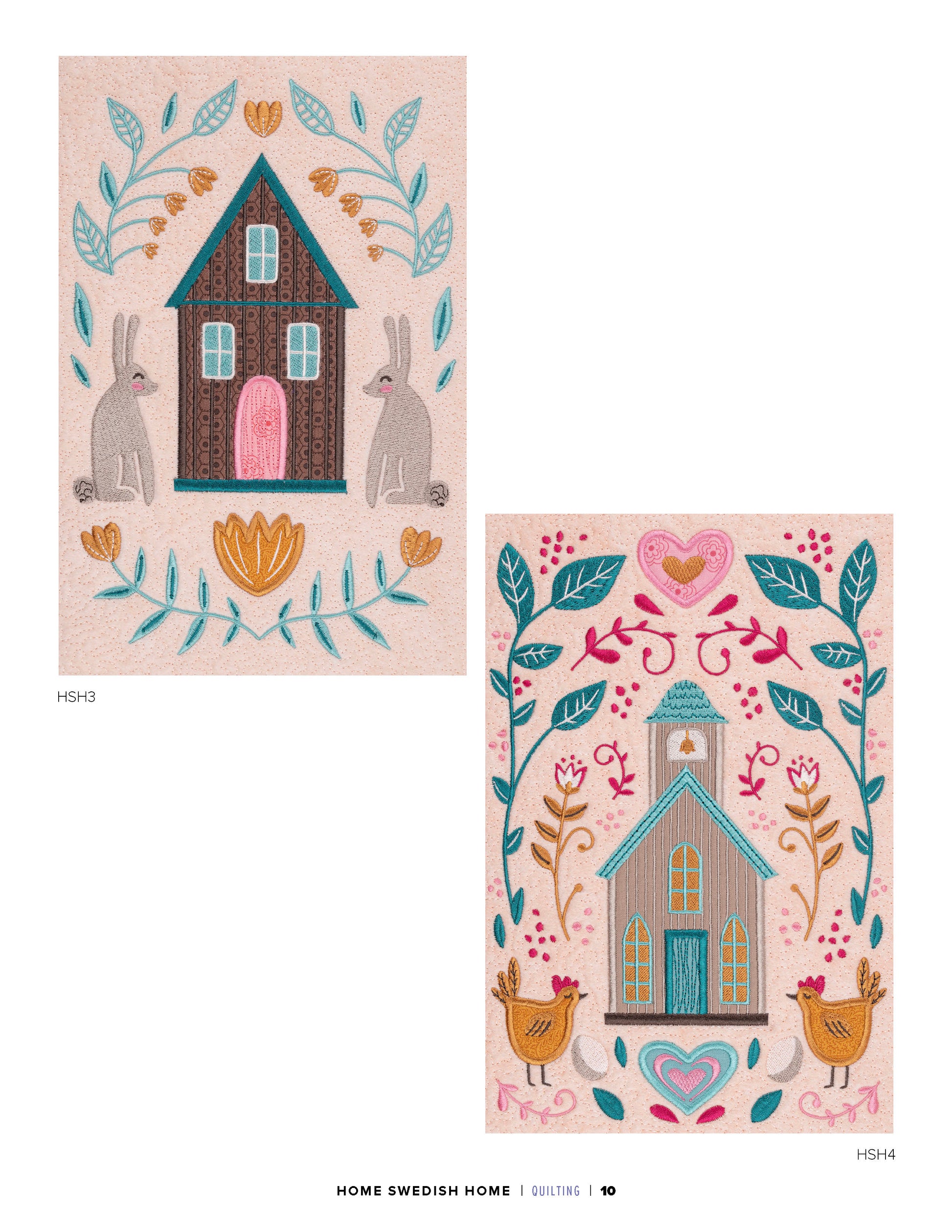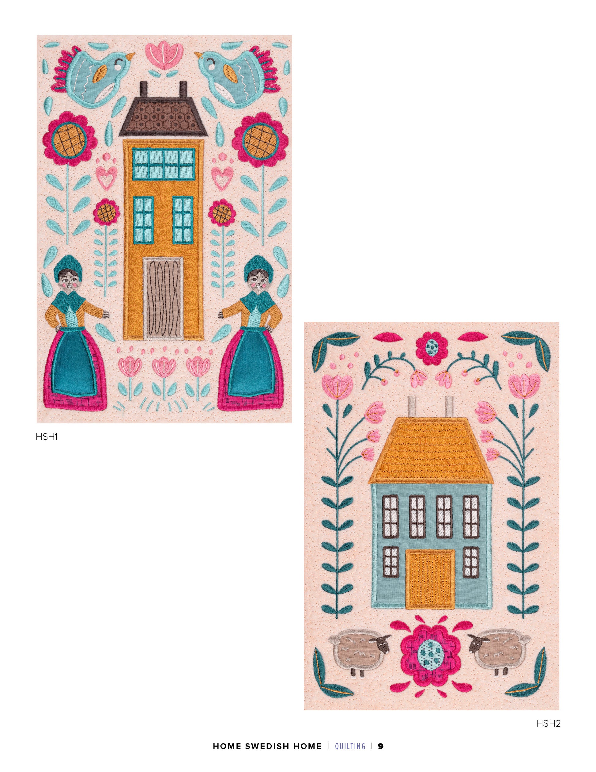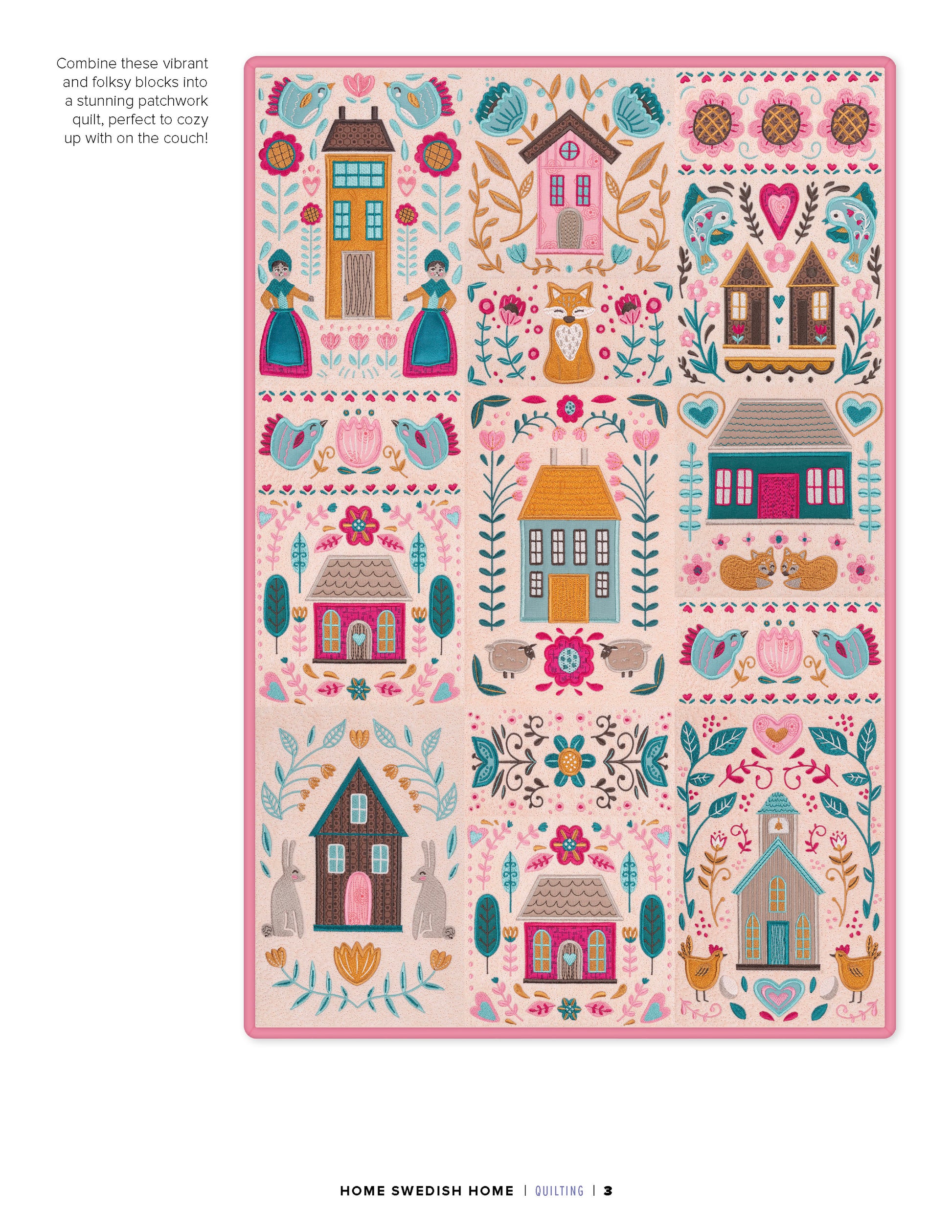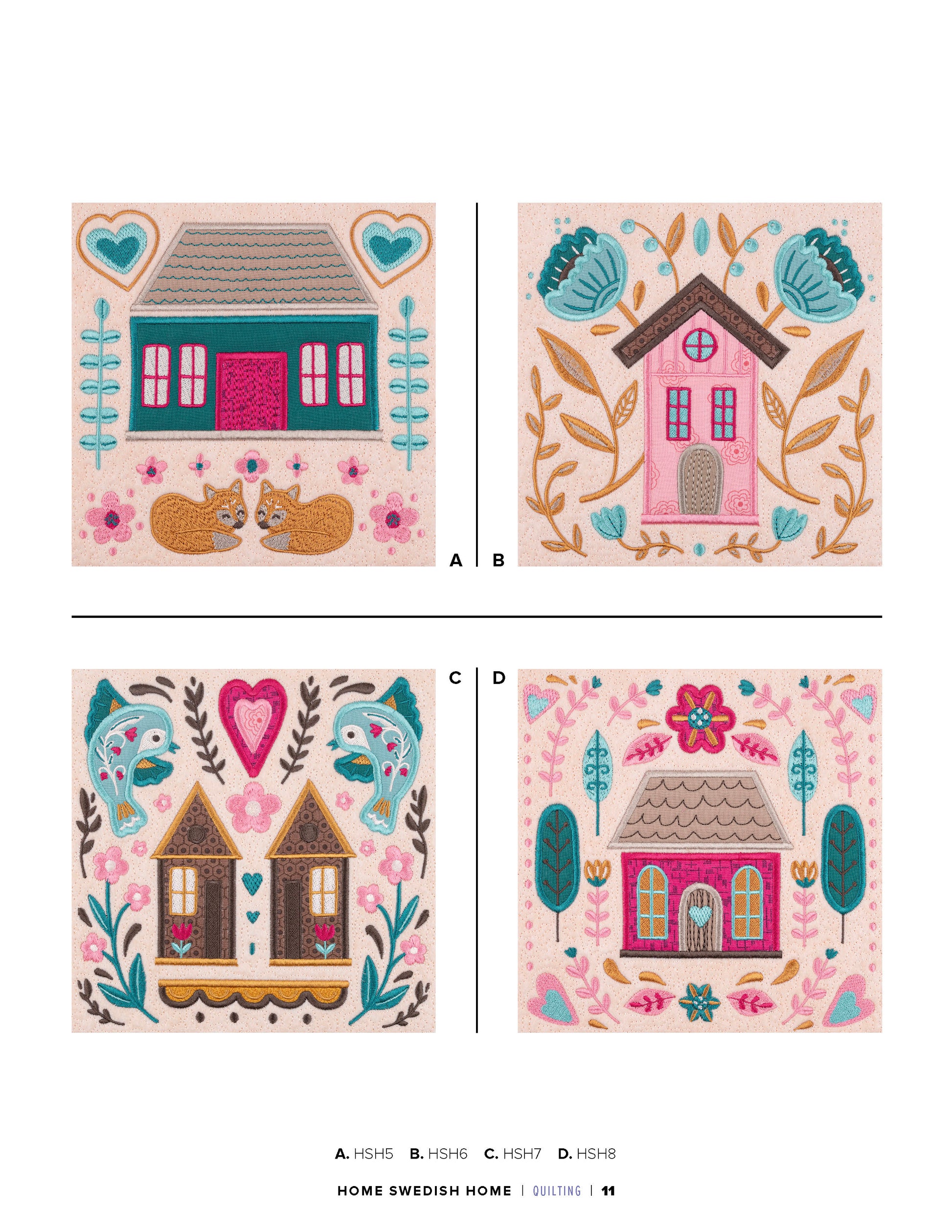 This collection of 12 standard appliqué quilt blocks features the Scandinavian folk art style to create a quilt that says: “Welcome Home!”