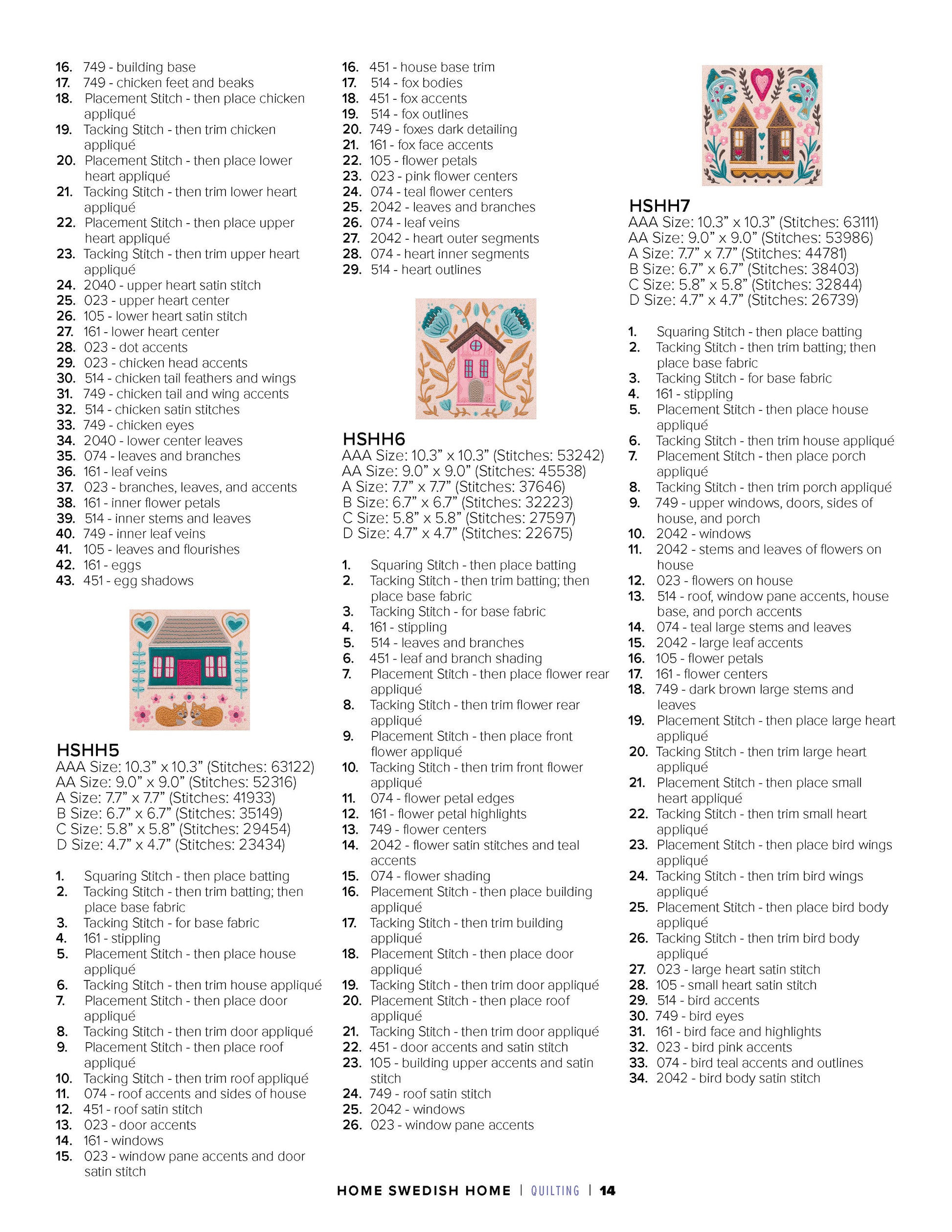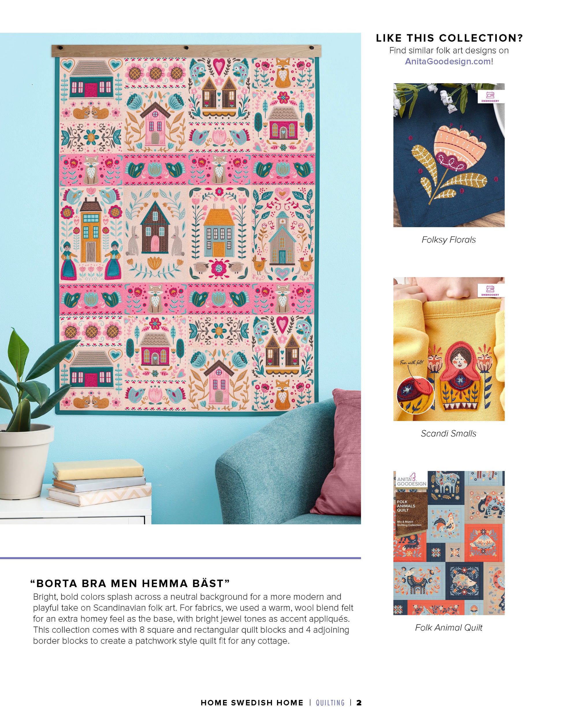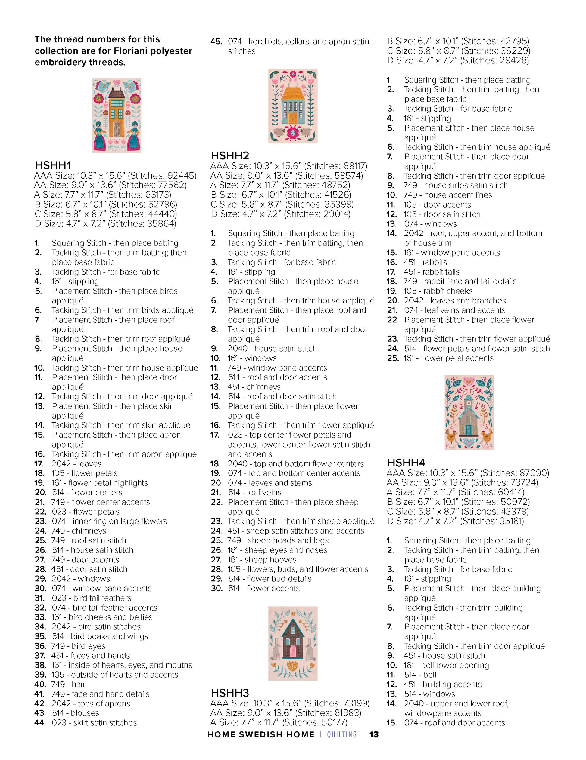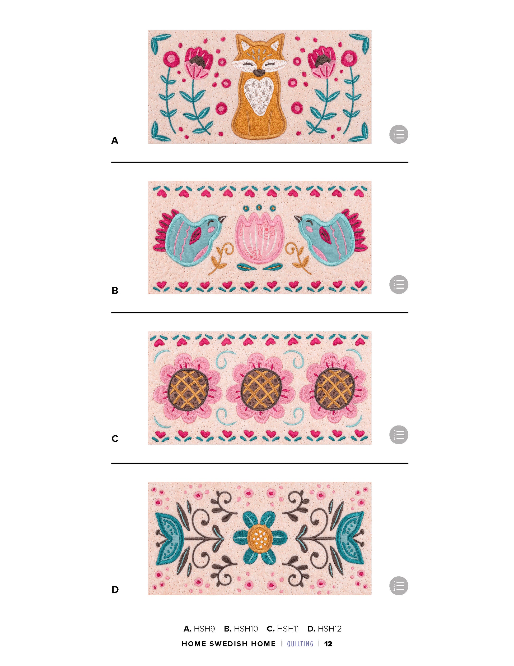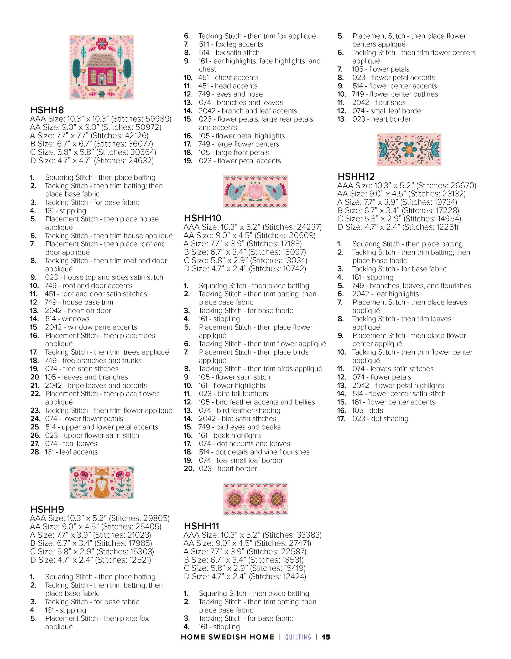 This collection of 12 standard appliqué quilt blocks features the Scandinavian folk art style to create a quilt that says: “Welcome Home!”