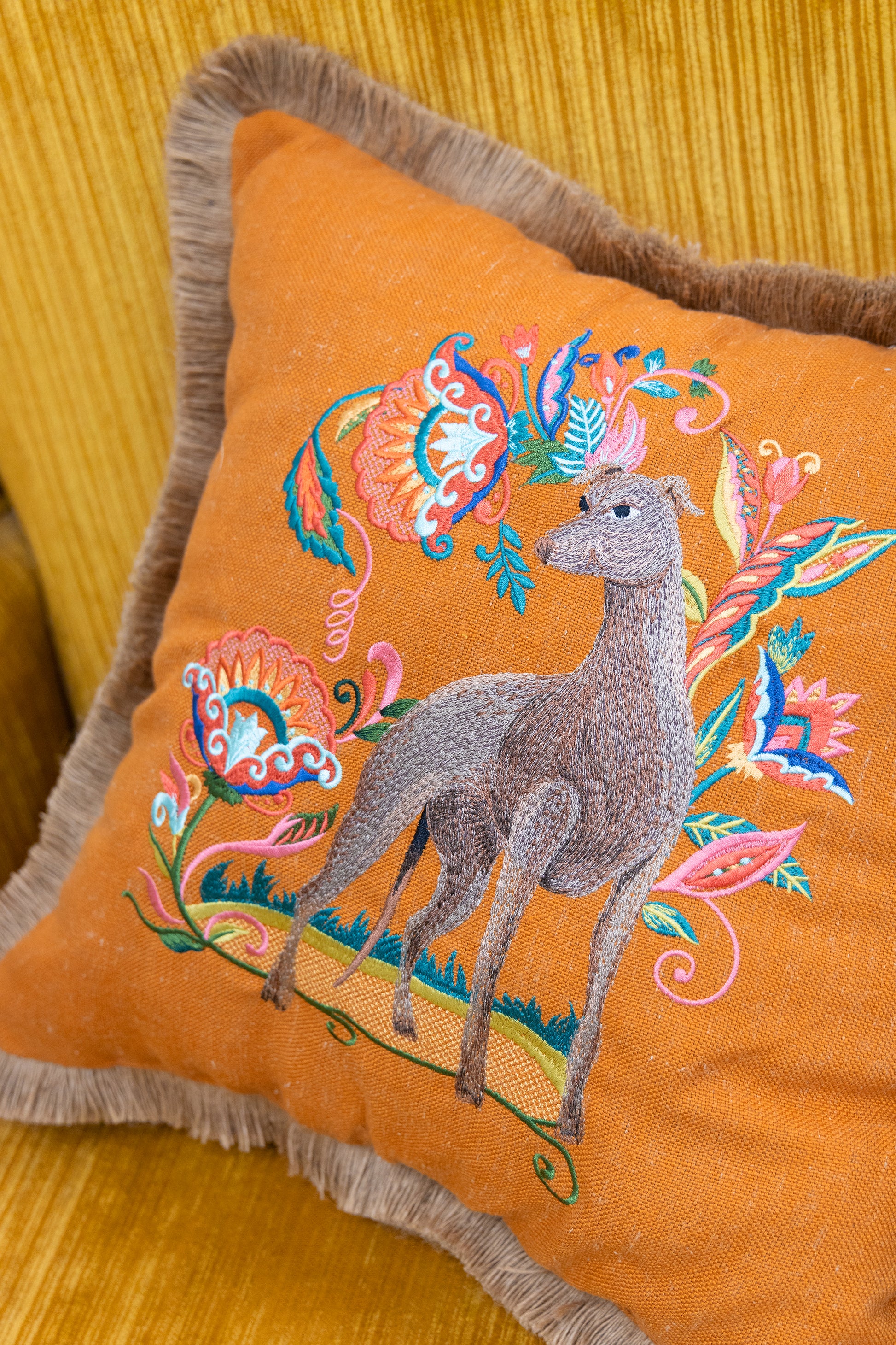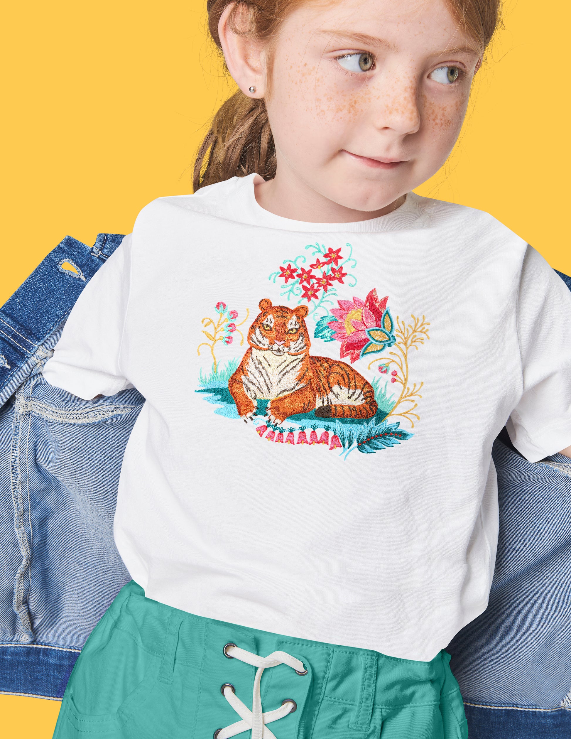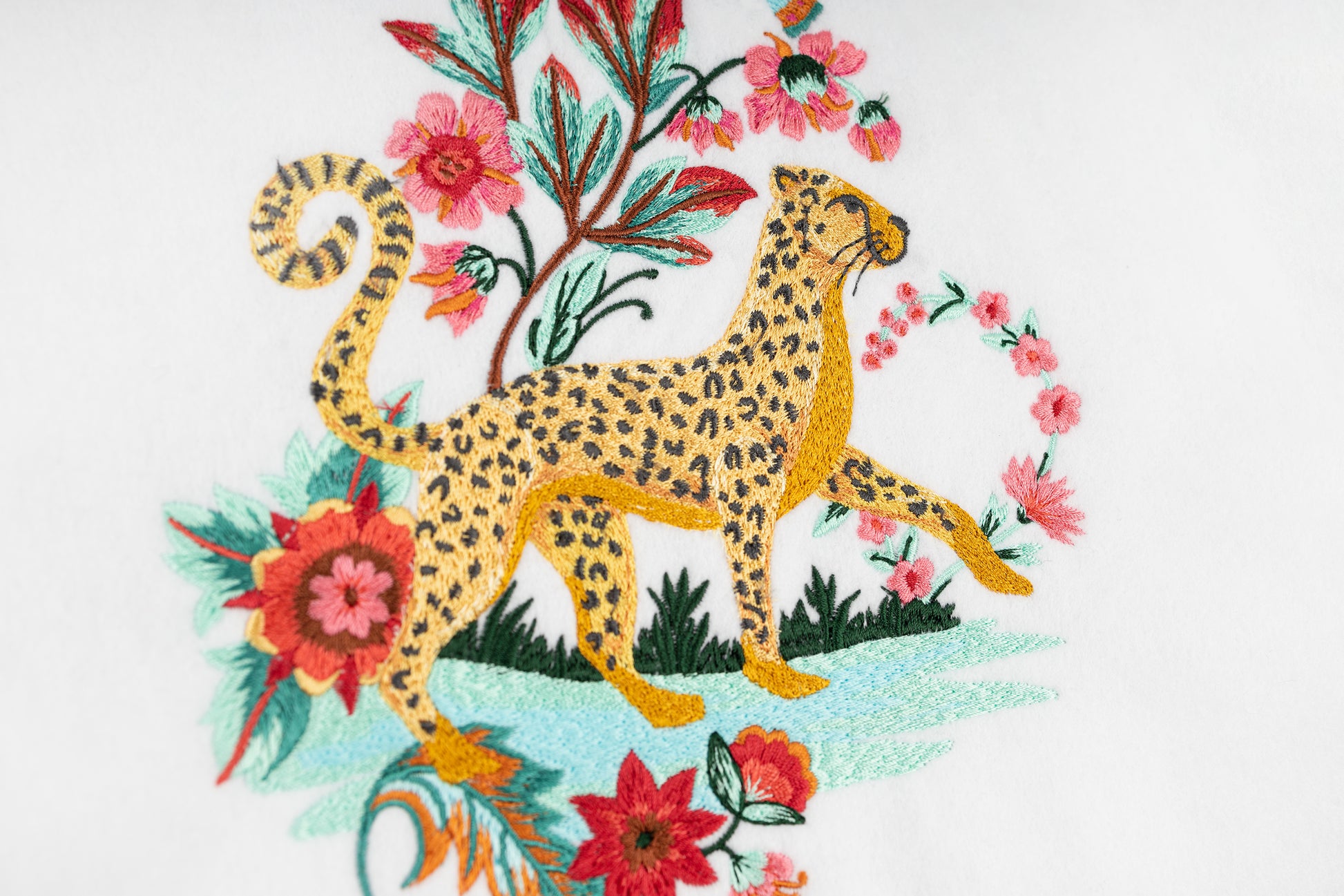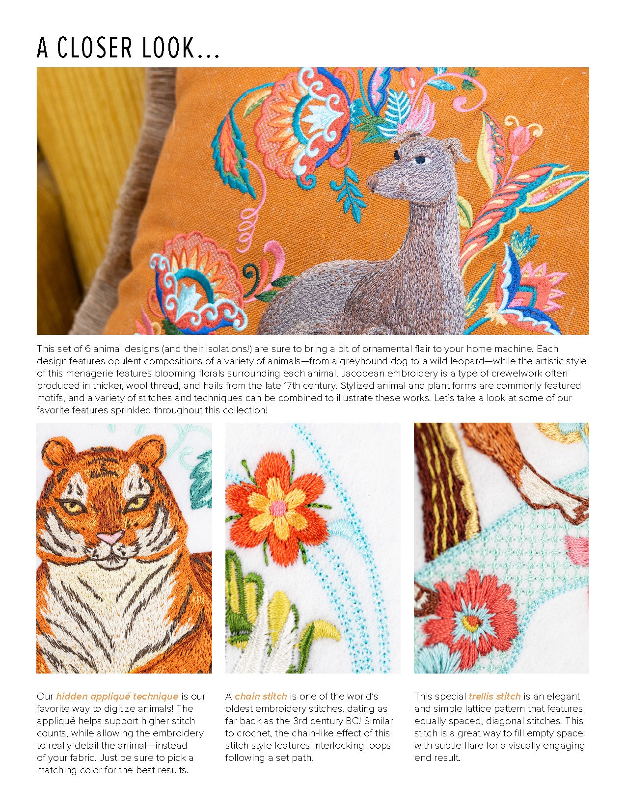 This set of 6 animal designs (and their isolations!) are sure to bring a bit of ornamental flair to your home machine. Each design features opulent compositions of a variety of animals—from a greyhound dog to a wild leopard—while the artistic style of this menagerie features blooming florals surrounding each animal. Jacobean embroidery is a type of crewelwork often produced in thicker, wool thread, and hails from the late 17th century. Stylized animal and plant forms are commonly featured motifs, and a variety of stitches and techniques can be combined to illustrate these works. Let’s take a look at some of our favorite features sprinkled throughout this collection!
