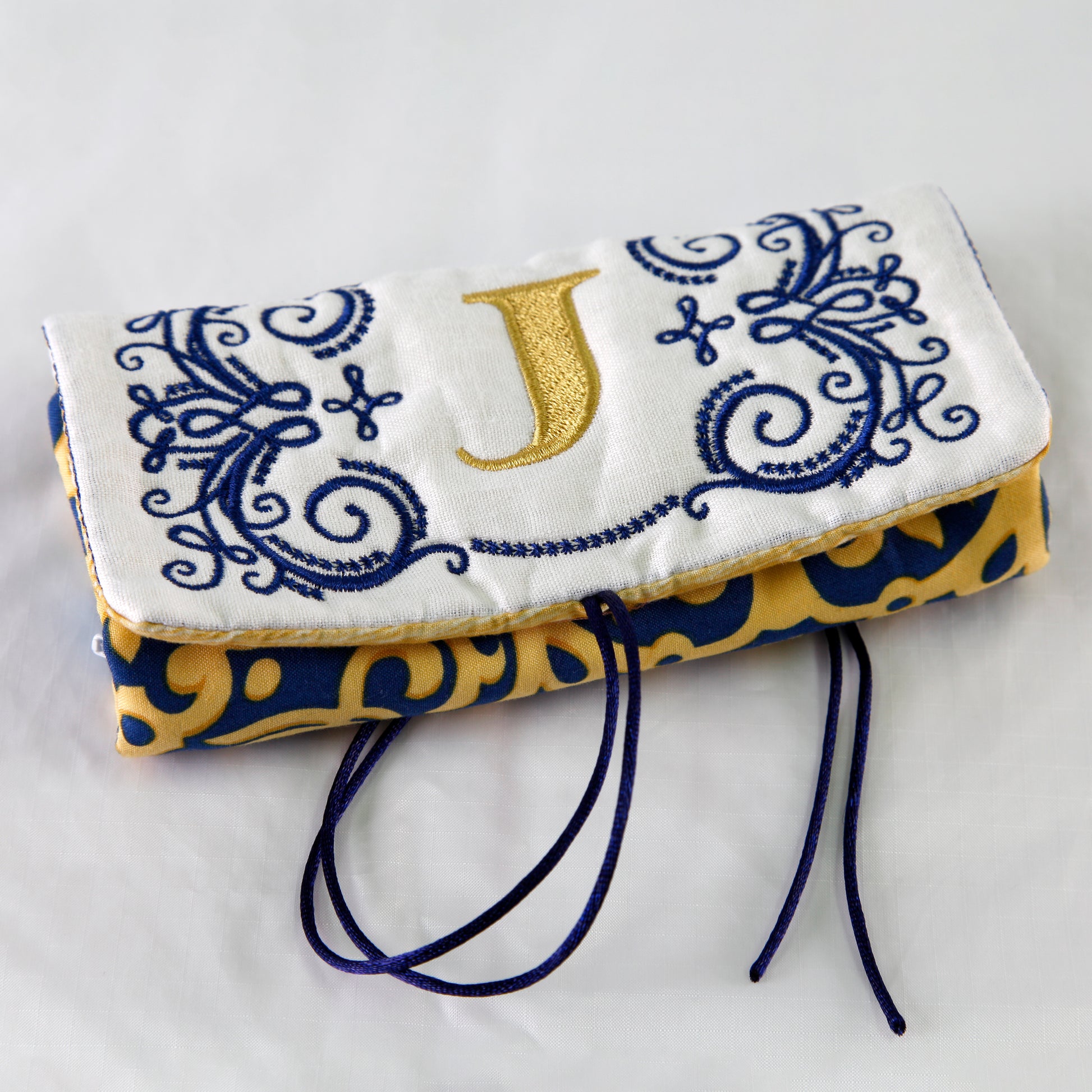This fun Jewelry Roll is fast and easy to make! The inside pocket, including the zipper, is made in your embroidery hoop first, then finished with minimal sewing. The monogram panel in created second, then the entire project is stitched together in the hoop! This project makes a great gift for someone special.