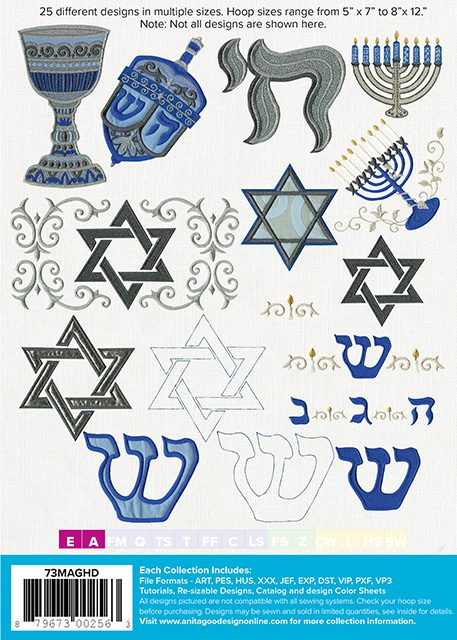 Welcome to our Jewish traditions collection. This collection has been requested for the past few years and we didn’t quite know how to approach it until now. We decided to create a classic elegant collection to honor Jewish traditions. There are beautiful Menorahs, dreidel’s and star of David’s. We’ve included large and small designs to decorate any garment or home decor item. There are also a few quilt designs that would add class to any project. We designed two different table runners for this collection.