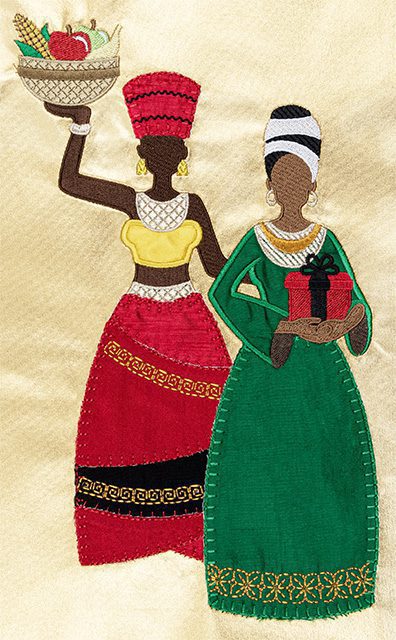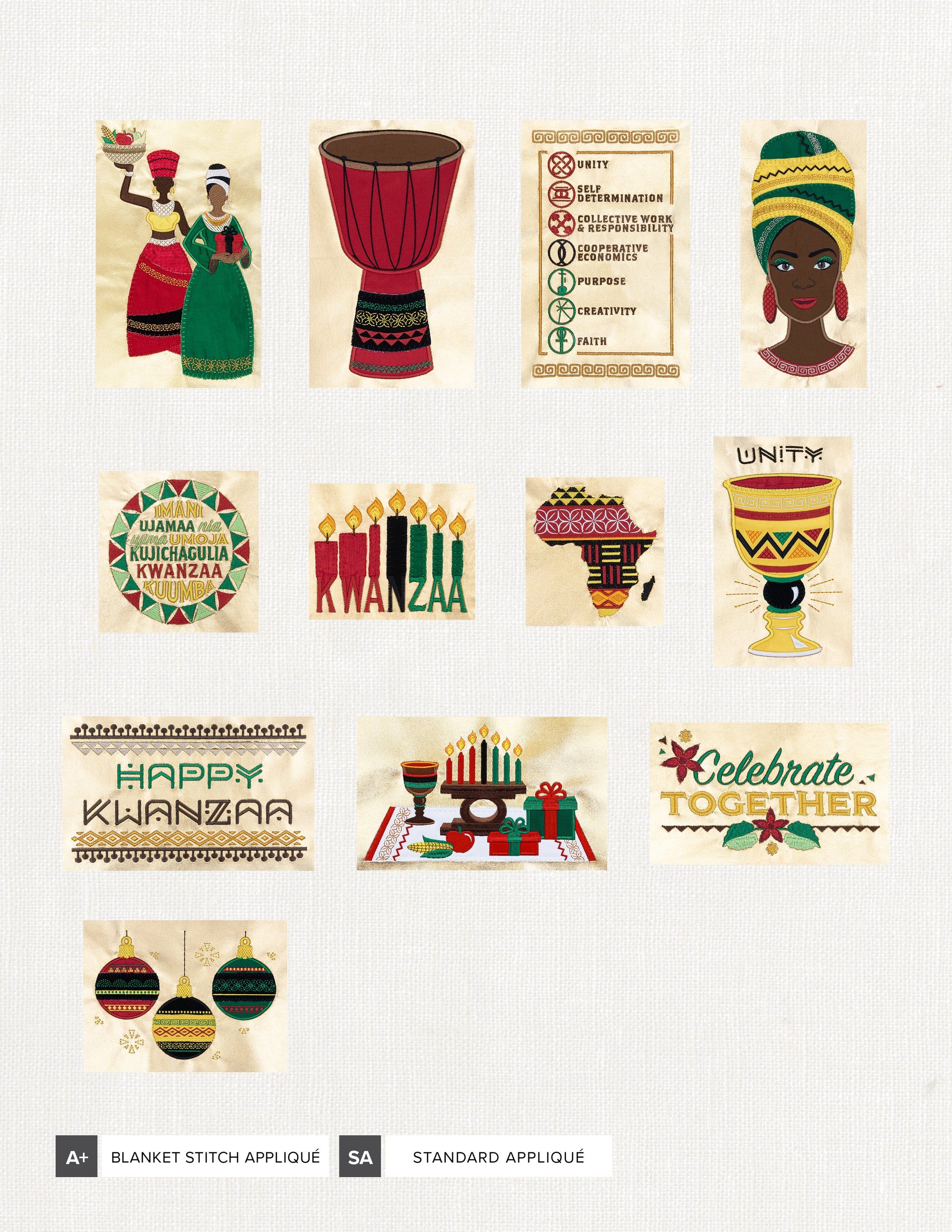 Gather the first fruits of the harvest—it’s time to celebrate Kwanzaa in style! From a bountiful table spread with the kinara as the centerpiece, to a beautiful motif of the African continent in patterns reminiscent of kente cloth, you’re going to love embroidering these festive Kwanzaa designs. Featuring both detailed embroidery and appliqué techniques, this collection has it all. We digitized many of the decorative appliqués to have a blanket stitch outline overtop for a unique look that complements the many intricate patterns and motifs in every design. By using the traditional Kwanzaa colors of red, black, and green, you’ll be in the spirit to celebrate each special day of community, culture, and African heritage. With so many designs to choose from, you can utilize this collection to create home decor projects or to give as zawadi gifts! Let’s pull together and celebrate this holiday with family, good food, and blessings all around. Furaha ya Kwanzaa! Designs: 12