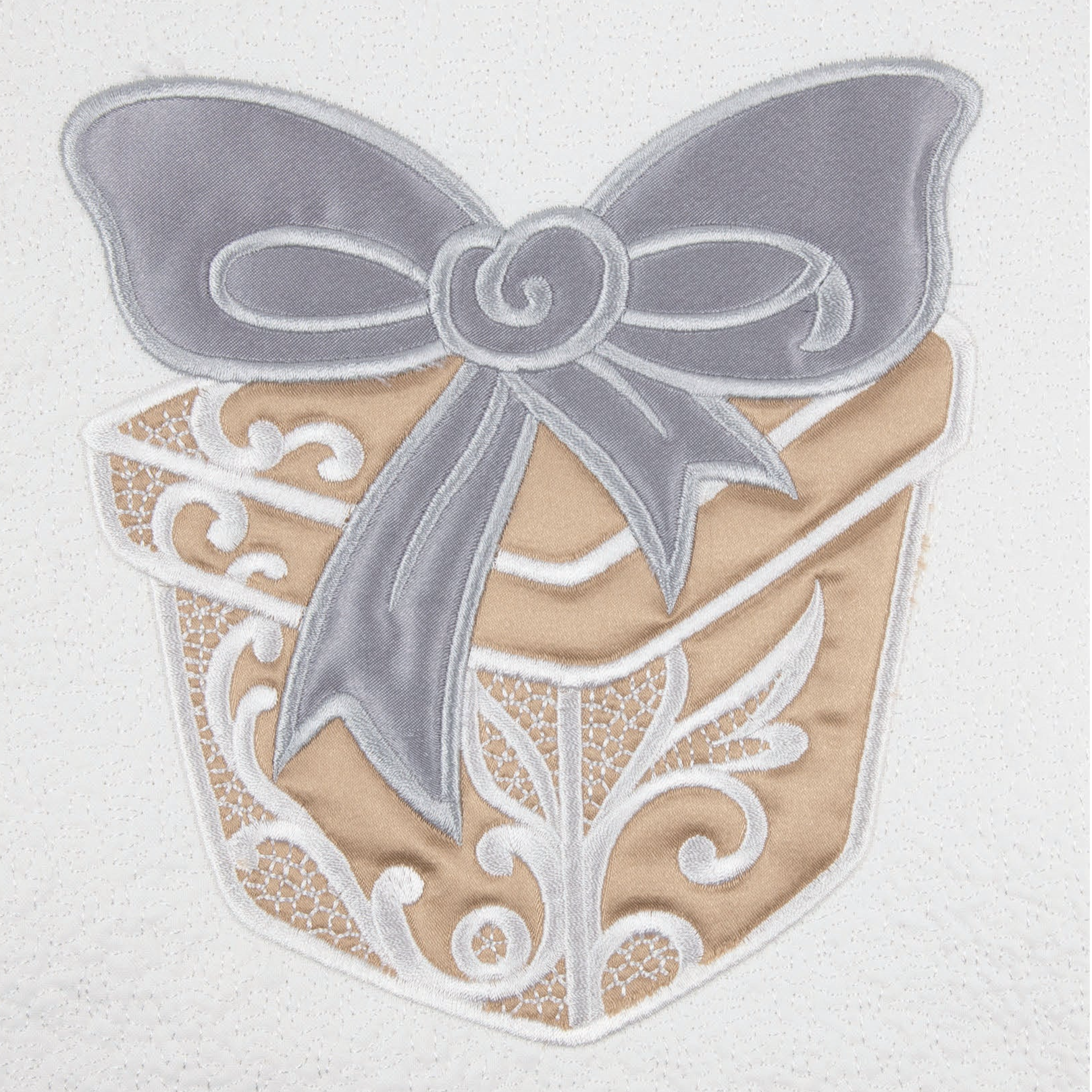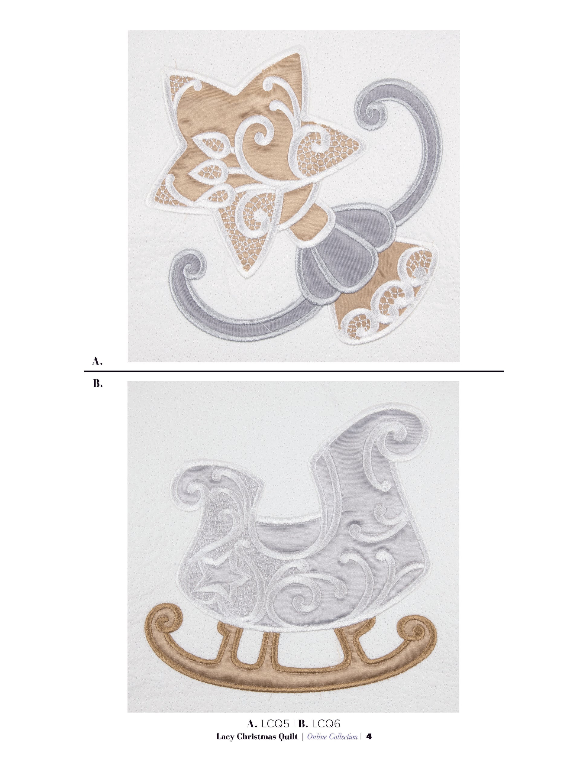 We have stitched these designs using a combination of soft cotton base fabrics and lustrous silver or gold satin for the appliqué elements, elevating each Christmas motif with a luxurious touch. To enhance the overall aesthetic, faux lacework is delicately added on top of the designs, enhanced by rich satin stitching along the edges. The result is a unique fusion of textures and visual appeal, creating quilt blocks that are as exquisite as they are easy to stitch.