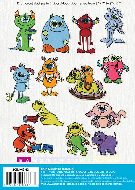 This is a collection of 12 little monsters that are sure to make any kids eyes light up when they see them. Each monster is created using felt applique and comes in two different sizes. You can further embellish the shirt with different types of trims. We used pom-pom trim and decorative ribbon. You can also glue googly eyes on the monster for even more fun. These designs look great on shirts for both little boys and girls.