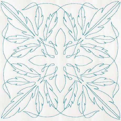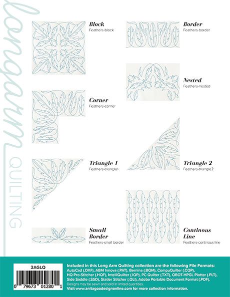 Designs for the longarm quilting machine featuring a feather motif, including blocks, borders, corners, and triangles. Each design is included in several different design file formats to accommodate the most popular longarm machine brands, including: